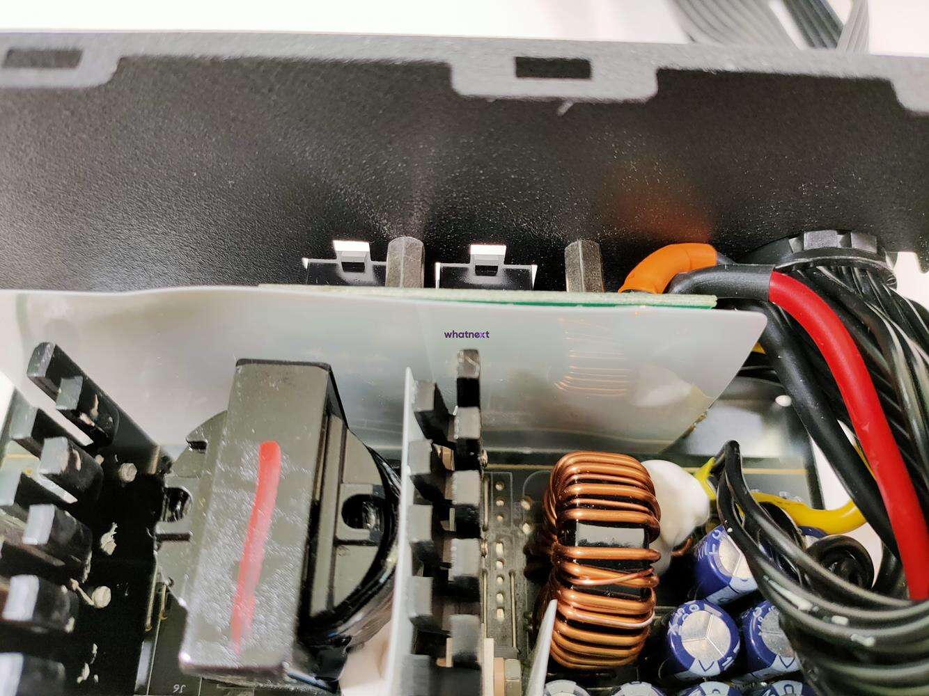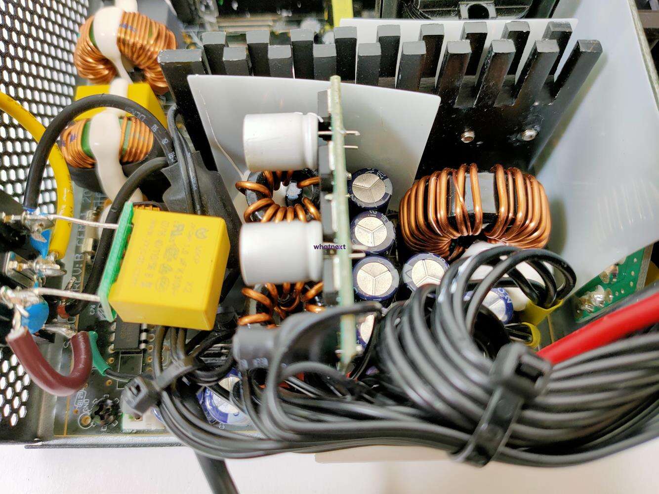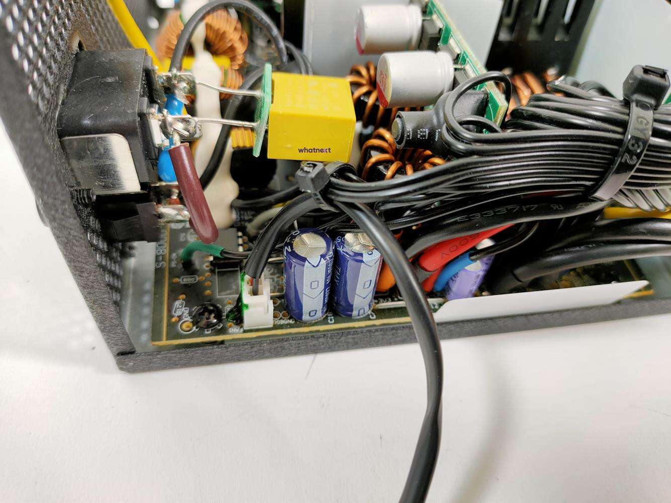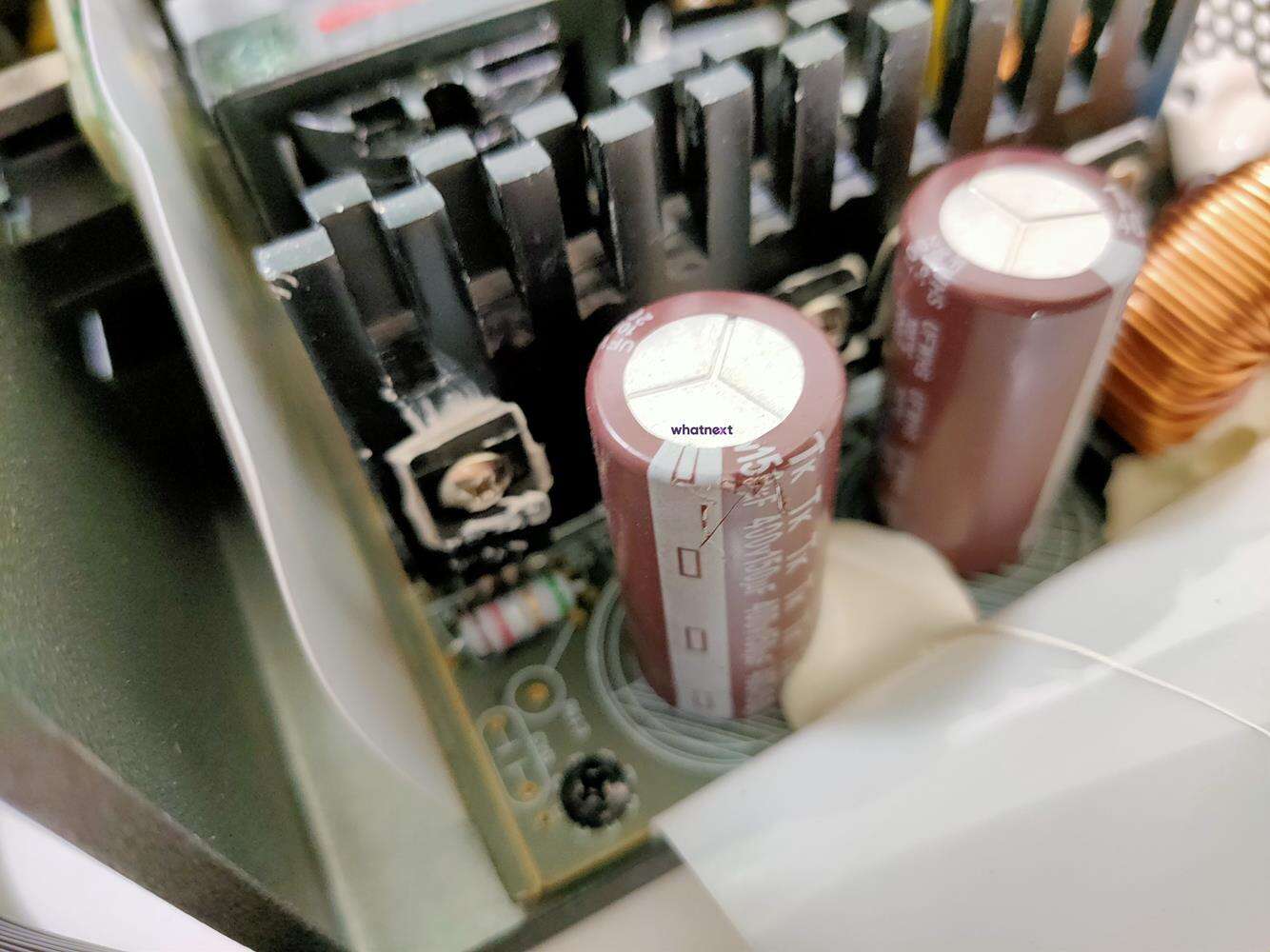 W środku w oczy rzucają się dwa główne kondensatory o parametrach 400 V i 150 uF. Maksymalna temperatura pracy to 105°C. Samo wnętrze wykonane jest dobrze, nie mam tutaj większych uwag. Producent pomyślał o aktywnym PFC czy przetwornicy DC-DC. Całość jest też zgodna ze standardem ATX 12V v2.4. Warto też pamiętać o zastosowaniu sześciu zabezpieczeń: zabezpieczenie przed zwarciem (SCP), zabezpieczenie nadnapięciowe (OVP), zabezpieczenie podnapięciowe (UVP), zabezpieczenie przed nadmierną temperaturą (OTP), zabezpieczenie nadmocowe (OPP) i SIP (zabezpieczenie przed nieprzewidzianymi prądami udarowymi).