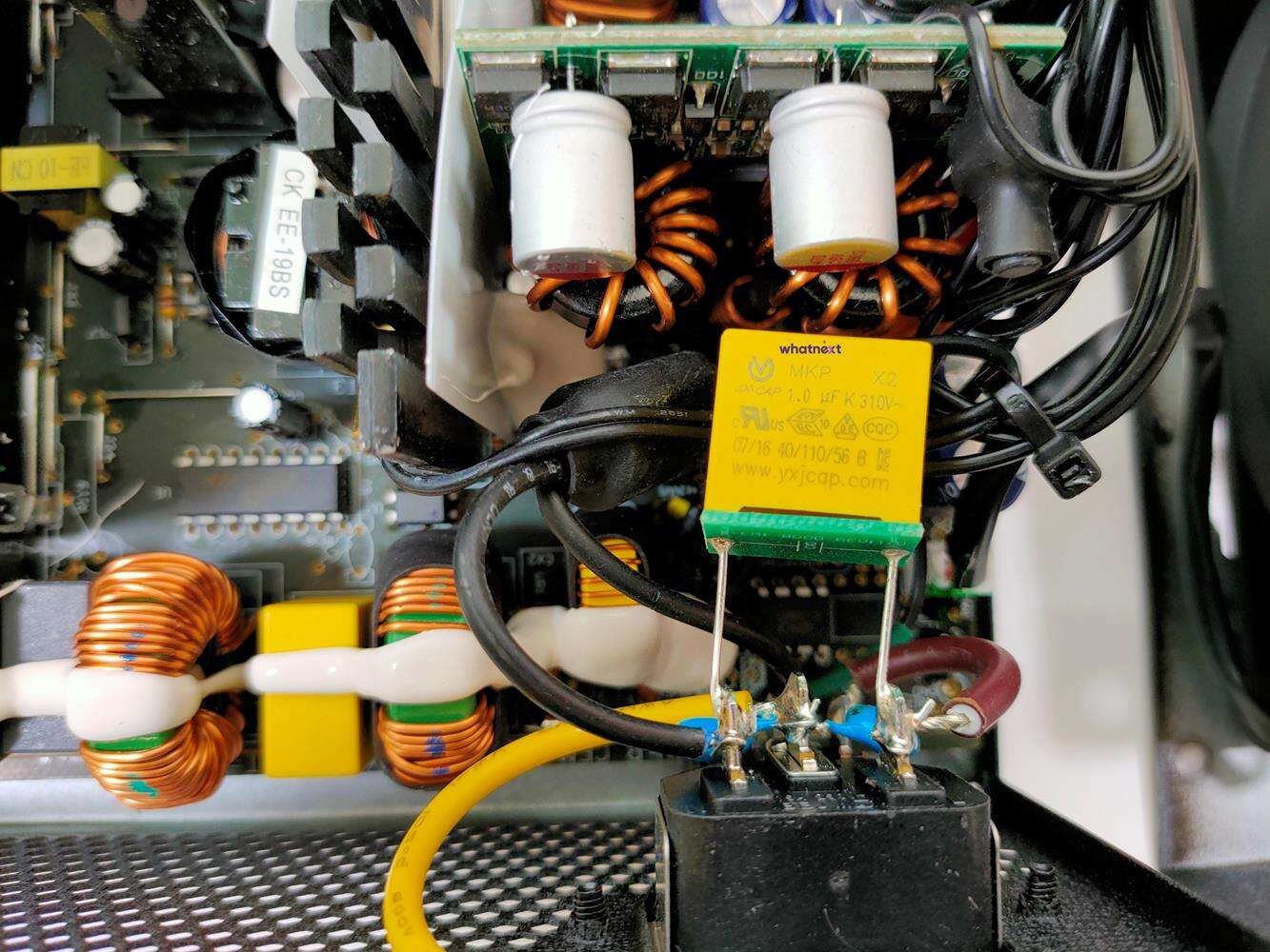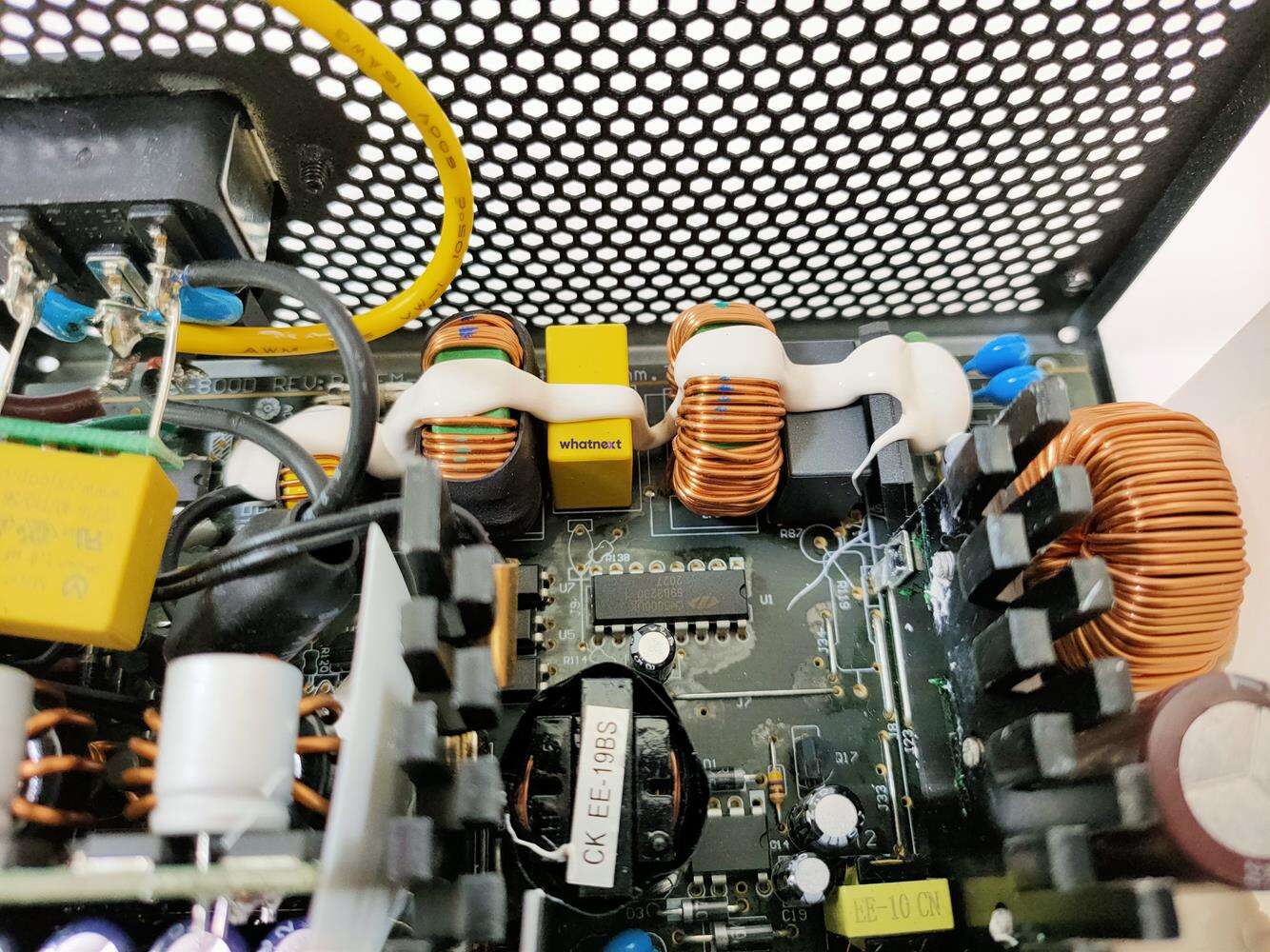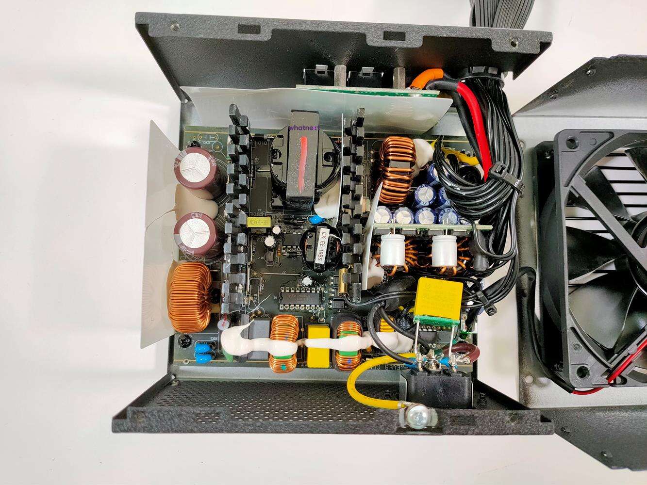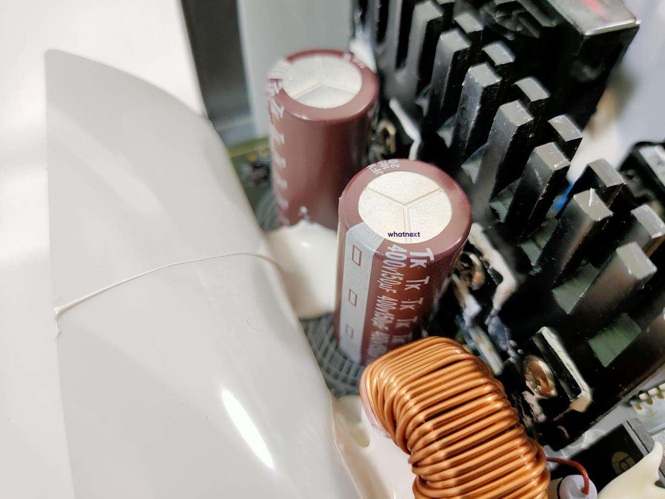 W środku w oczy rzucają się dwa główne kondensatory o parametrach 400 V i 150 uF. Maksymalna temperatura pracy to 105°C. Samo wnętrze wykonane jest dobrze, nie mam tutaj większych uwag. Producent pomyślał o aktywnym PFC czy przetwornicy DC-DC. Całość jest też zgodna ze standardem ATX 12V v2.4. Warto też pamiętać o zastosowaniu sześciu zabezpieczeń: zabezpieczenie przed zwarciem (SCP), zabezpieczenie nadnapięciowe (OVP), zabezpieczenie podnapięciowe (UVP), zabezpieczenie przed nadmierną temperaturą (OTP), zabezpieczenie nadmocowe (OPP) i SIP (zabezpieczenie przed nieprzewidzianymi prądami udarowymi).