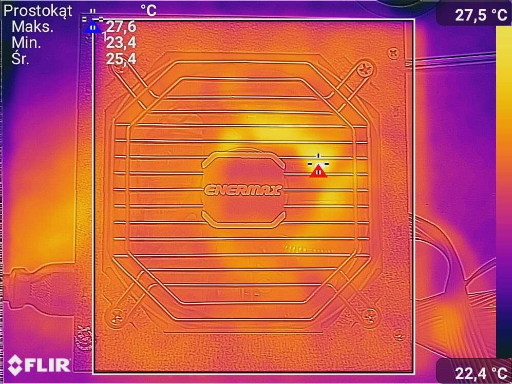 Spoczynek polegał tylko na wyświetlaniu pulpitu. Obciążenie to FurMark + Cinebench R23. W testach temperatury wykorzystałem moduł termowizyjny smartfonu CAT S61.
