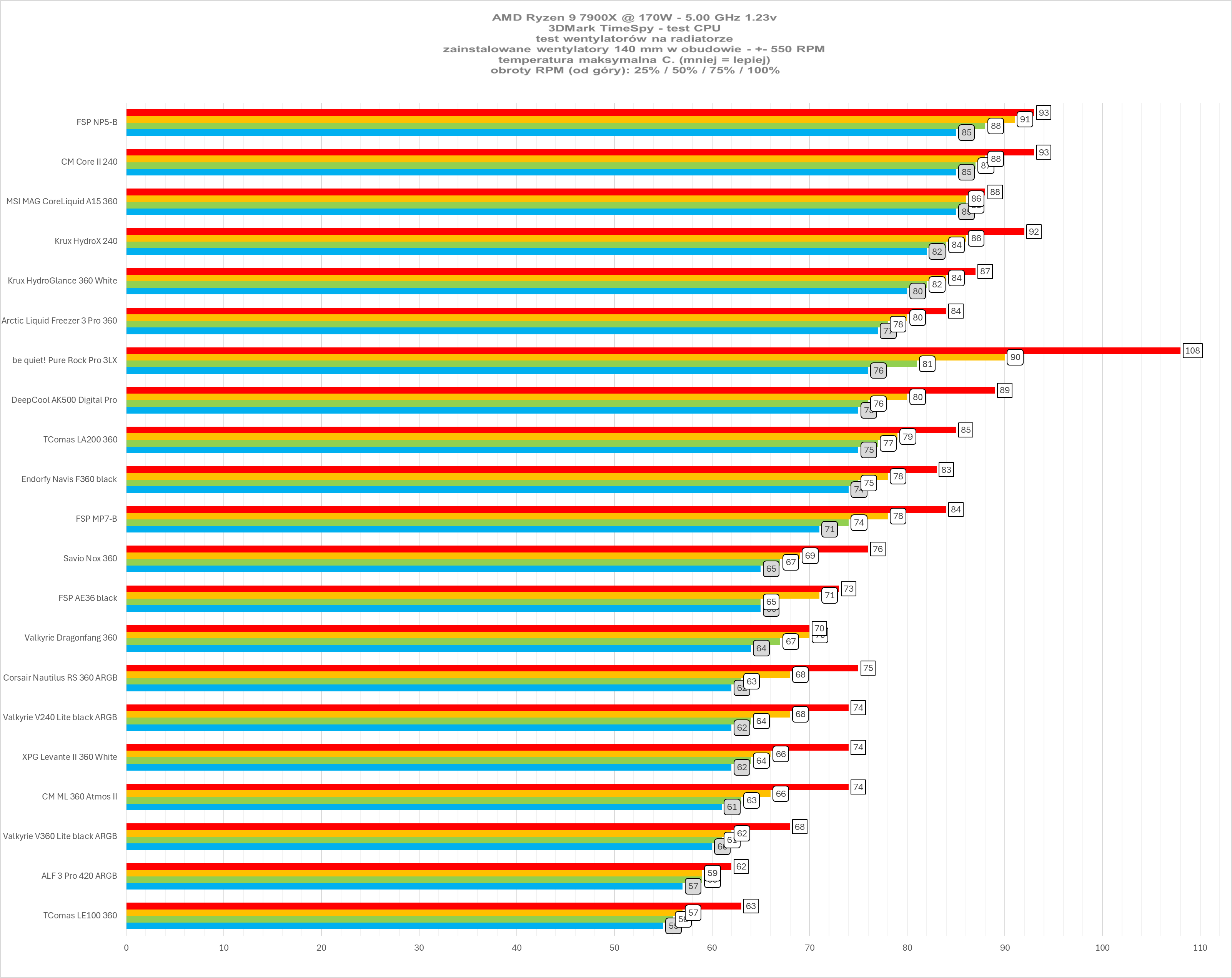 testy blokopompki – sprawdzenie wydajności przy 25, 50 i 75% obrotów RPM (wentylatory na radiatorze: 100% RPM / Ryzen 9 7900X ~ 170W / delta temperatury)
