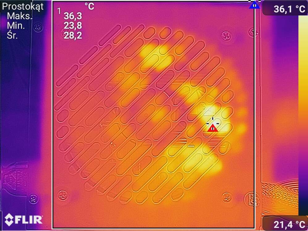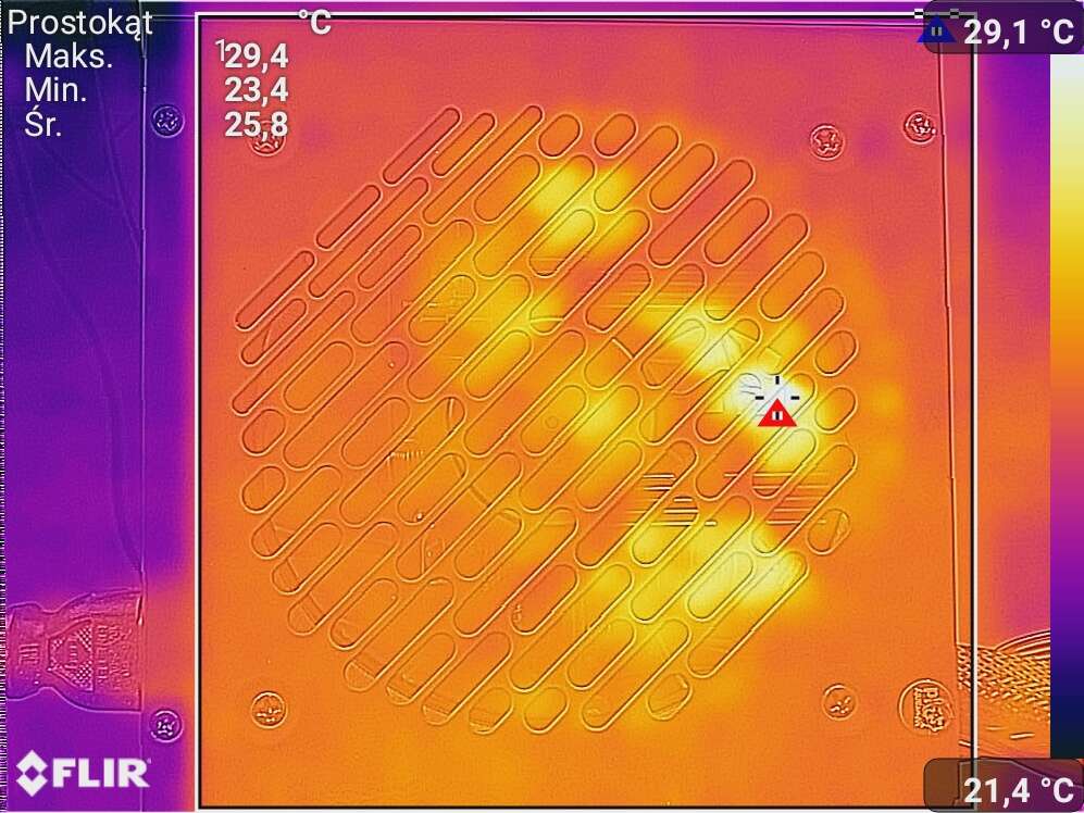 W testach temperatury wykorzystałem moduł termowizyjny smartfonu CAT S61. Zasilacz wypadł bardzo dobrze. Jedynie linia +12V notuje duży skok pod obciążeniem, ale wszystko w granicach normy. Temperatury podczas pracy są również niskie a zasilacz pozostaje cichy, z pewnością cichszy od grafiki czy chłodzenia procesora. Sprawność również oceniam pozytywnie. Zasilacz ma odznaczenie 80 Plus 230V EU. Dla obciążenia 10% sprawność wynosi 79%, dla 20% – 84,24%, 50% – 86,05%, a dla 100% – 83,38%.