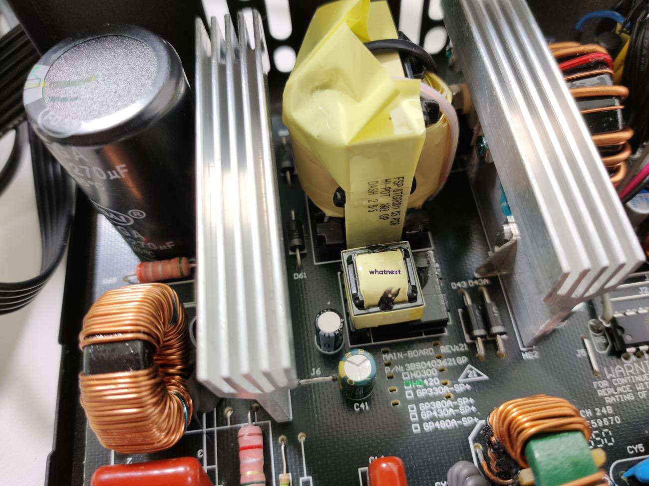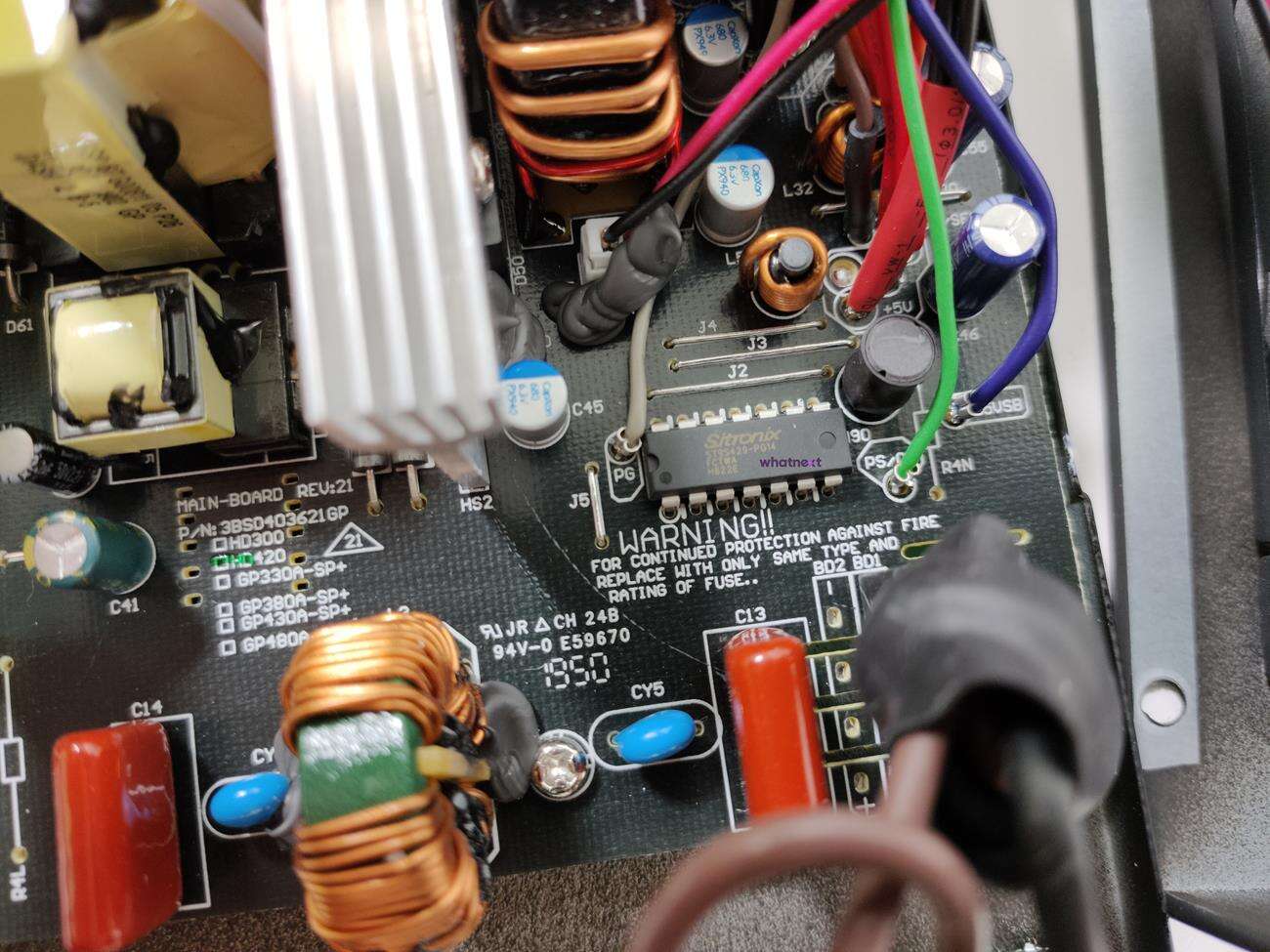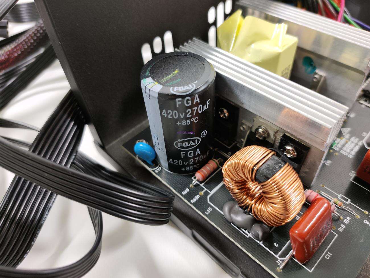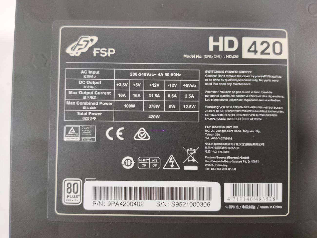 Za chłodzenie odpowiada 120 mm wentylator Yate Loon D12SH-12. Producent deklaruje jego cichą pracę. Największy kondensator jest produkcji FOAI i ma parametry 420 V, 270 uF oraz może pracować w temperaturze do 85°C. Mniejsze kondensatory są produkcji AiSHi. FSP HD 420W ma oczywiście aktywne PFC. Zastosowanych zabezpieczeń jest aż 6, co jest rzadko spotykane w takich zasilaczach: OVP (zabezpieczenie przed zbyt wysokim napięciem na wyjściu), SCP (zabezpieczenie przeciwzwarciowe), OCP (zabezpieczenie przed przeciążeniem stabilizatora), OTP (zabezpieczenie przed przegrzaniem zasilacza), UVP (zabezpieczenie przed zbyt niskim napięciem na wyjściu), OPP (zabezpieczenie przed przeciążeniem).
