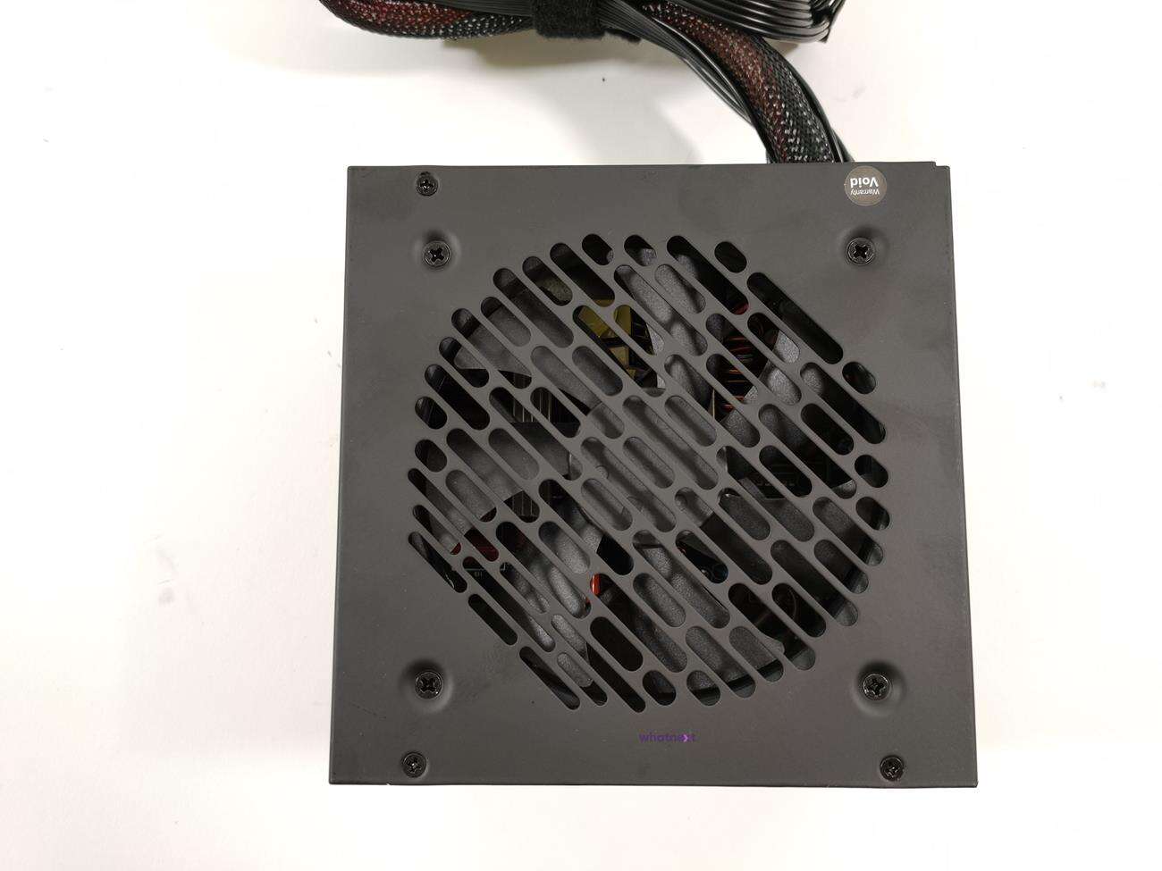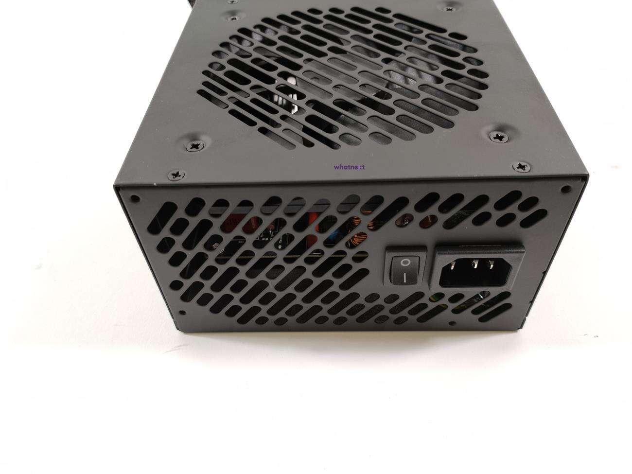 Zasilacz wygląda dobrze – jest po prostu cały czarny. Na stronie producent znajdziemy jeszcze jego białą wersję, która również jest ciekawą opcją. Z tyłu i na grillu znajdują się nietypowe otwory, które mają zapewnić lepszy przepływ powietrza i chłodzenie niż te w kształcie plastrów miodu. Tabliczka znamionowa znajduje się na spodzie. Linia + 12V może oddać 31,5 A (378 W), linia +5 V i + 3,3 V po 16 A (łącznie 100 W). Łączna moc zasilacza to 420 W. Co ciekawe, napięcia wejściowe wynoszą od 200 do 240 Vac, czyli inaczej niż znajdziecie w opisie producenta.