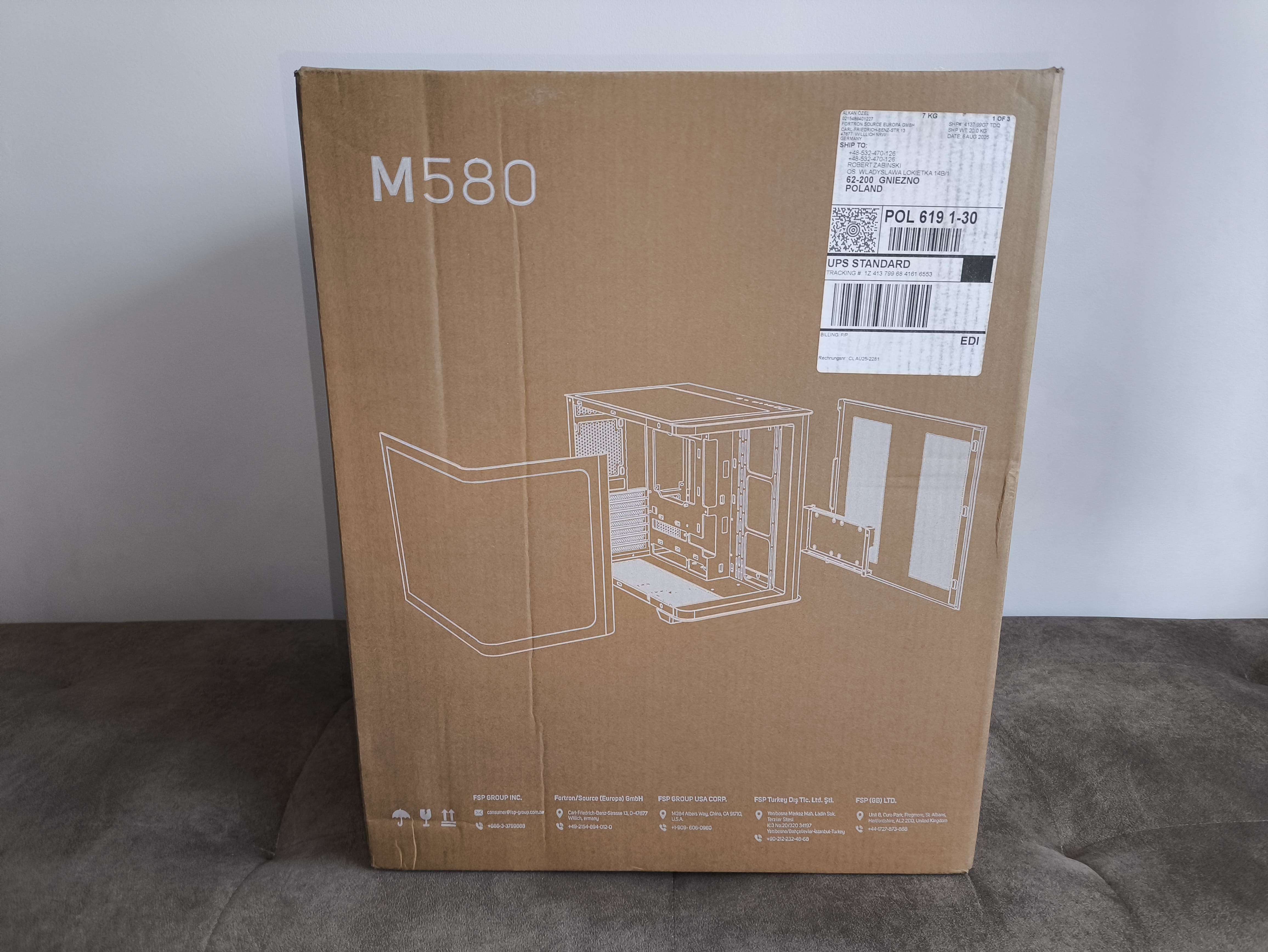 Obudowa FSP M580 dostarczana jest w klasycznym kartonowym opakowaniu w kolorze brązowym z białymi nadrukami. Taki sposób pakowania pozwala obniżyć koszty, a jednocześnie wyróżnić produkt na tle typowych brązowych i czarnych pudeł dostępnych na rynku. Na froncie znalazła się grafika przedstawiająca samą obudowę oraz oznaczenie modelu, natomiast na tylnej ściance umieszczono prosty, schematyczny rysunek konstrukcji.
