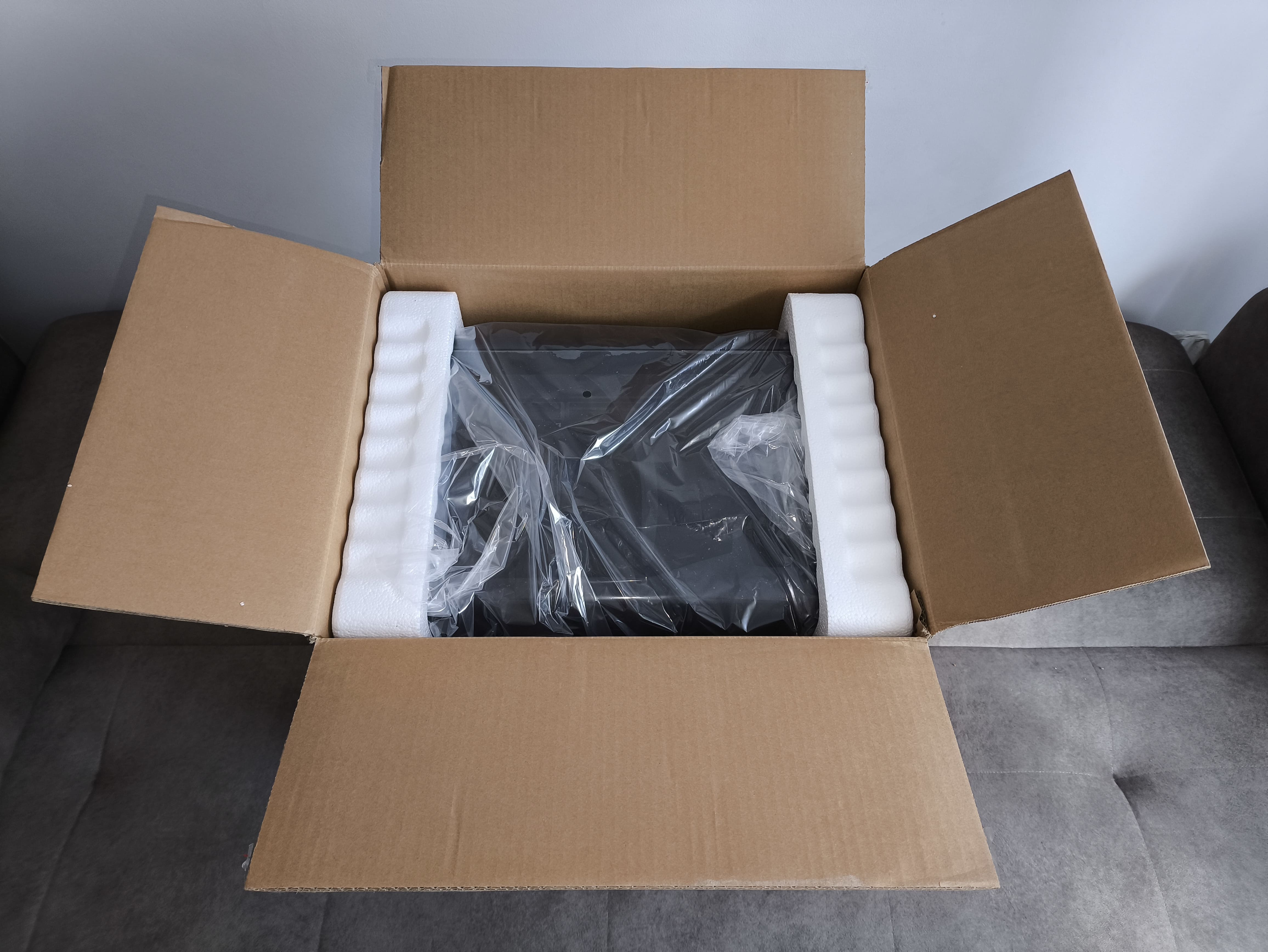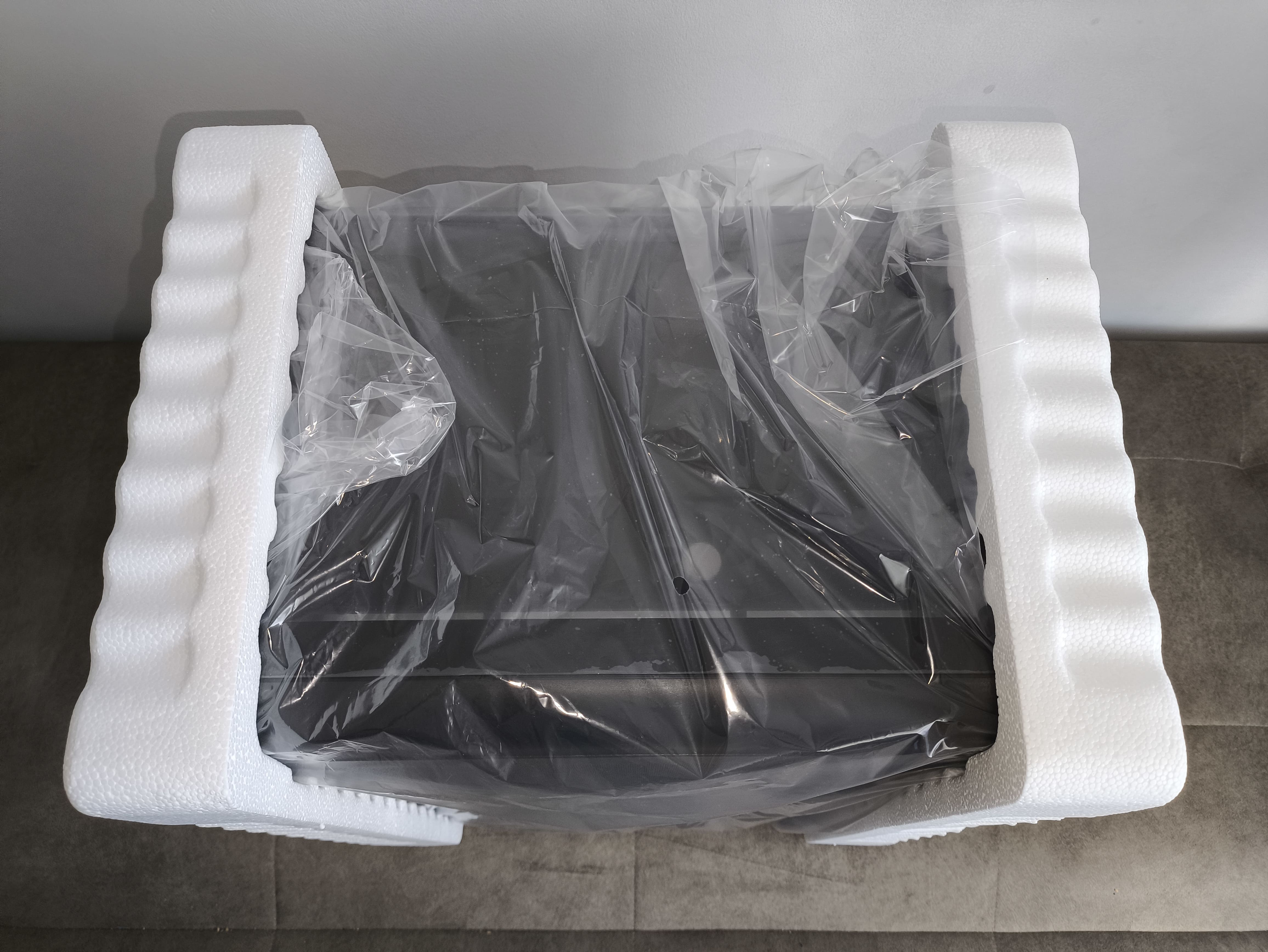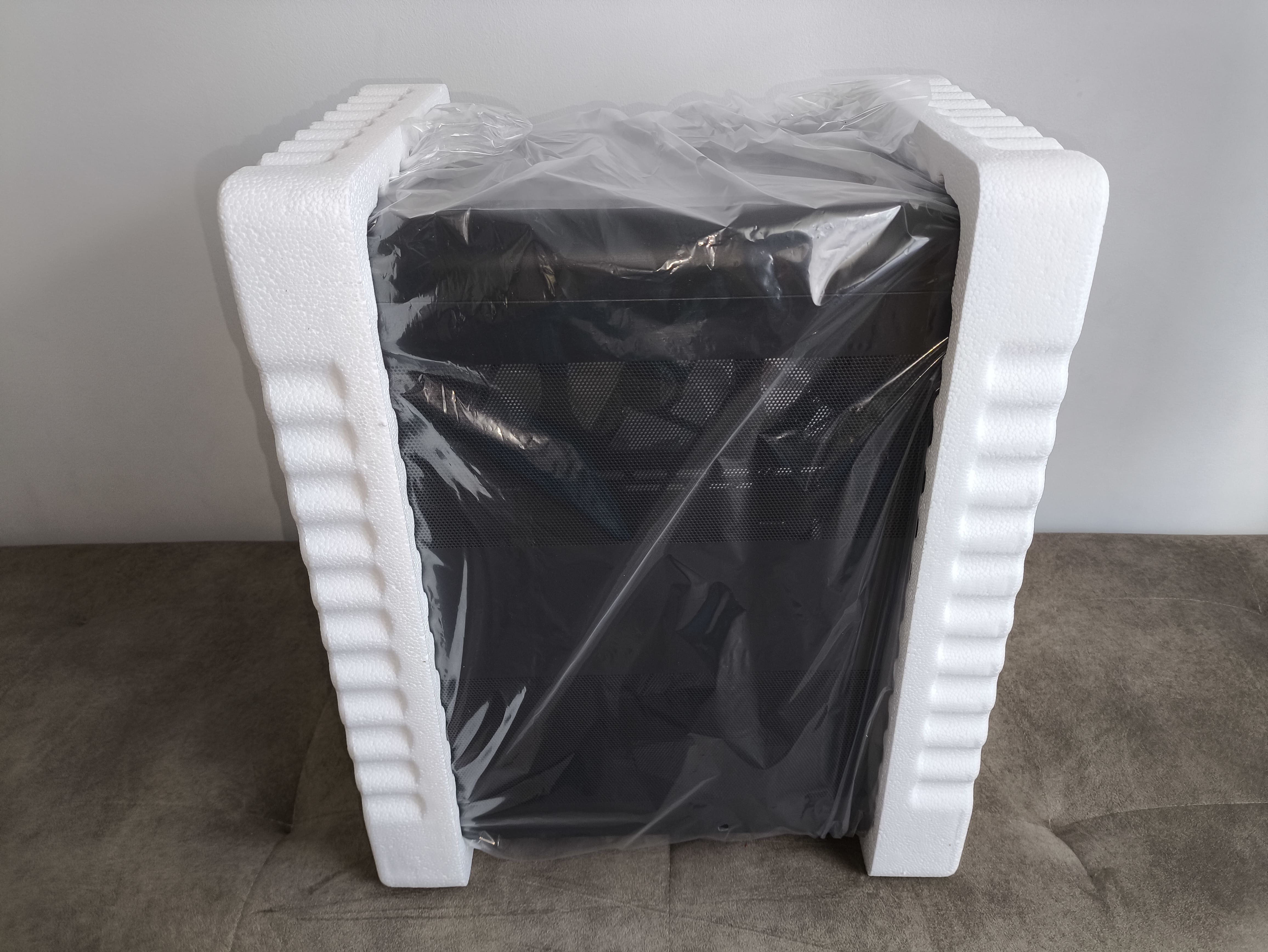 Wewnątrz obudowa zabezpieczona jest dwoma dość cienkimi elementami styropianowymi. Co ciekawe, nie przylegają one idealnie, a śruby pozostawiły w nich niewielkie wgłębienia, co sugeruje, że nie zostały zaprojektowane dokładnie pod ten model. Mimo to nasz egzemplarz dotarł w nienaruszonym stanie. Dodatkowo producent zabezpieczył obudowę foliowym workiem chroniącym przed zarysowaniami i odciskami palców.