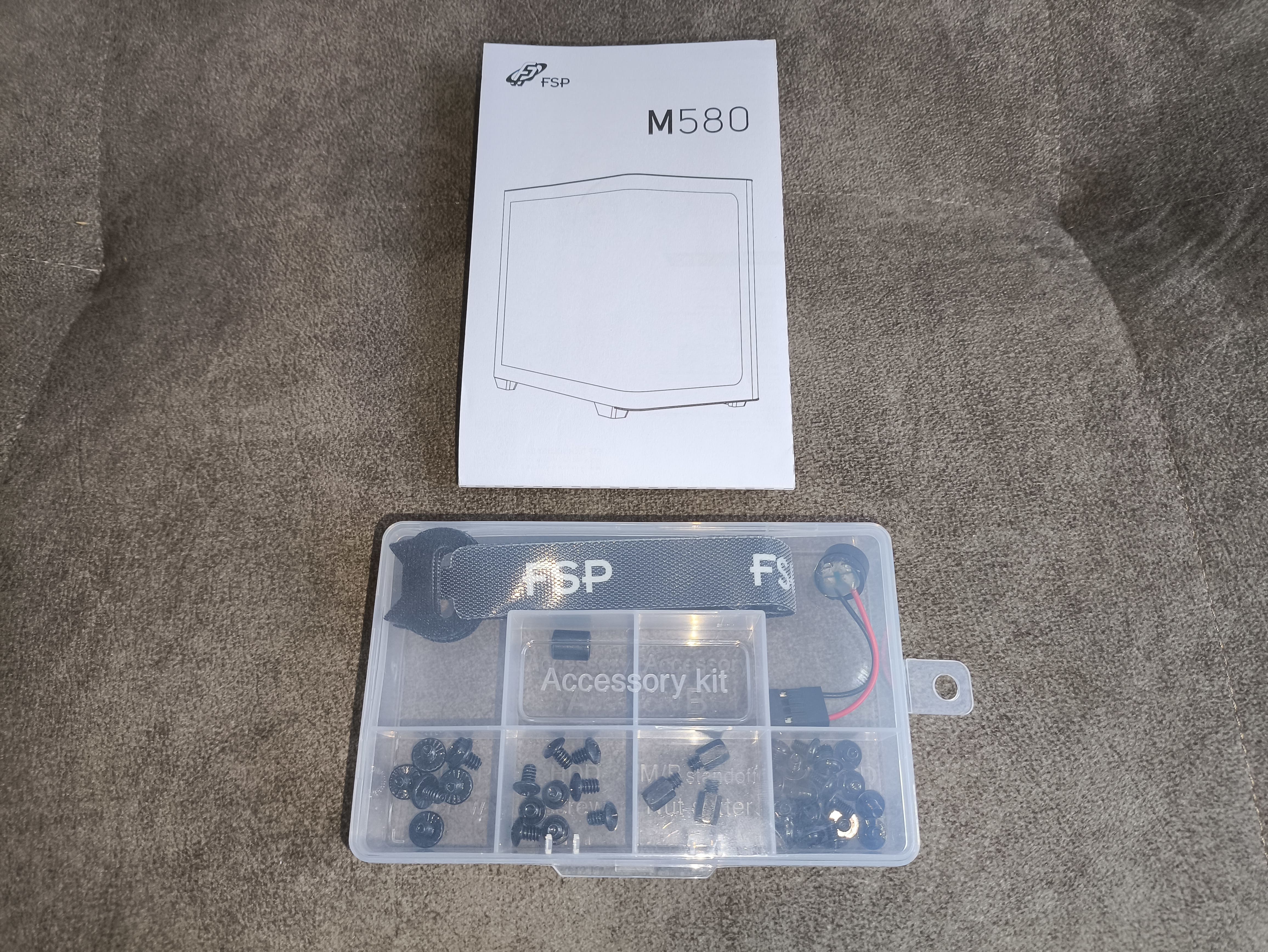 W zestawie z M580 otrzymujemy niewielkie plastikowe pudełko z kompletem śrubek montażowych oraz trzema opaskami rzepowymi do uporządkowania okablowania. FSP dorzuca także głośniczek systemowy, którego obecnie używa się już bardzo rzadko.