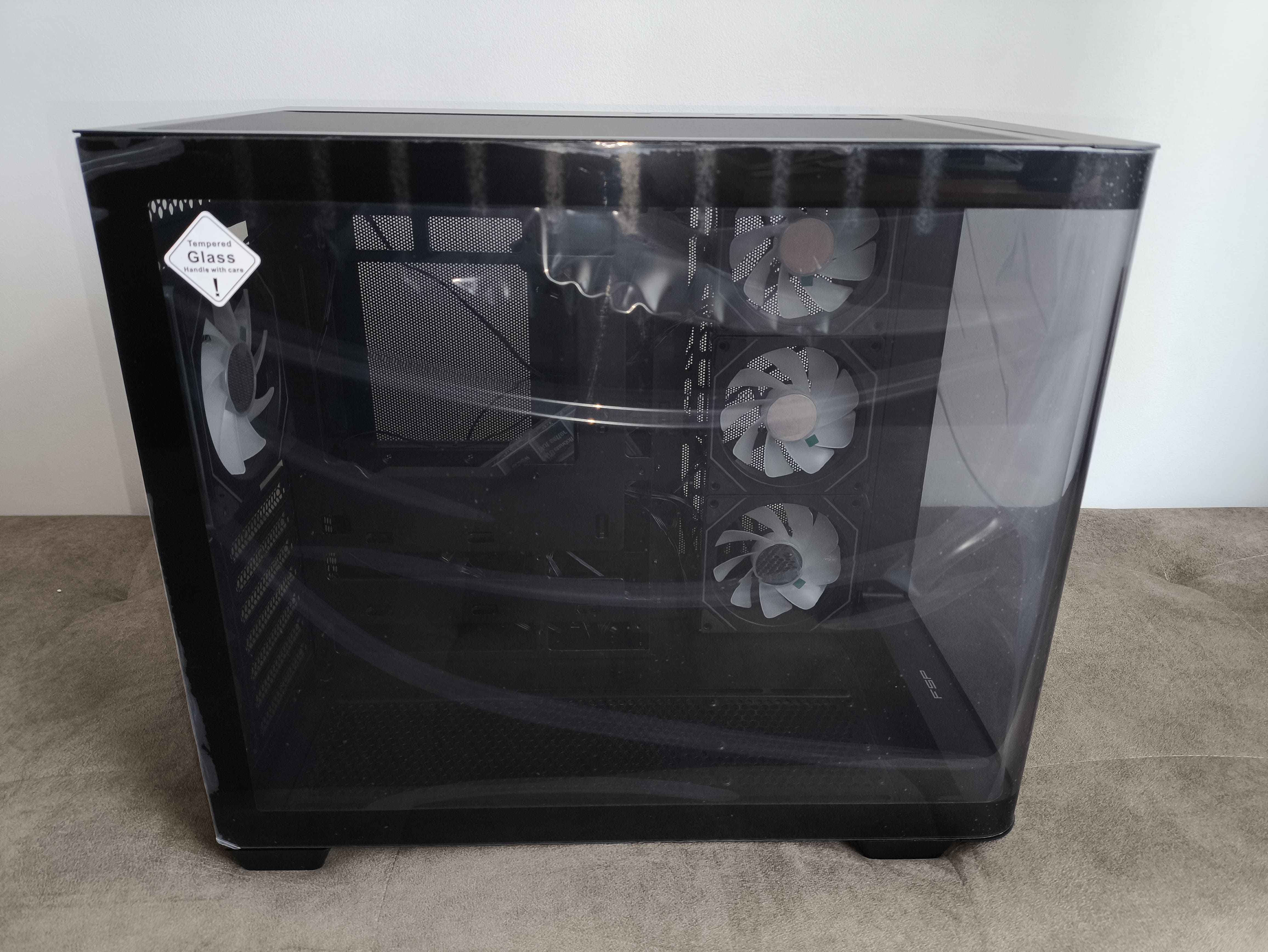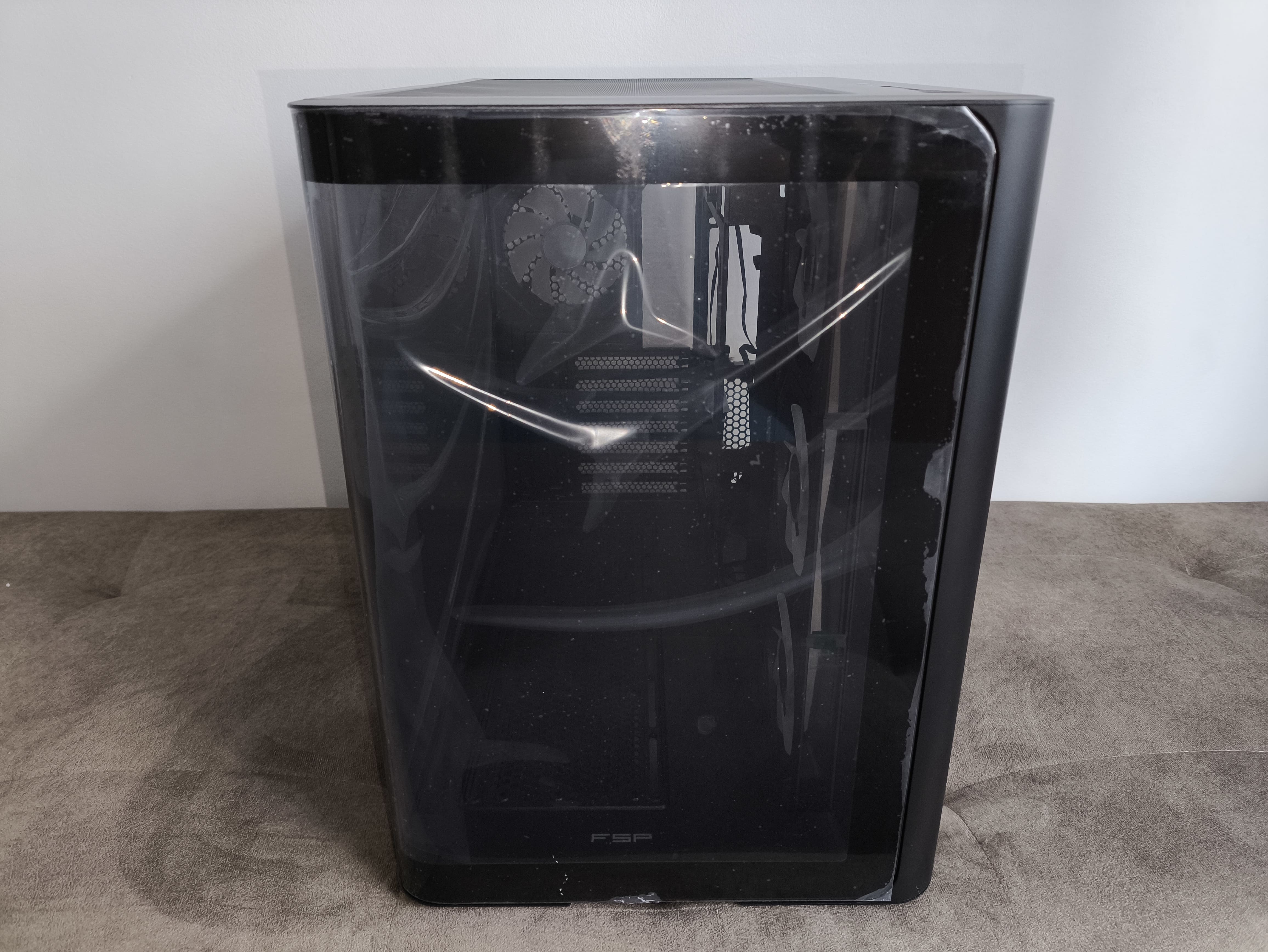 Front obudowy jest prosty, z prawą stroną lekko zakrzywioną, symetrycznie do szklanego panelu. Między szkłem a obudową umieszczono subtelną taśmę ARGB, która dodaje całości atrakcyjnego wyglądu. Panel szklany jest lekko przyciemniony, ale wciąż wystarczająco przejrzysty, by wyeksponować podzespoły.