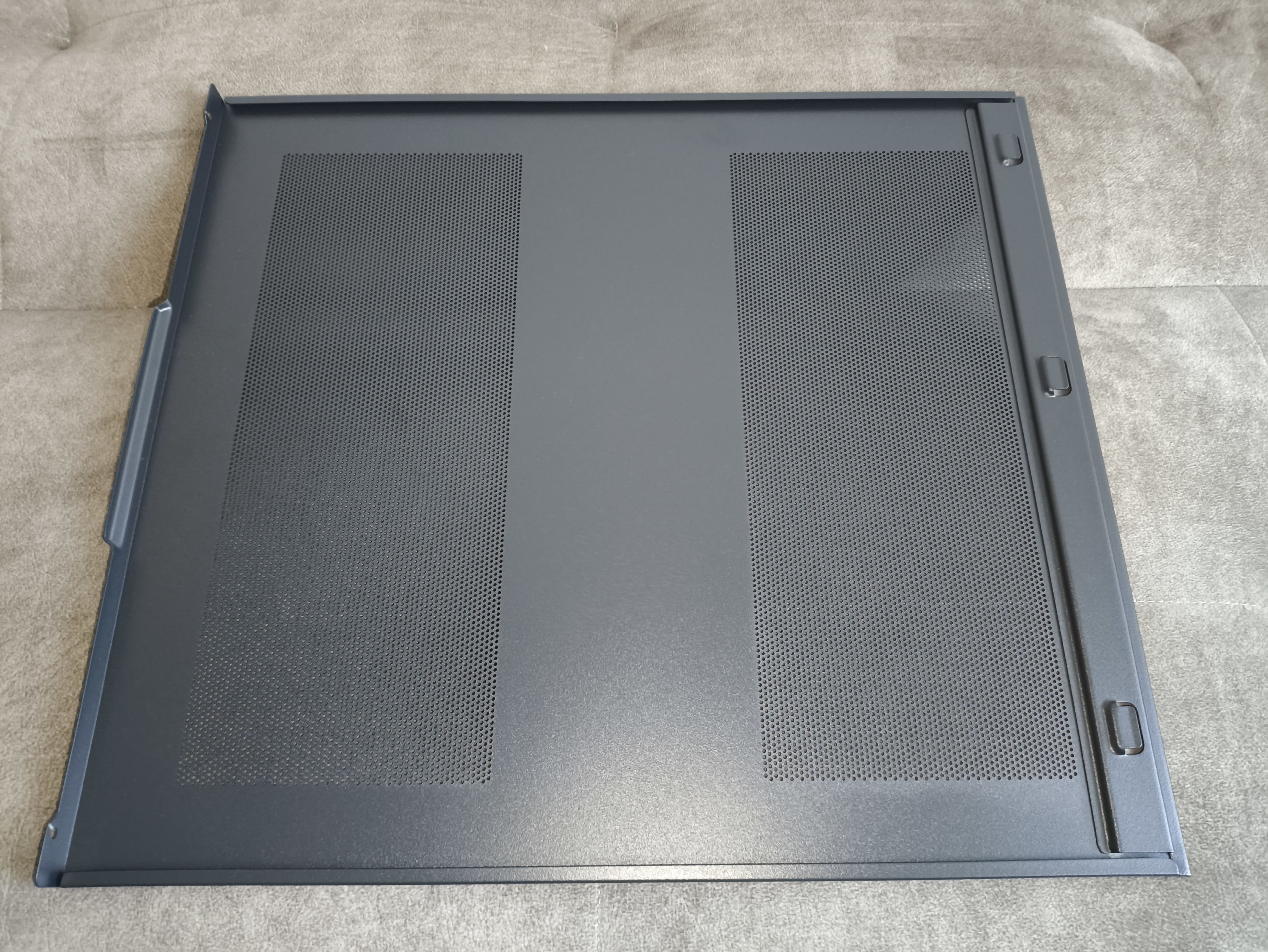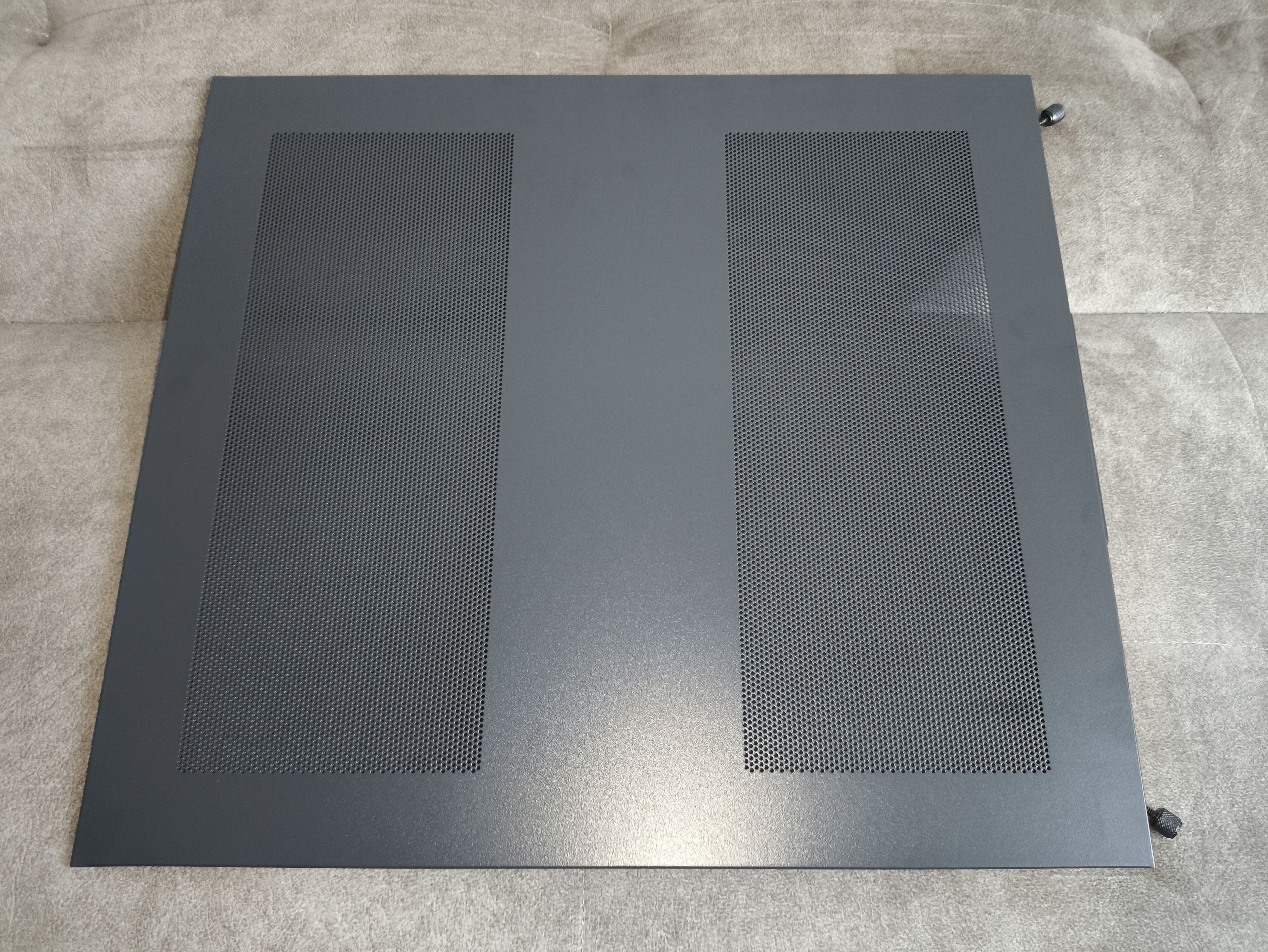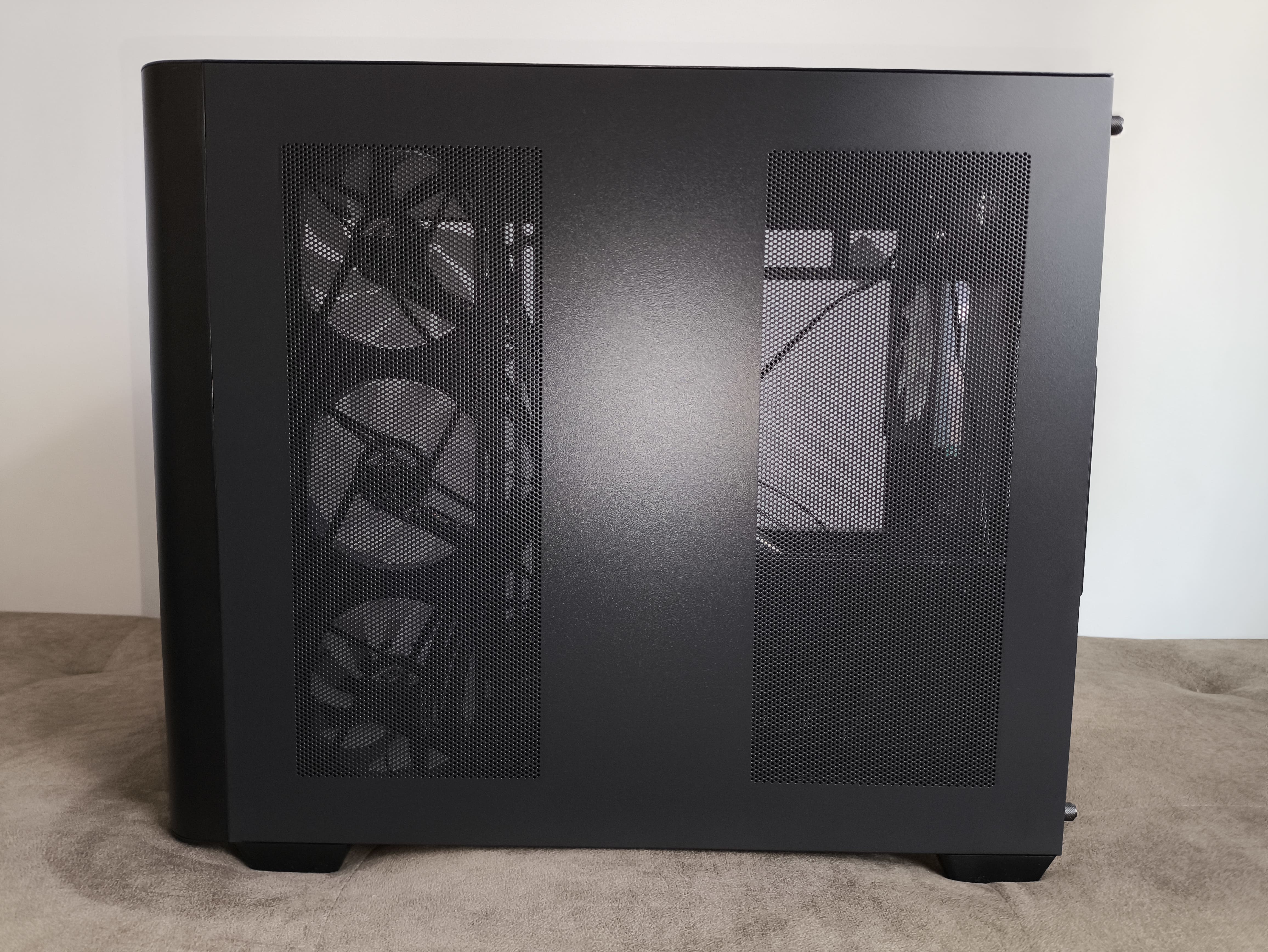 Druga strona obudowy wykonana jest z gładkiej blachy i posiada dwie duże perforowane strefy (o wymiarach 120 × 302 mm), które doprowadzają świeże powietrze do bocznych wentylatorów oraz zasilacza. Niestety, oba otwory pozbawiono magnetycznych filtrów przeciwkurzowych, co moim zdaniem jest sporym niedopatrzeniem.