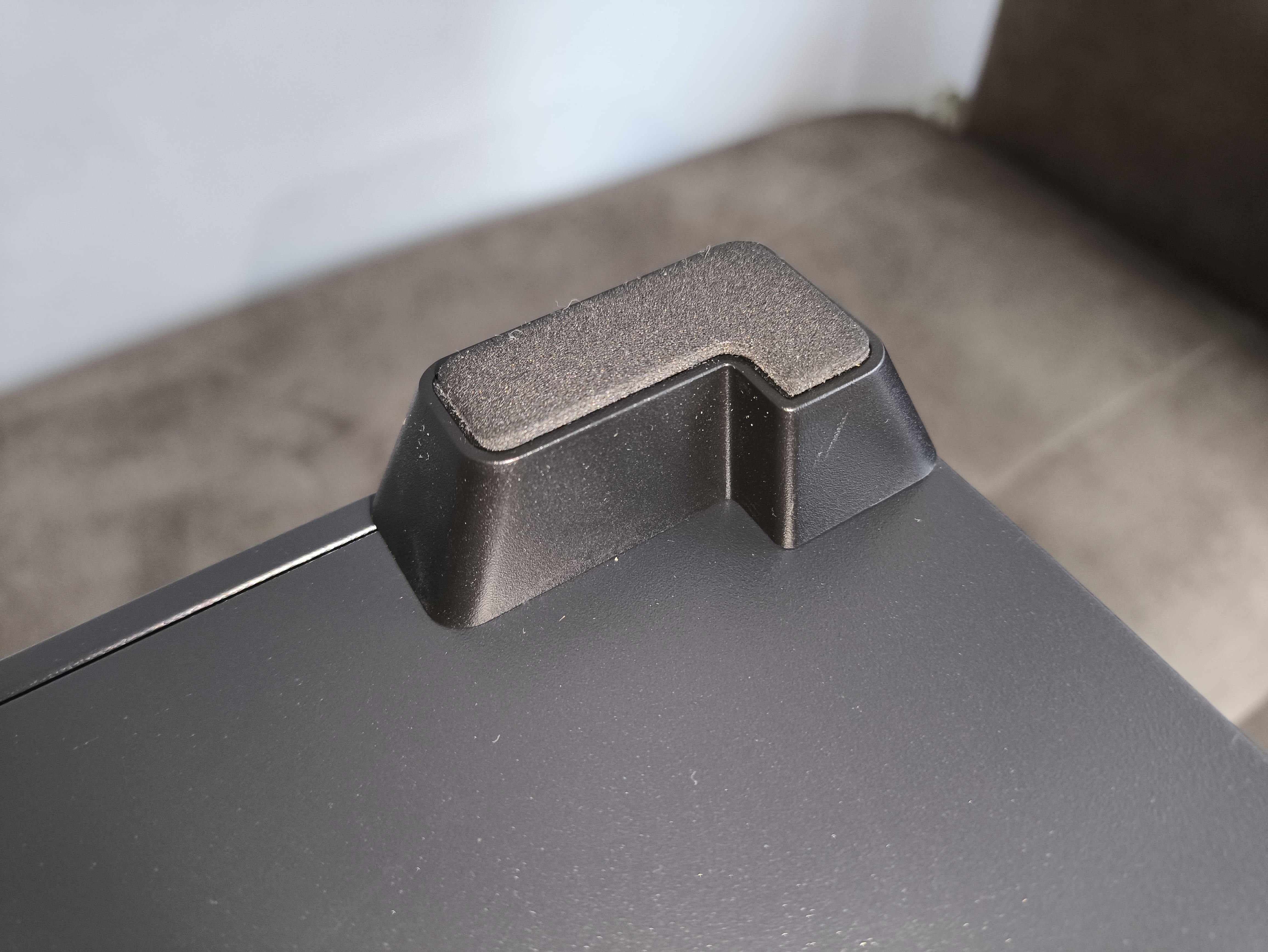 Obudowa spoczywa na czterech dużych, stabilnych nóżkach w kształcie litery L, które pewnie podtrzymują całą konstrukcję i delikatnie unoszą ją nad powierzchnią, co poprawia przepływ powietrza przez dolny filtr. Gumowe podstawki zapobiegają ślizganiu się obudowy po biurku i chronią powierzchnię przed zarysowaniami.