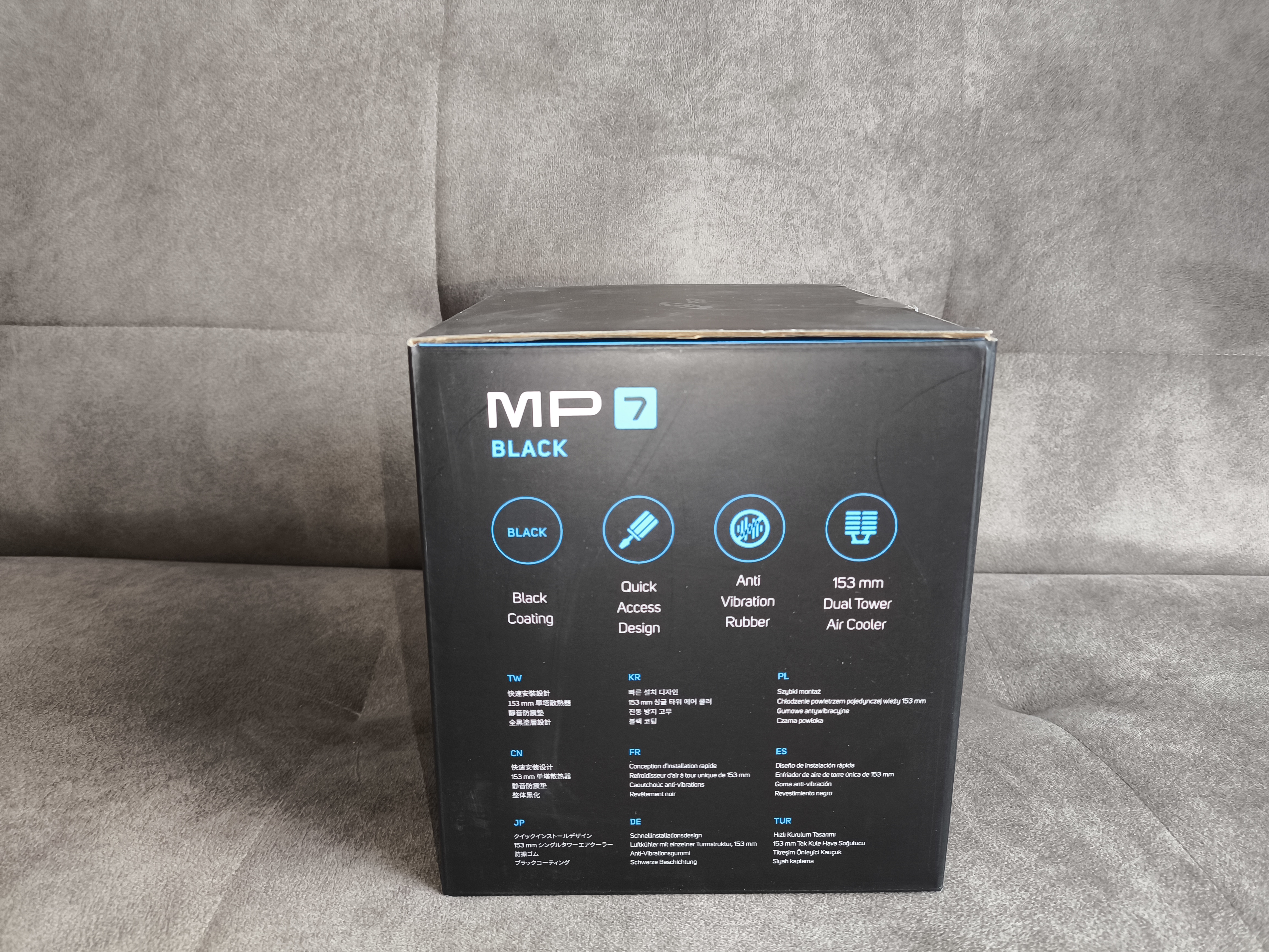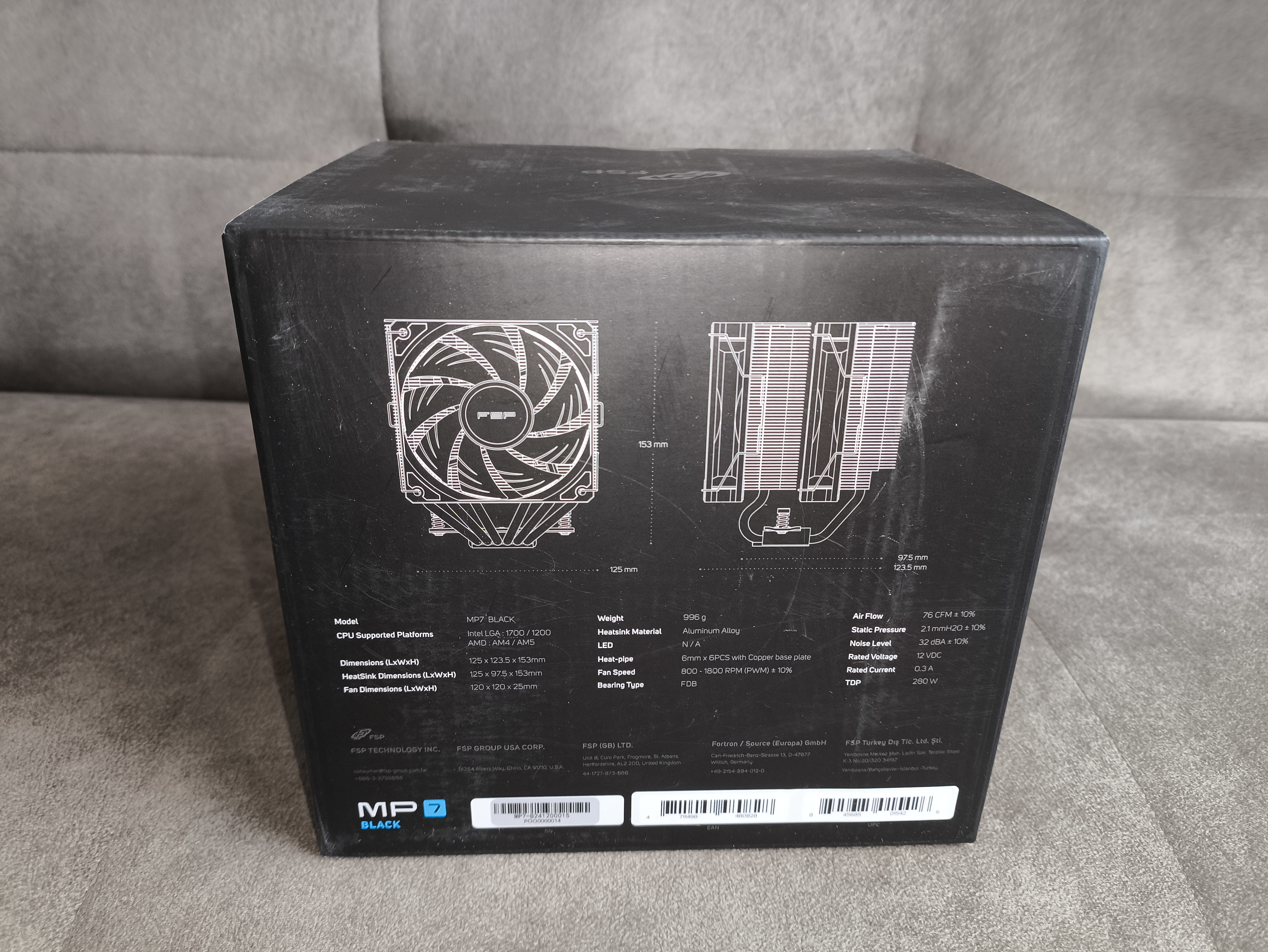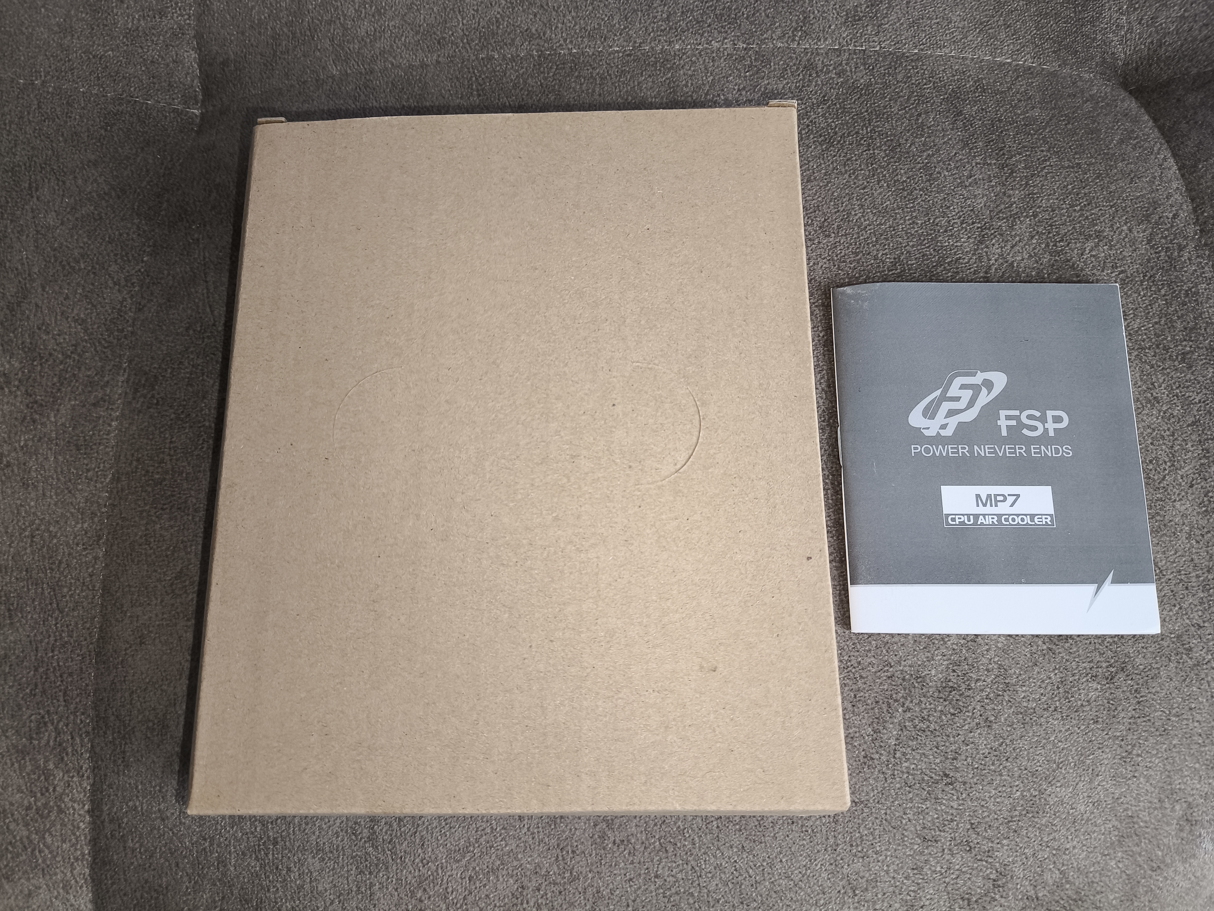 Opakowanie chłodzenia FSP MP7 utrzymane jest w klasycznej formie kartonowego pudełka, na którego froncie producent wyeksponował samą konstrukcję – górną płytę radiatora wykonaną ze szczotkowanego, czarnego aluminium z charakterystycznymi, kanciastymi akcentami wizualnymi.