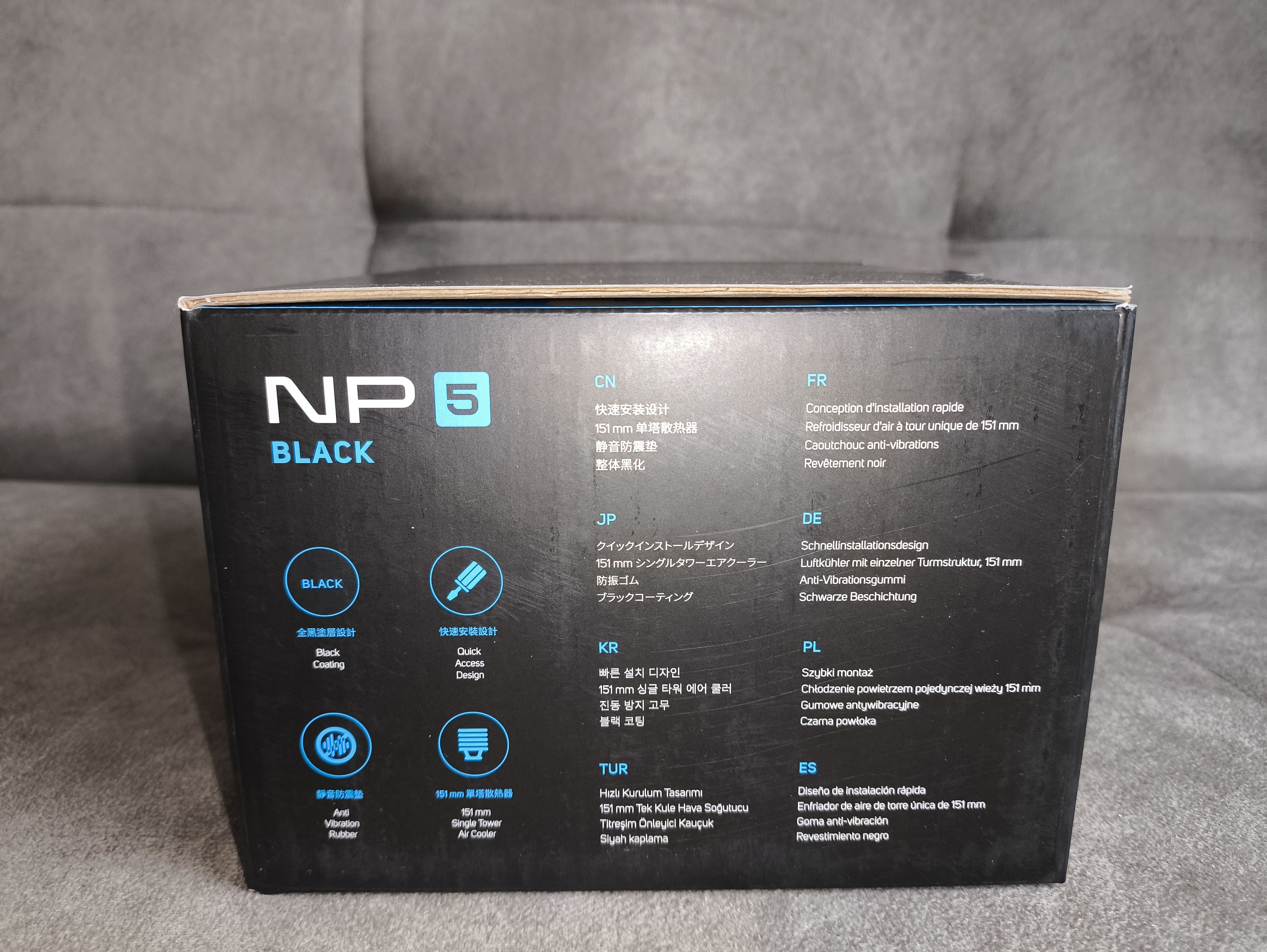 Opakowanie FSP NP5-B utrzymane jest w klasycznej formie czarnego kartonu. Na froncie producent umieścił schematyczny rysunek samego chłodzenia, wraz z widokiem wentylatora i radiatora, co pozwala od razu zorientować się w konstrukcji produktu. Lewa strona pudełka prezentuje najważniejsze cechy modelu, w tym jego wymiary – wysokość 151 mm oraz standardowy profil radiatora. Tył opakowania zawiera pełną specyfikację techniczną wraz z rysunkiem technicznym, przedstawiającym zarówno radiator, jak i wentylator.