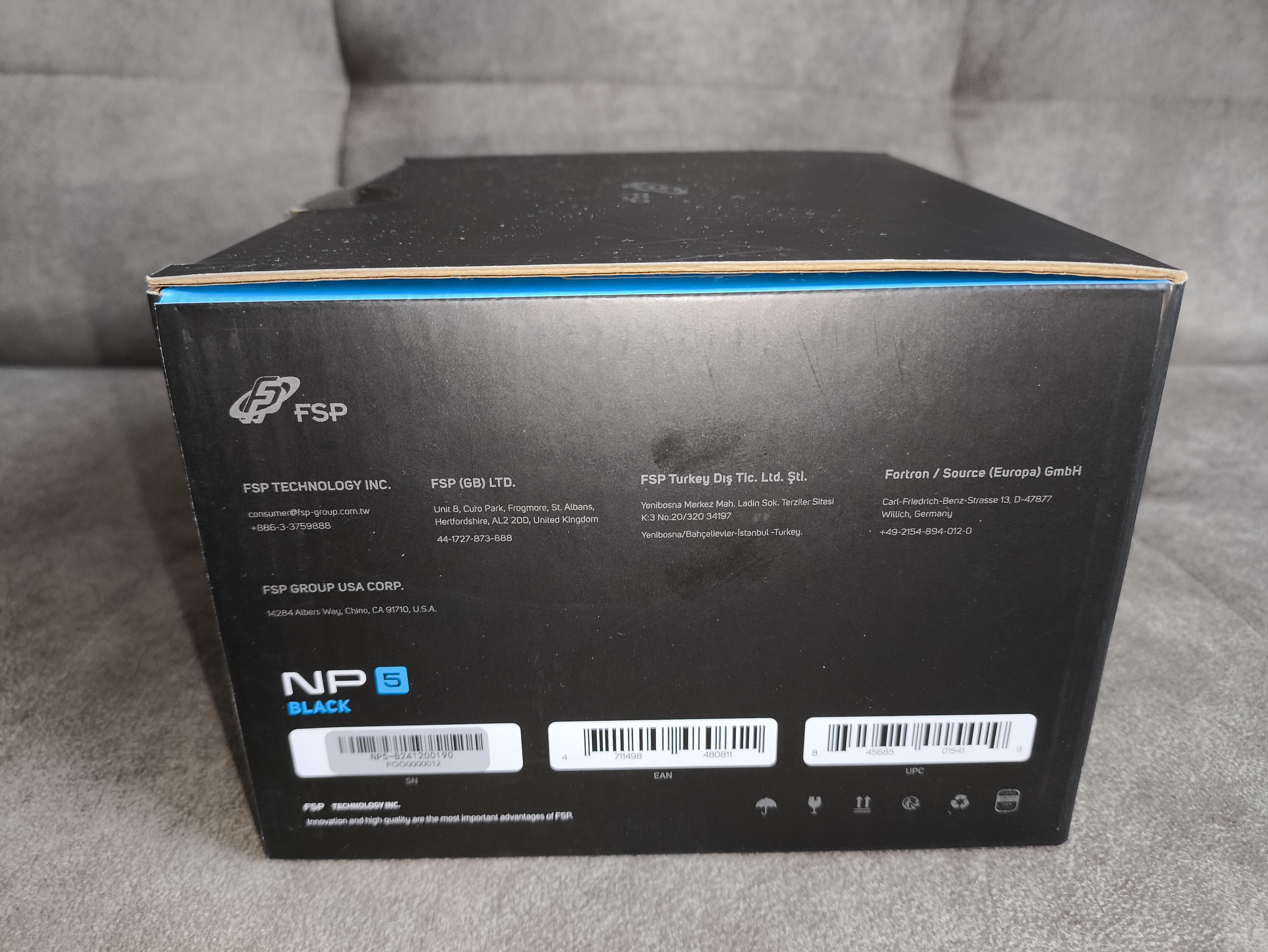 Prawy bok kartonu zawiera jedynie odnośnik do oficjalnej strony internetowej FSP, gdzie znaleźć można więcej informacji w kilku językach. Górna część opakowania została utrzymana minimalistycznie – znajduje się tam wyłącznie logo producenta.