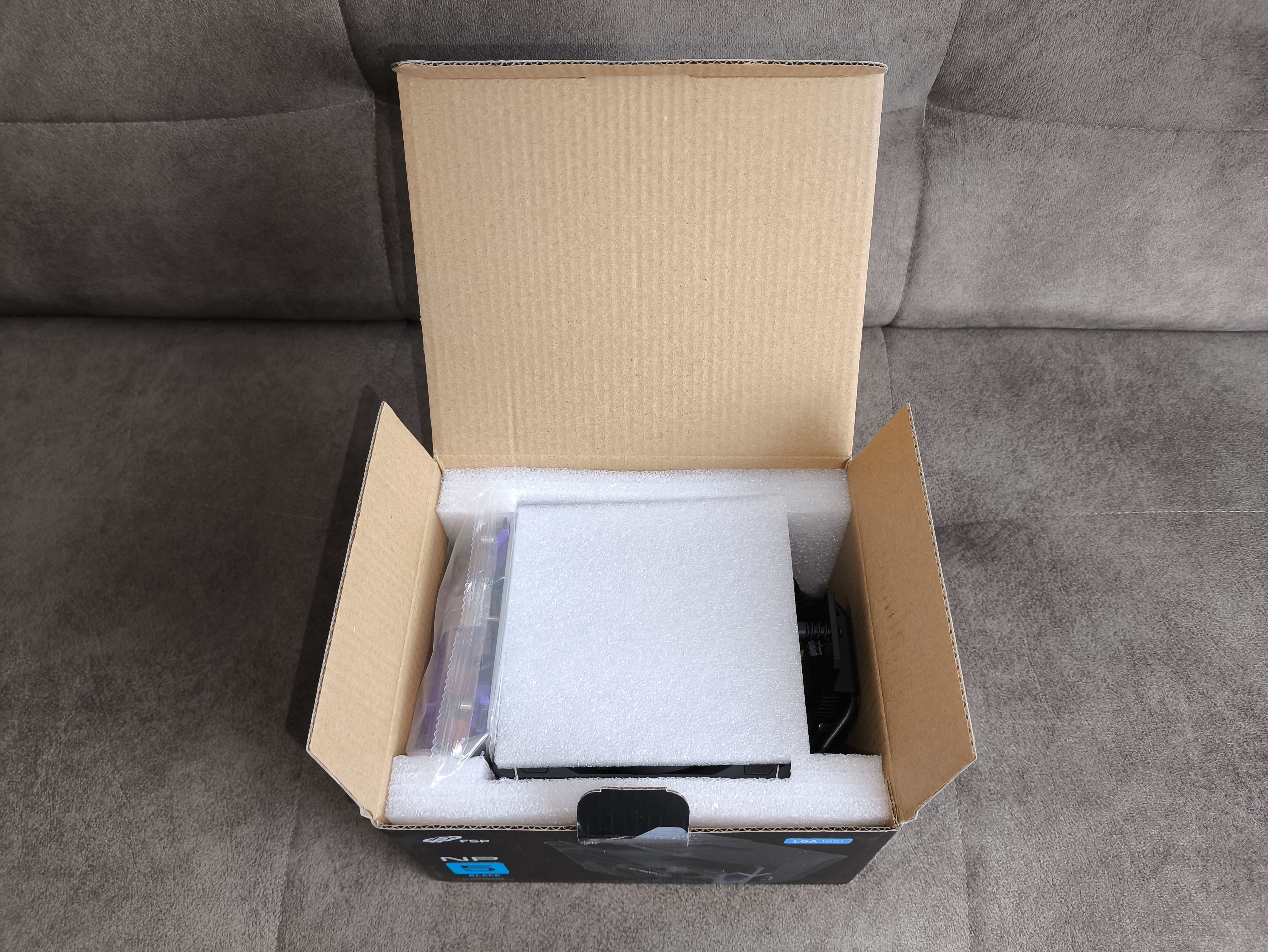 Wnętrze opakowania zostało dobrze zabezpieczone – producent postawił na solidne piankowe wypełnienie, w którym umieszczono samo chłodzenie. Montażowy zestaw akcesoriów znalazł się w osobnym, mniejszym pudełku spoczywającym na górze. Choć ilość pianki nie jest przesadna, to jednak zapewnia odpowiednią ochronę transportową, a przy okazji sprawia, że unboxing wypada zdecydowanie bardziej elegancko niż w przypadku tańszych, kartonowych przegródek.