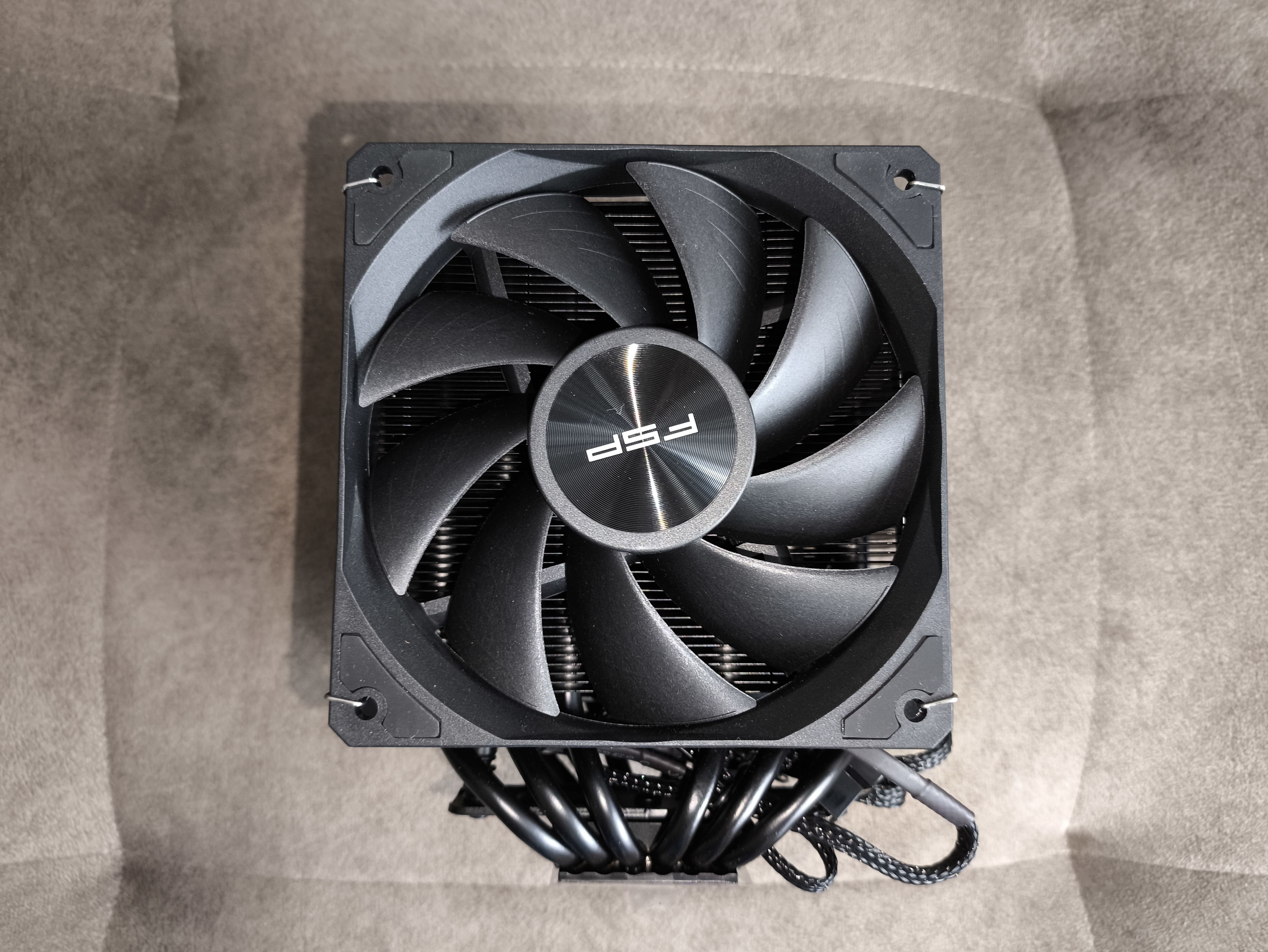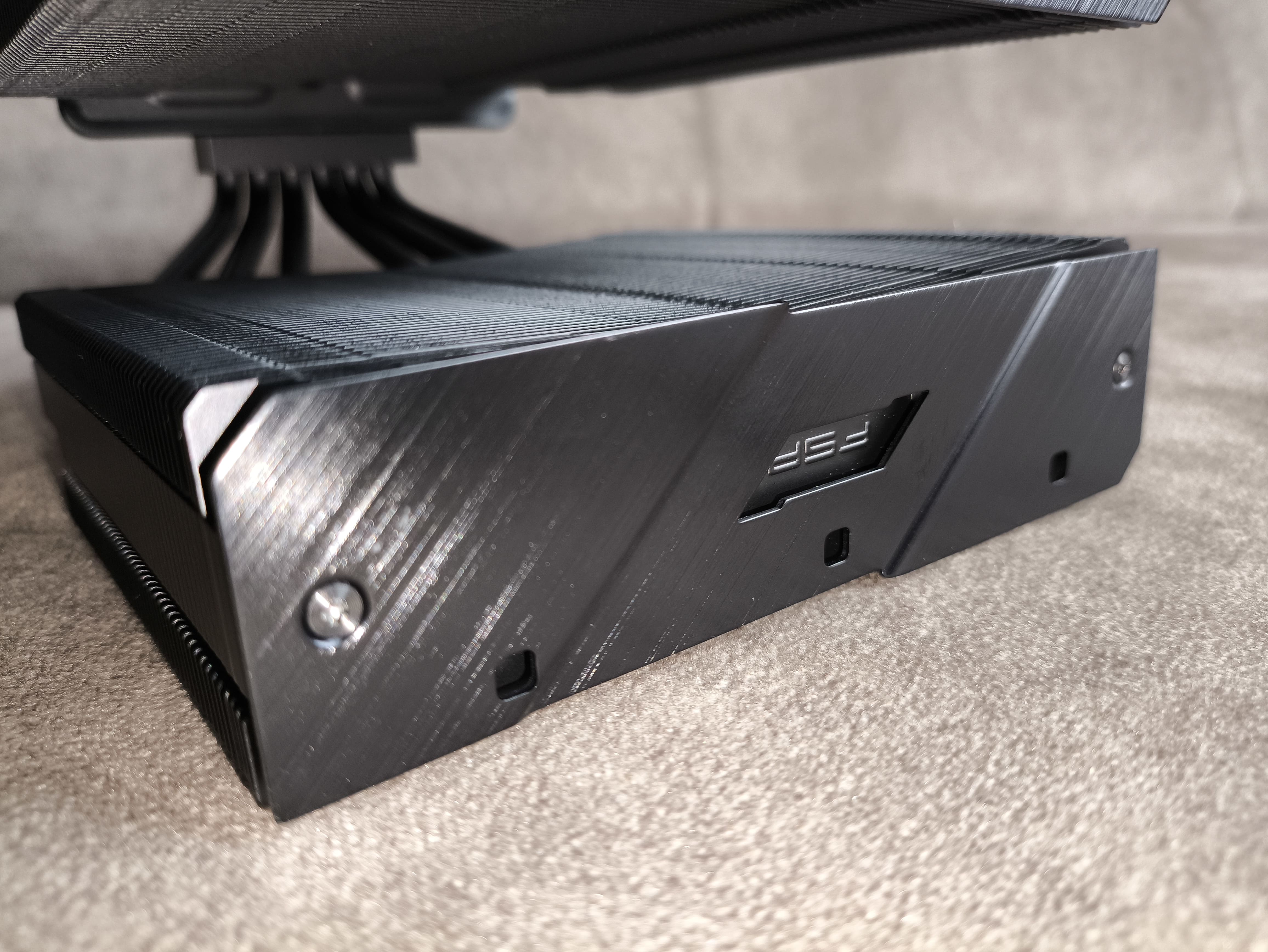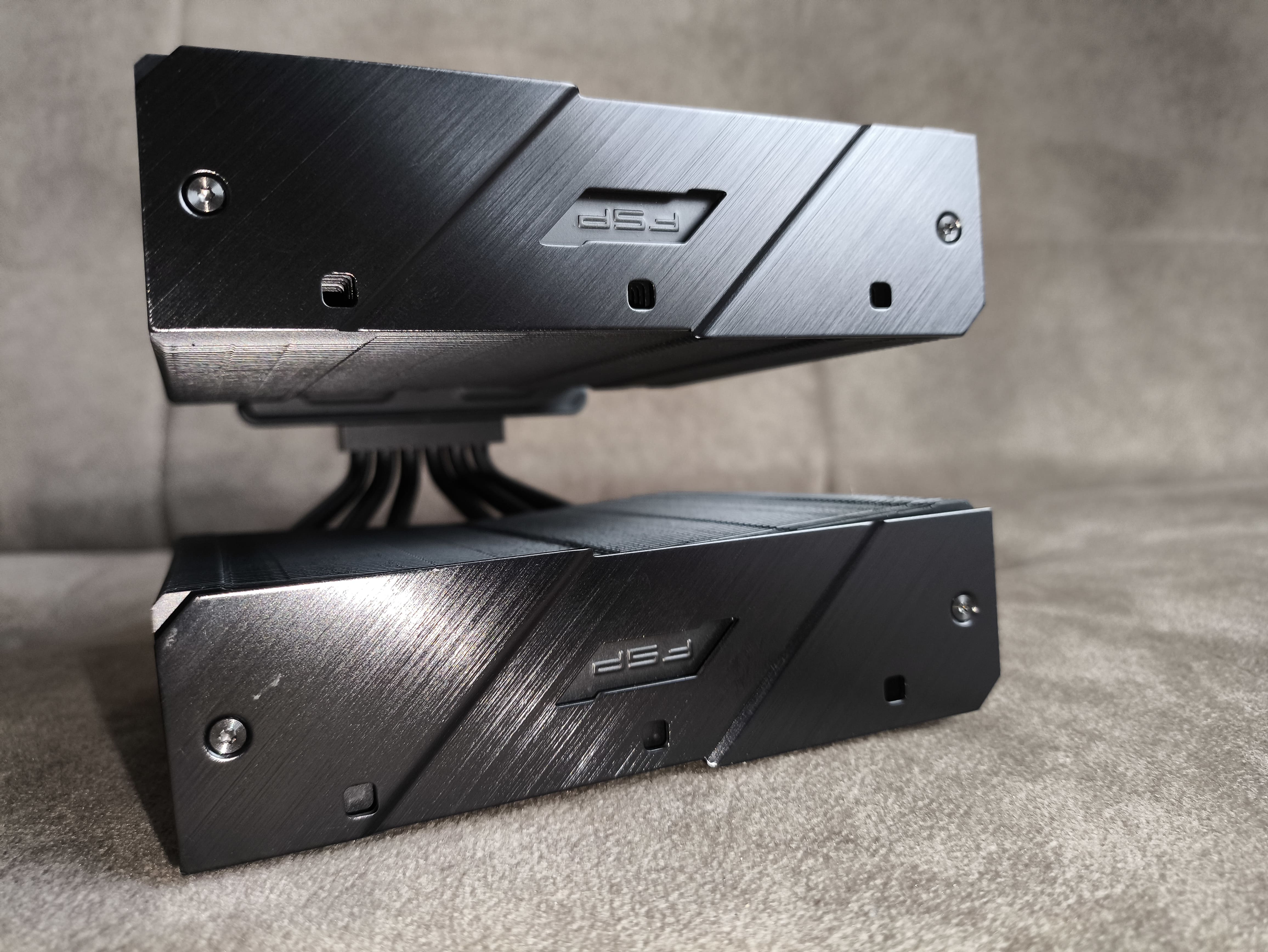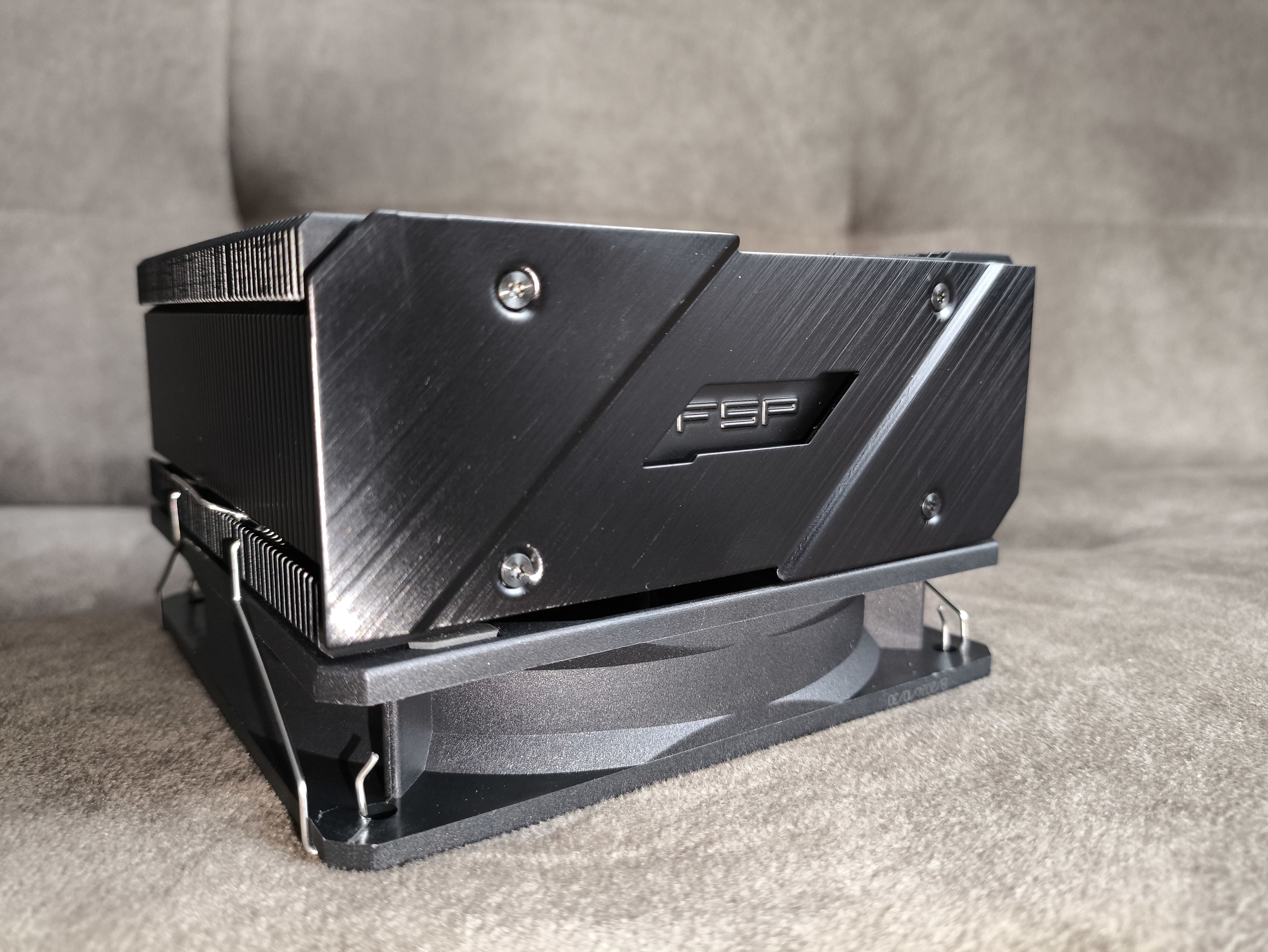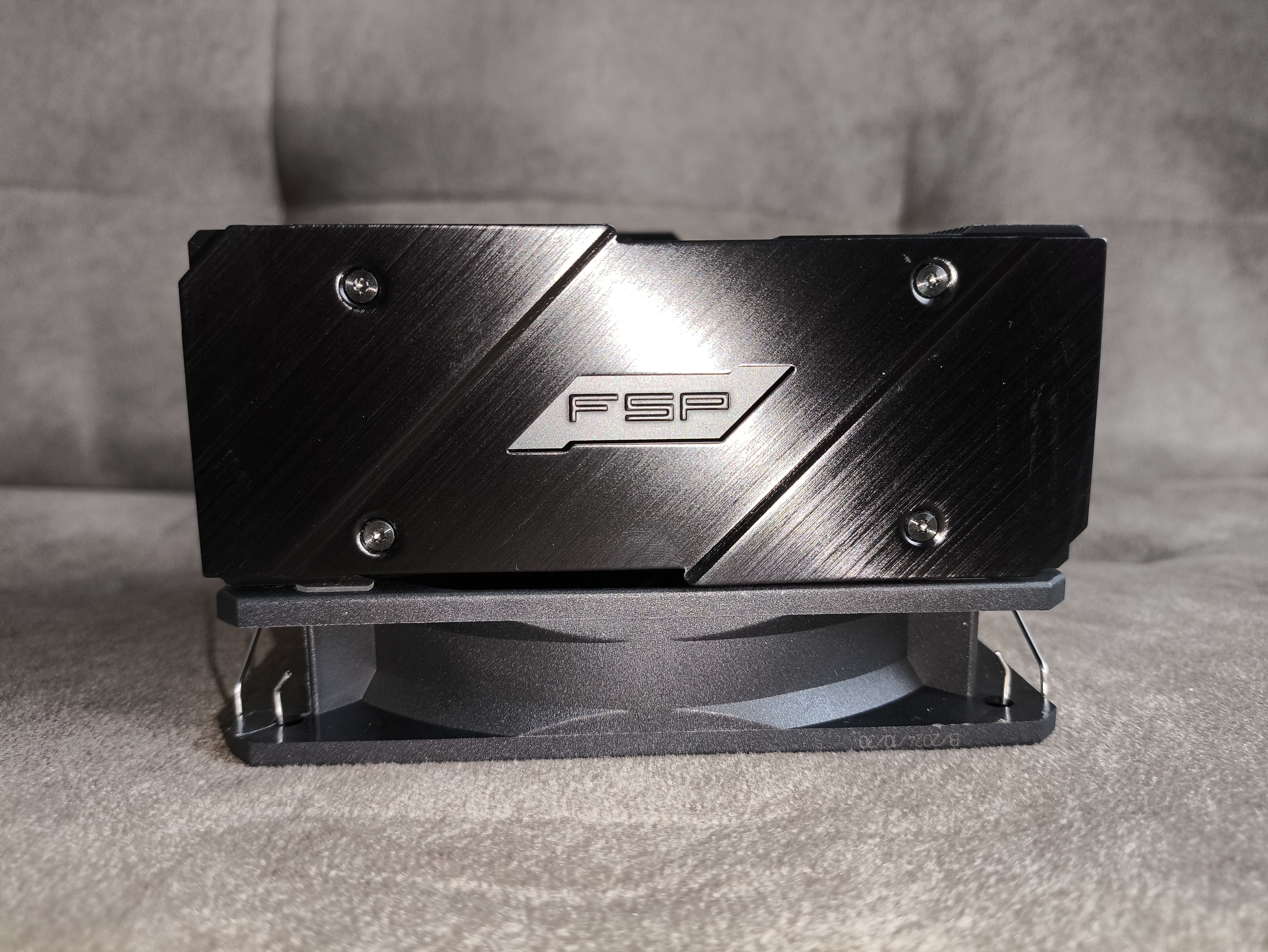 Producent zadbał o kwestie kompatybilności – boczny profil radiatorów został przesunięty, aby poprawić prześwit nad pamięciami RAM, natomiast od strony sekcji zasilania płyty głównej widoczne są wycięcia w żeberkach, które ułatwiają montaż nawet w przypadku masywniejszych radiatorów VRM. Całość wieńczy aluminiowa płyta górna w kolorze czarnym, o szczotkowanym wykończeniu i z subtelnym logotypem FSP w niewielkim wycięciu.
