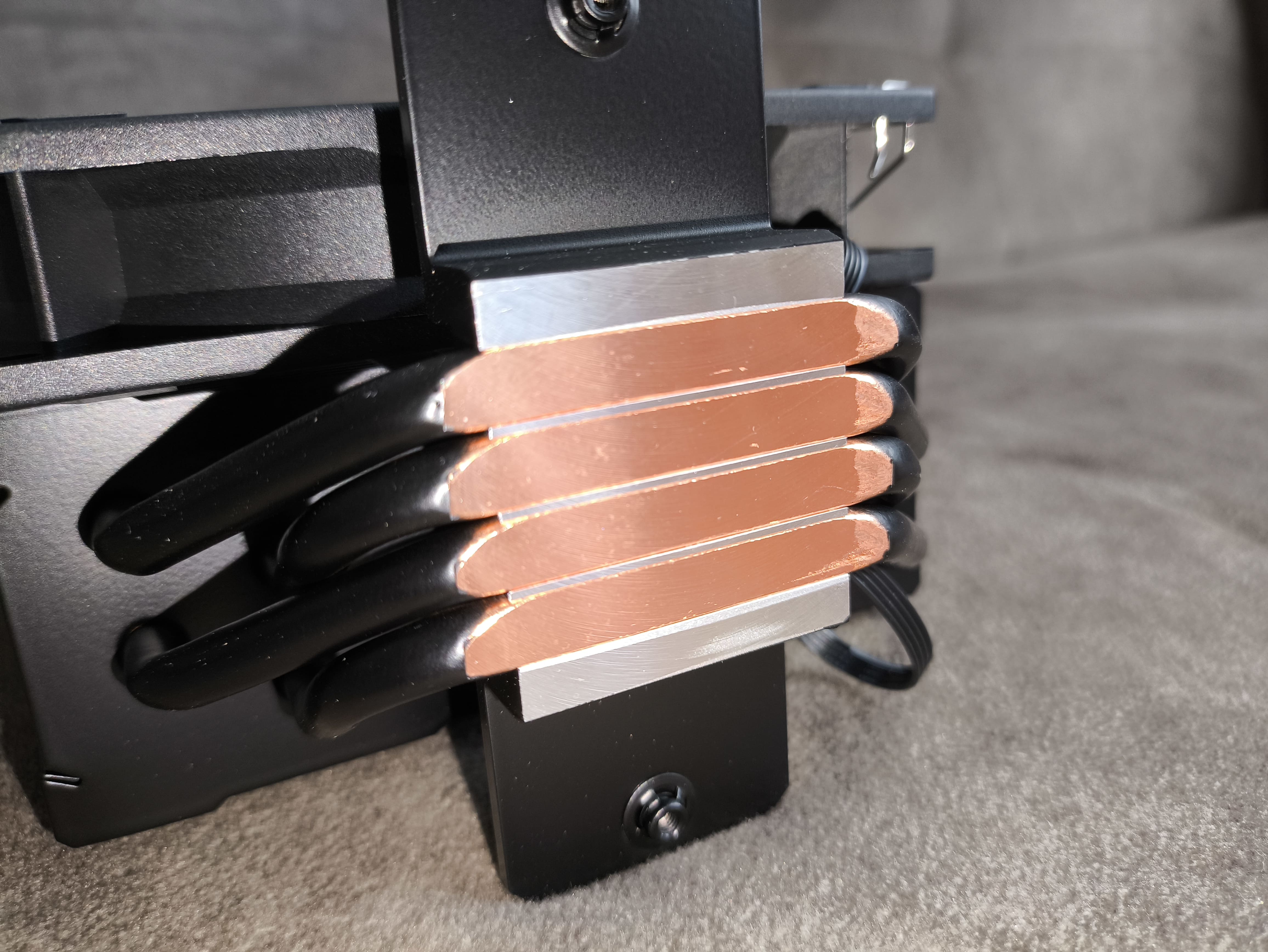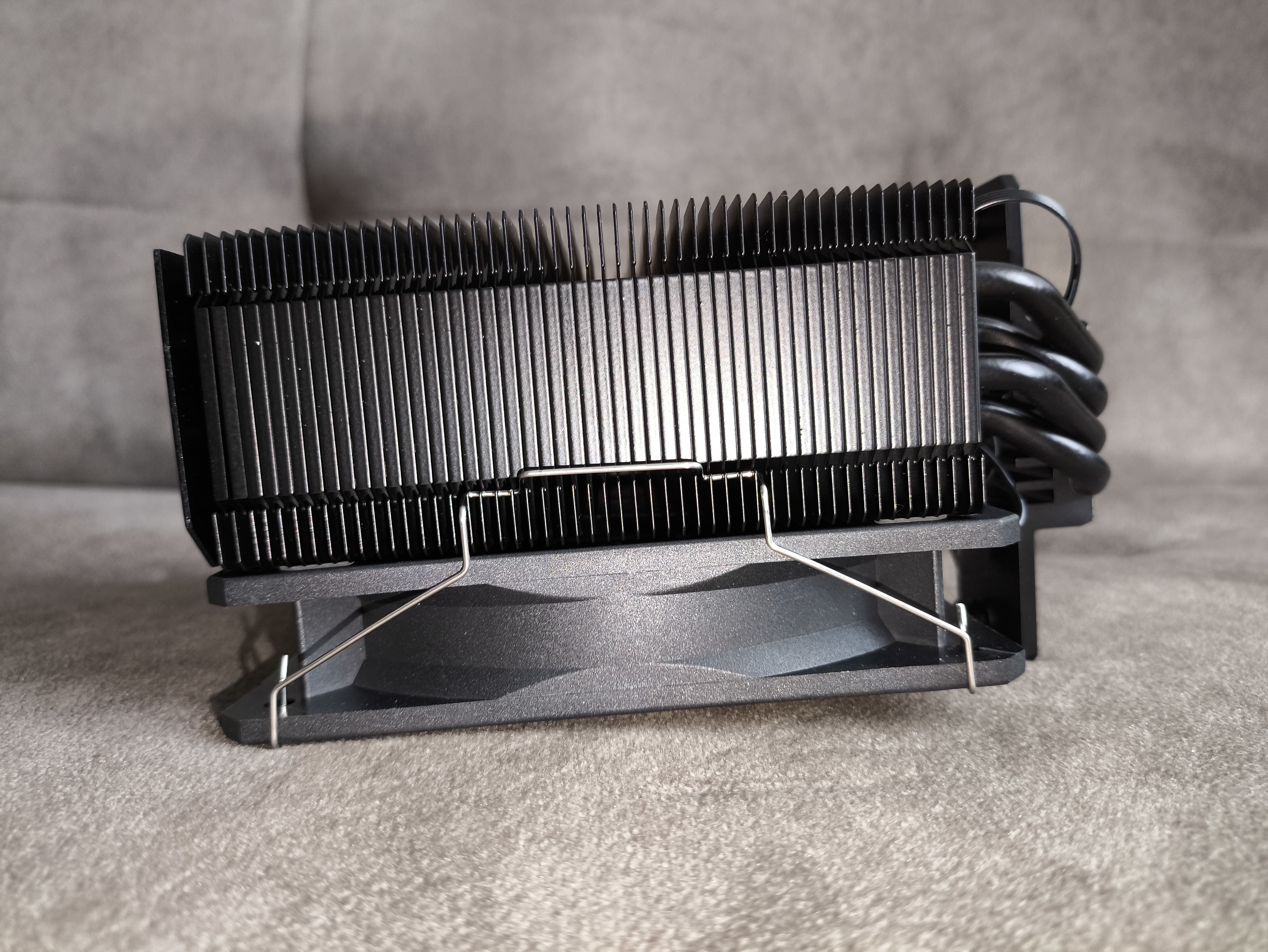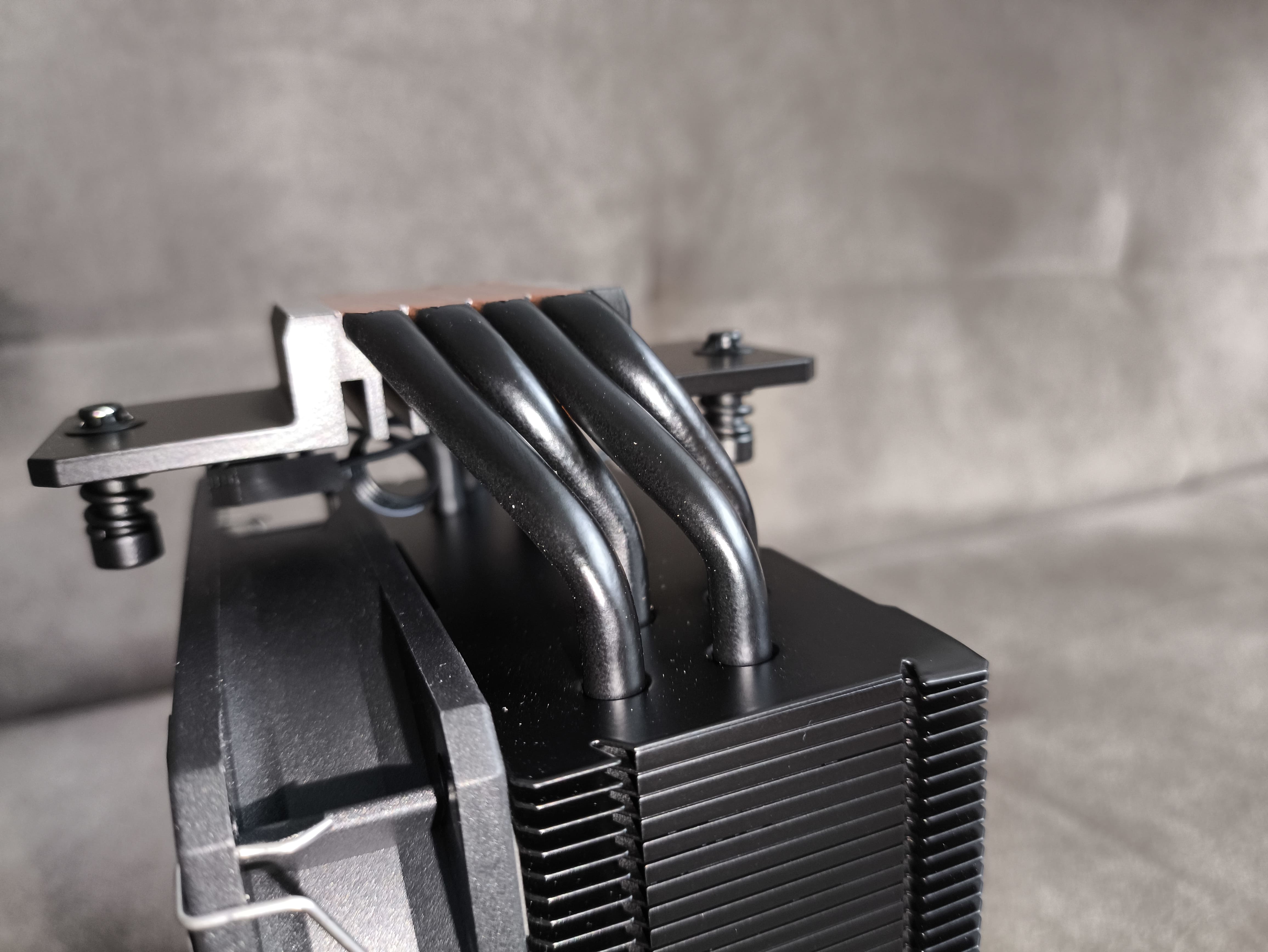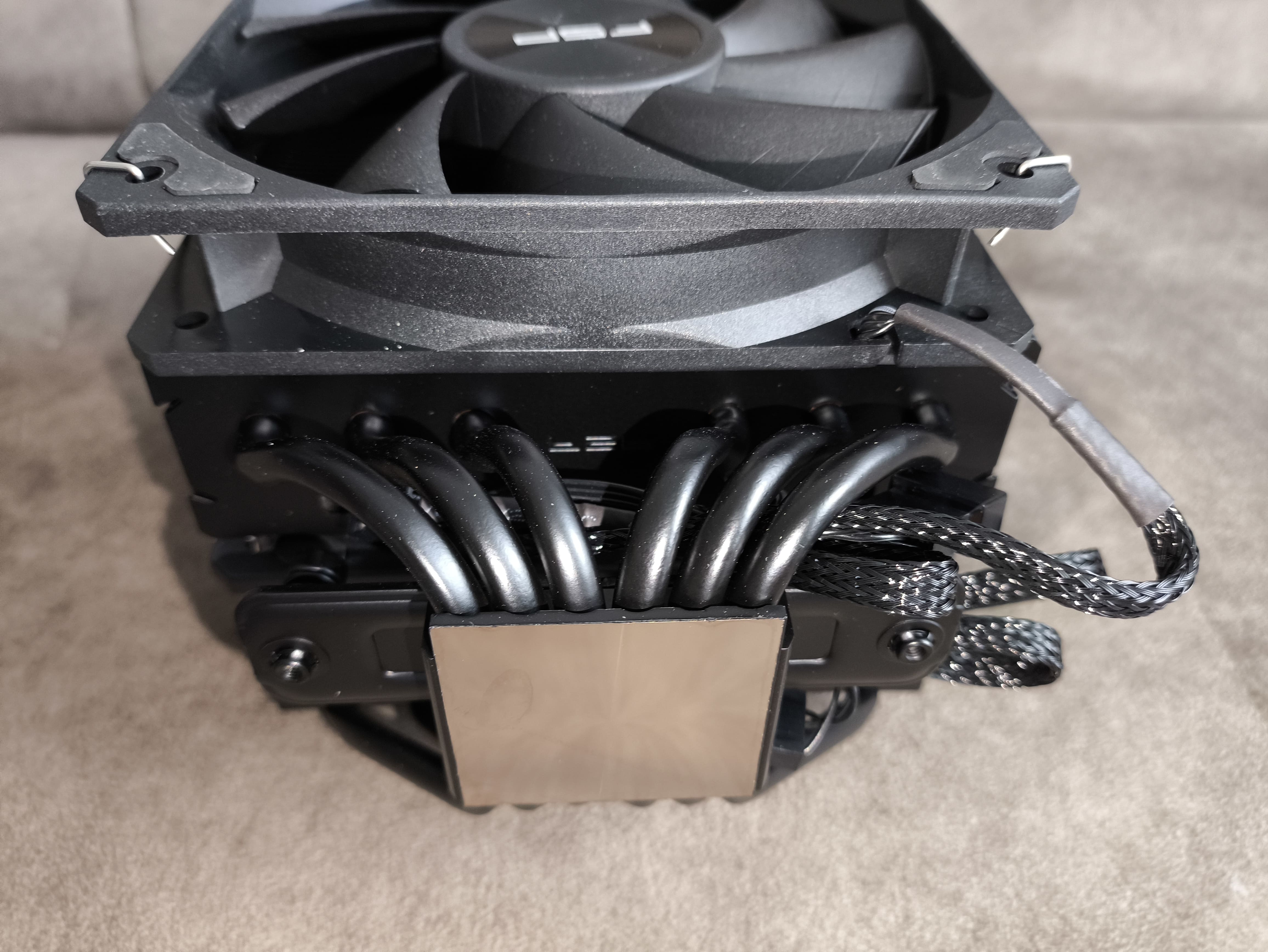 Jeśli chodzi o podstawkę, to mamy tu klasykę dla chłodzeń z segmentu średniego (a nawet budżetowego bym powiedział). Cztery miedziane rury cieplne z bezpośrednim dotykiem zapewniają dość efektywne odprowadzanie ciepła, aczkolwiek różnica budowy w stosunku do podstawy odprowadzającej ciepło w modelu MP7-B jest widoczna na pierwszy rzut oka.