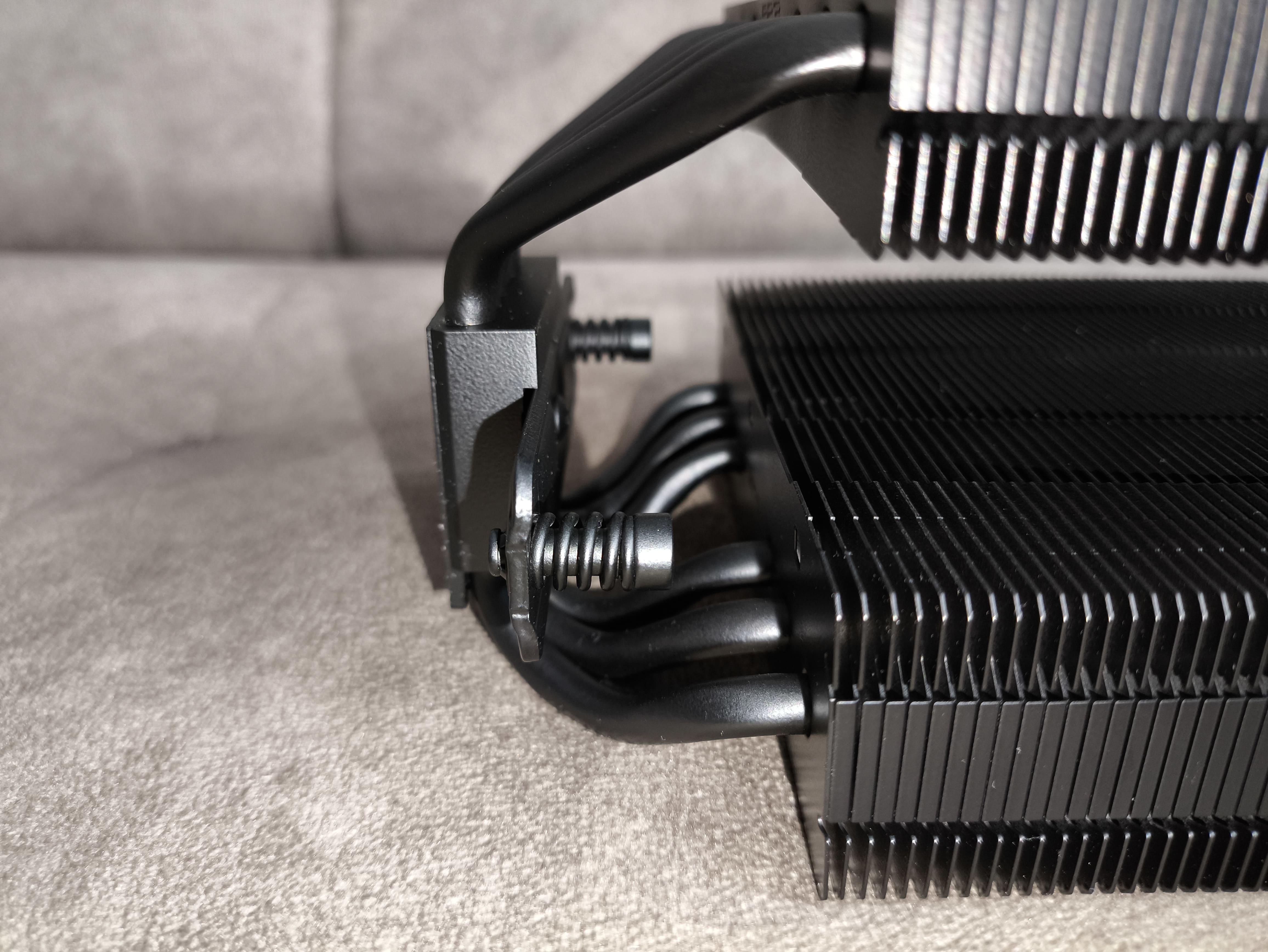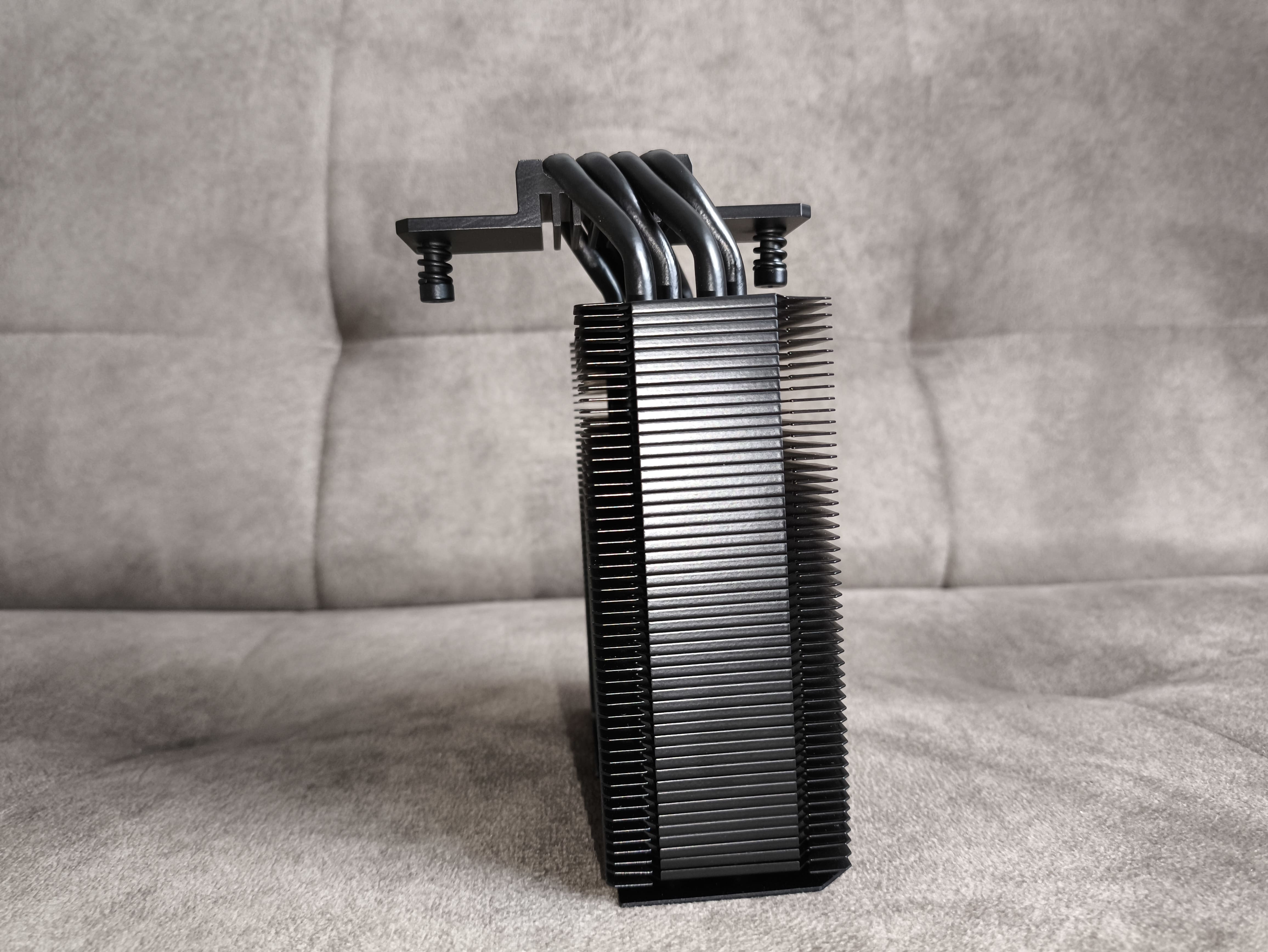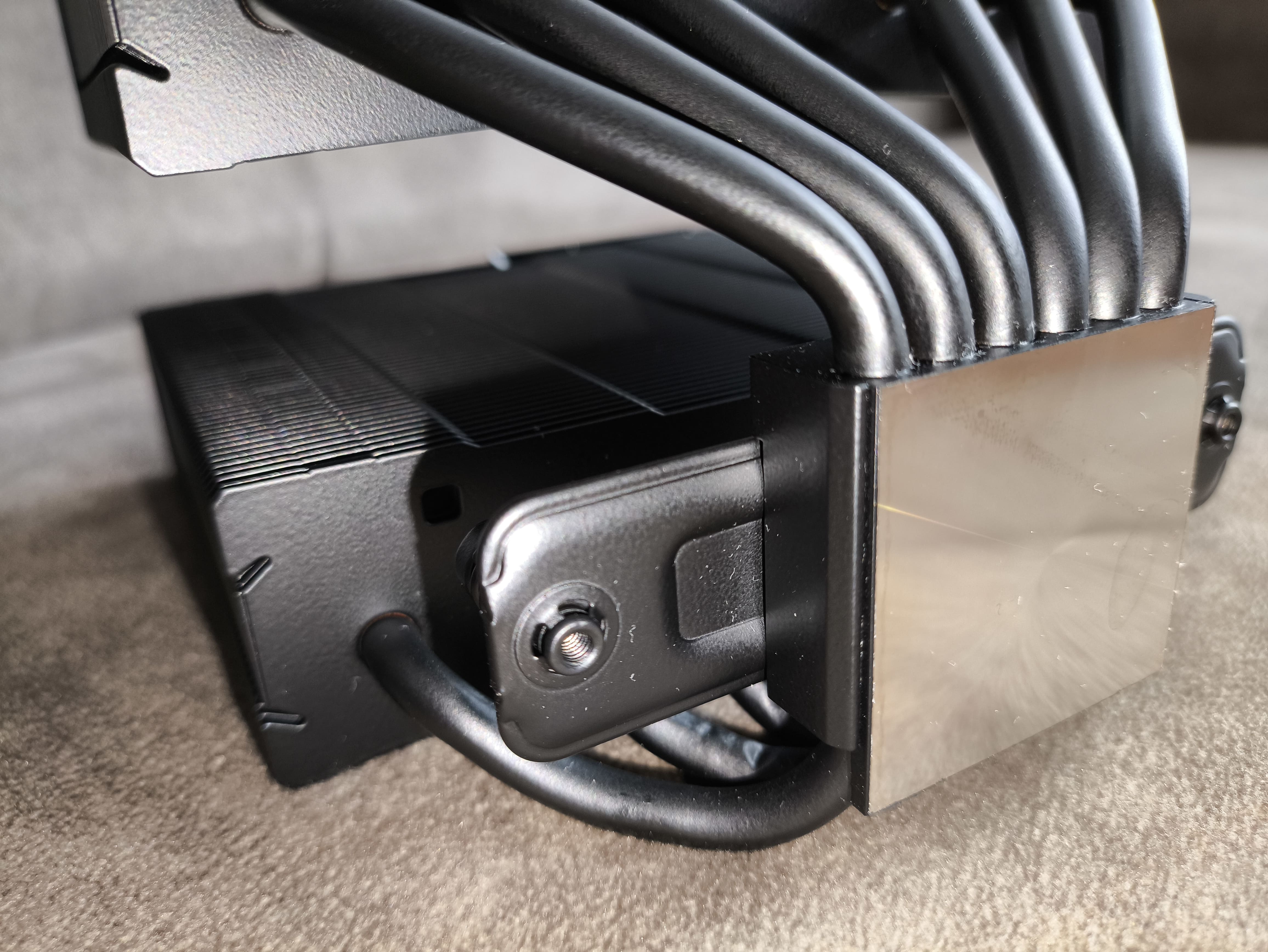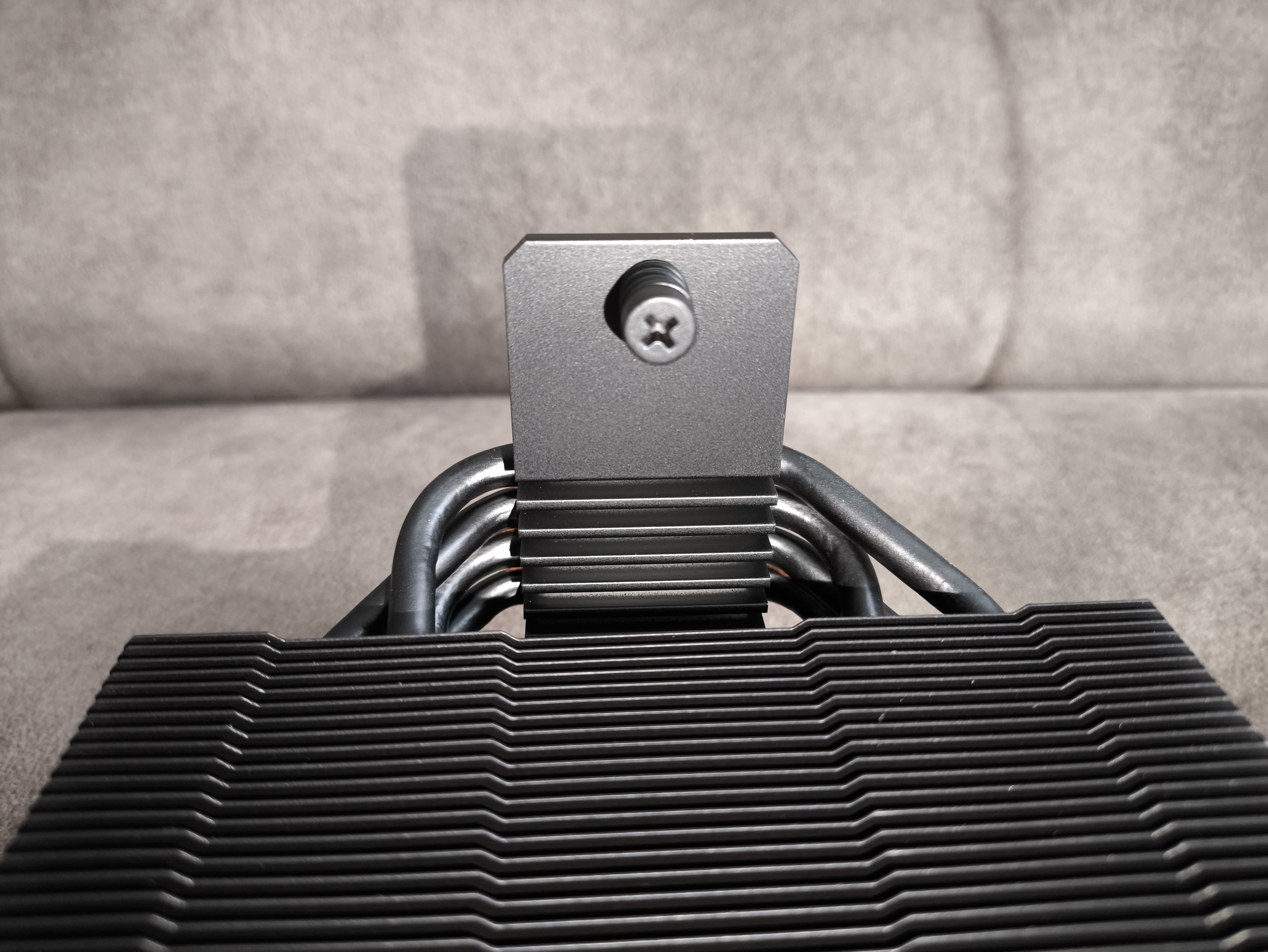 Jeśli chodzi o podstawkę, to mamy tu klasykę dla chłodzeń z segmentu średniego (a nawet budżetowego bym powiedział). Cztery miedziane rury cieplne z bezpośrednim dotykiem zapewniają dość efektywne odprowadzanie ciepła, aczkolwiek różnica budowy w stosunku do podstawy odprowadzającej ciepło w modelu MP7-B jest widoczna na pierwszy rzut oka.