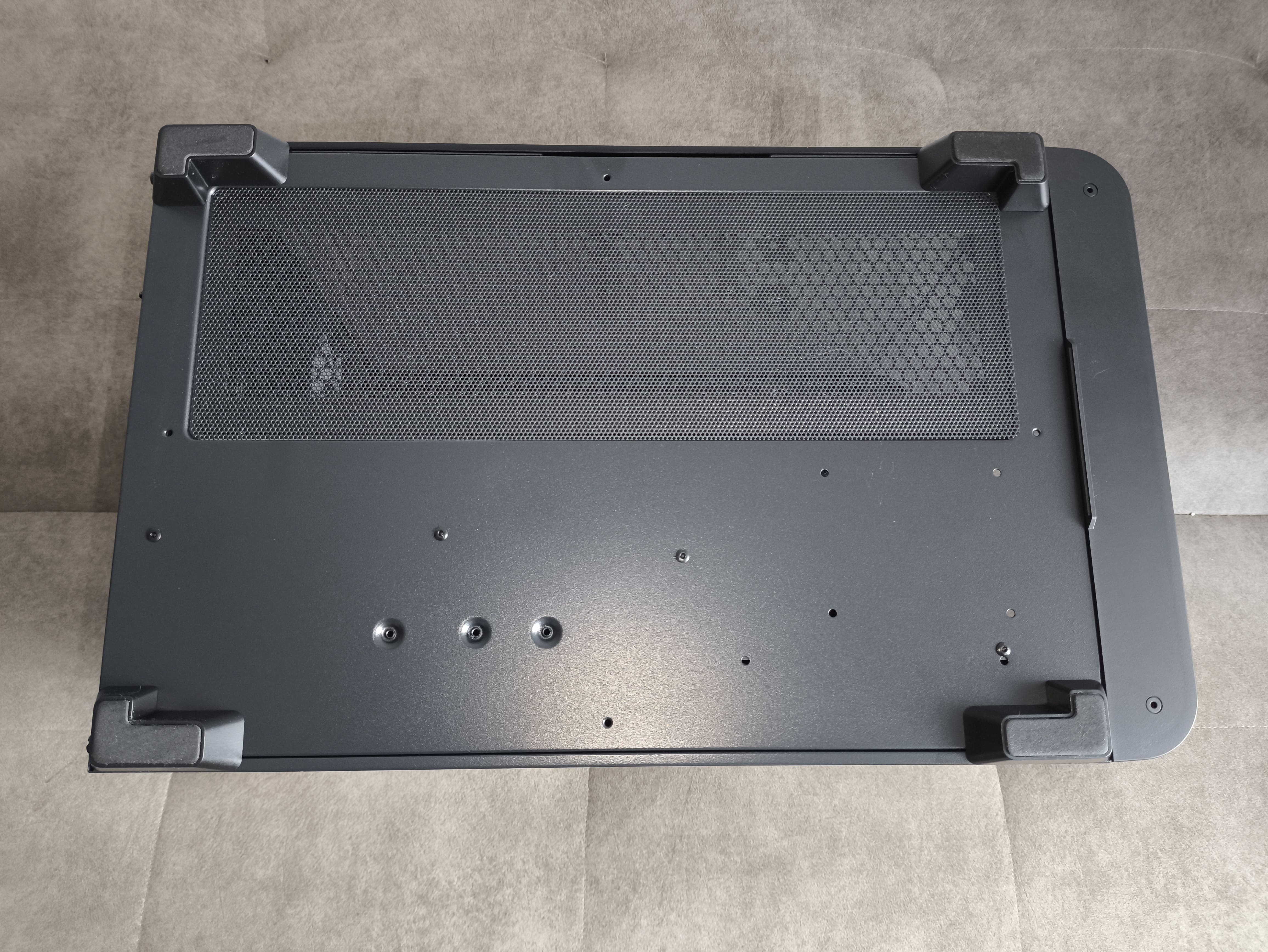 Obudowa spoczywa na czterech stabilnych nóżkach w kształcie litery L, które pewnie podtrzymują całą konstrukcję i delikatnie unoszą ją nad powierzchnią, co poprawia przepływ powietrza przez dolny filtr. Gumowe podstawki zapobiegają ślizganiu się obudowy po biurku i chronią powierzchnię przed zarysowaniami.