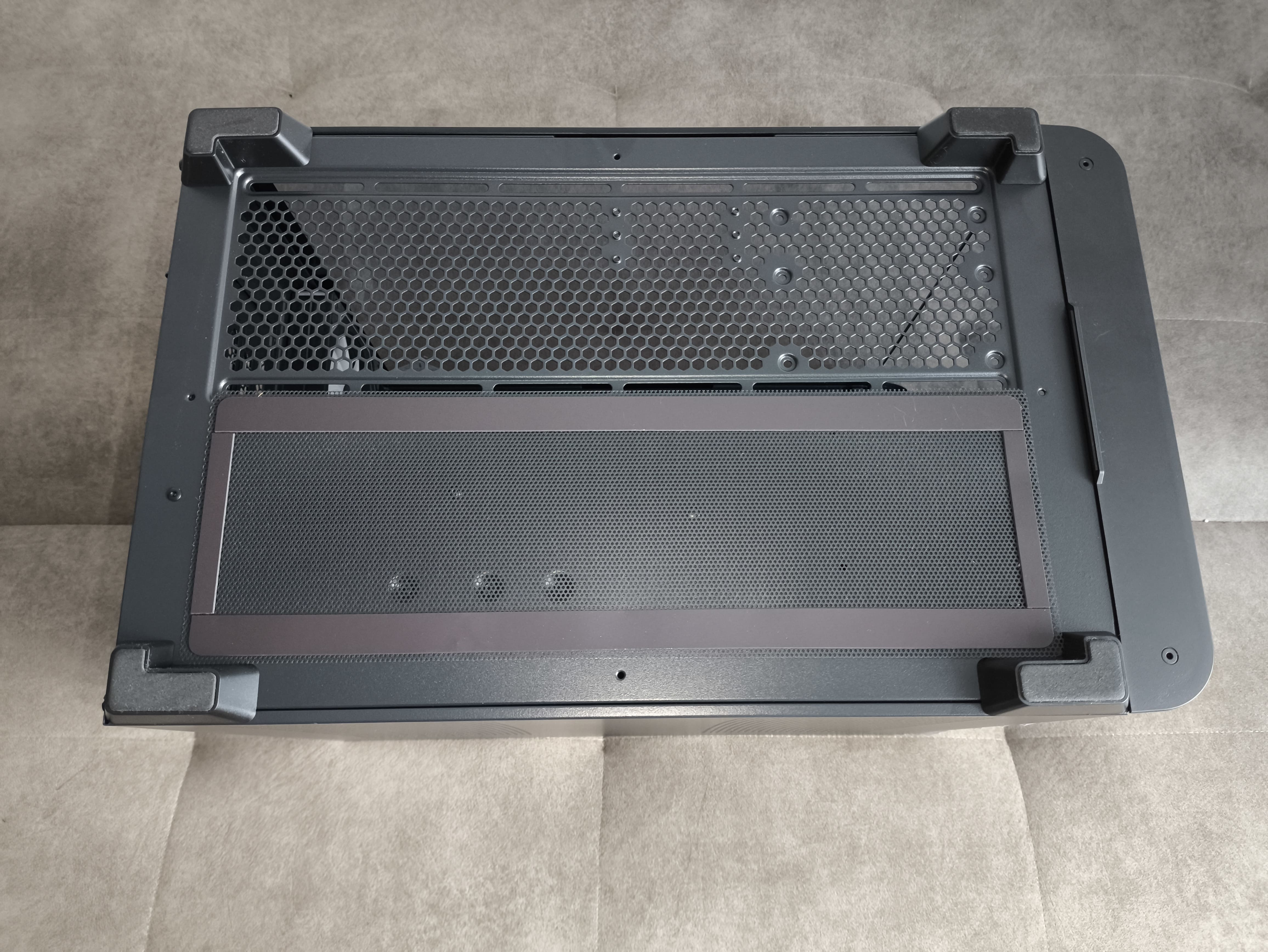 Na górze obudowy znalazło się miejsce na dwa wentylatory 120 mm, dwa 140 mm, lub chłodnicę o długości do 360 mm maksymalnie (w tym 240 i 280 mm też). Producent zastosował również magnetyczny filtr przeciwkurzowy, który można szybko zdjąć i wyczyścić. Panel przedni nie posiada jednak klasycznego filtra – zamiast tego cała powierzchnia mesh pełni funkcję bariery przeciw kurzowi.
