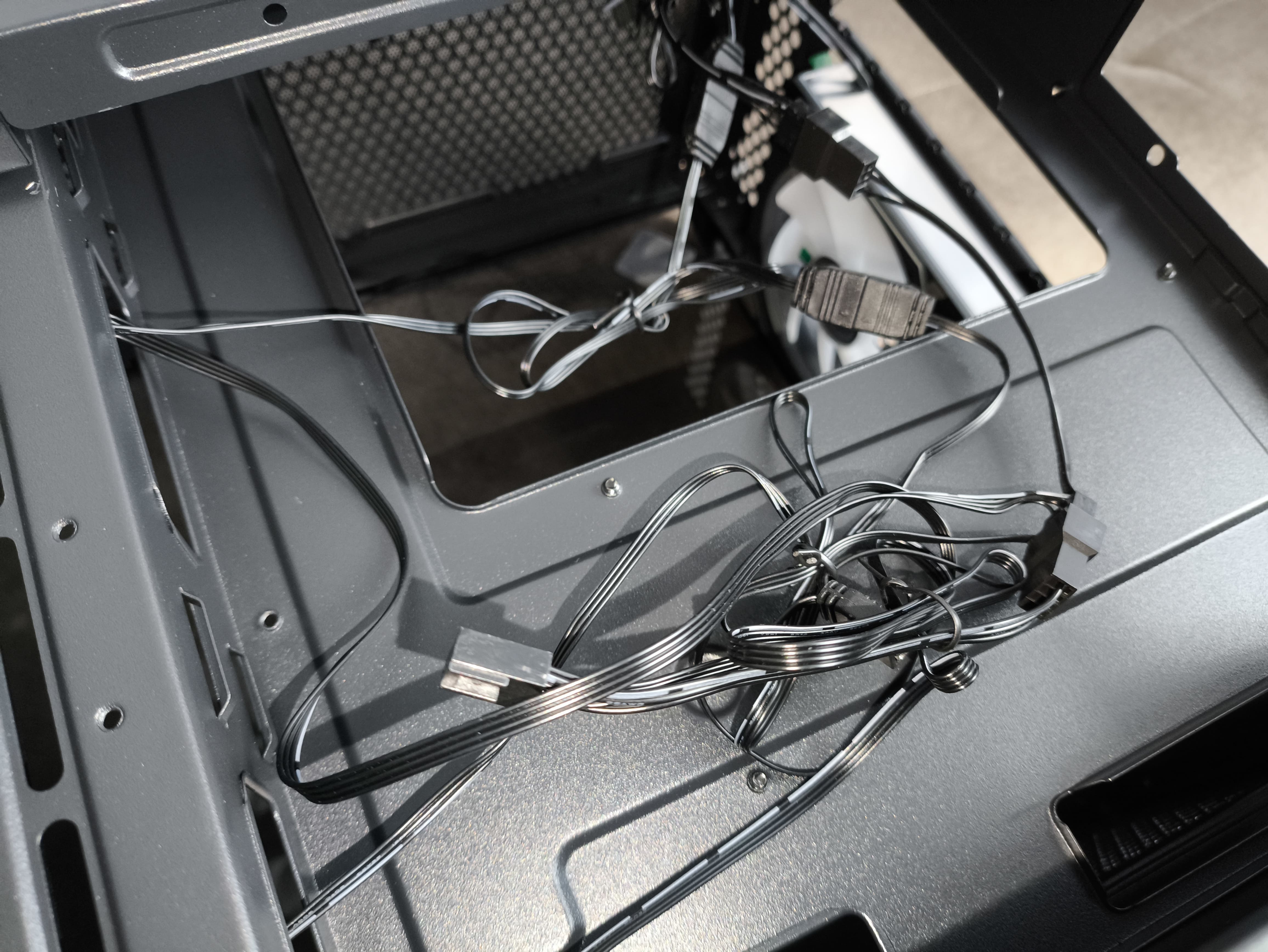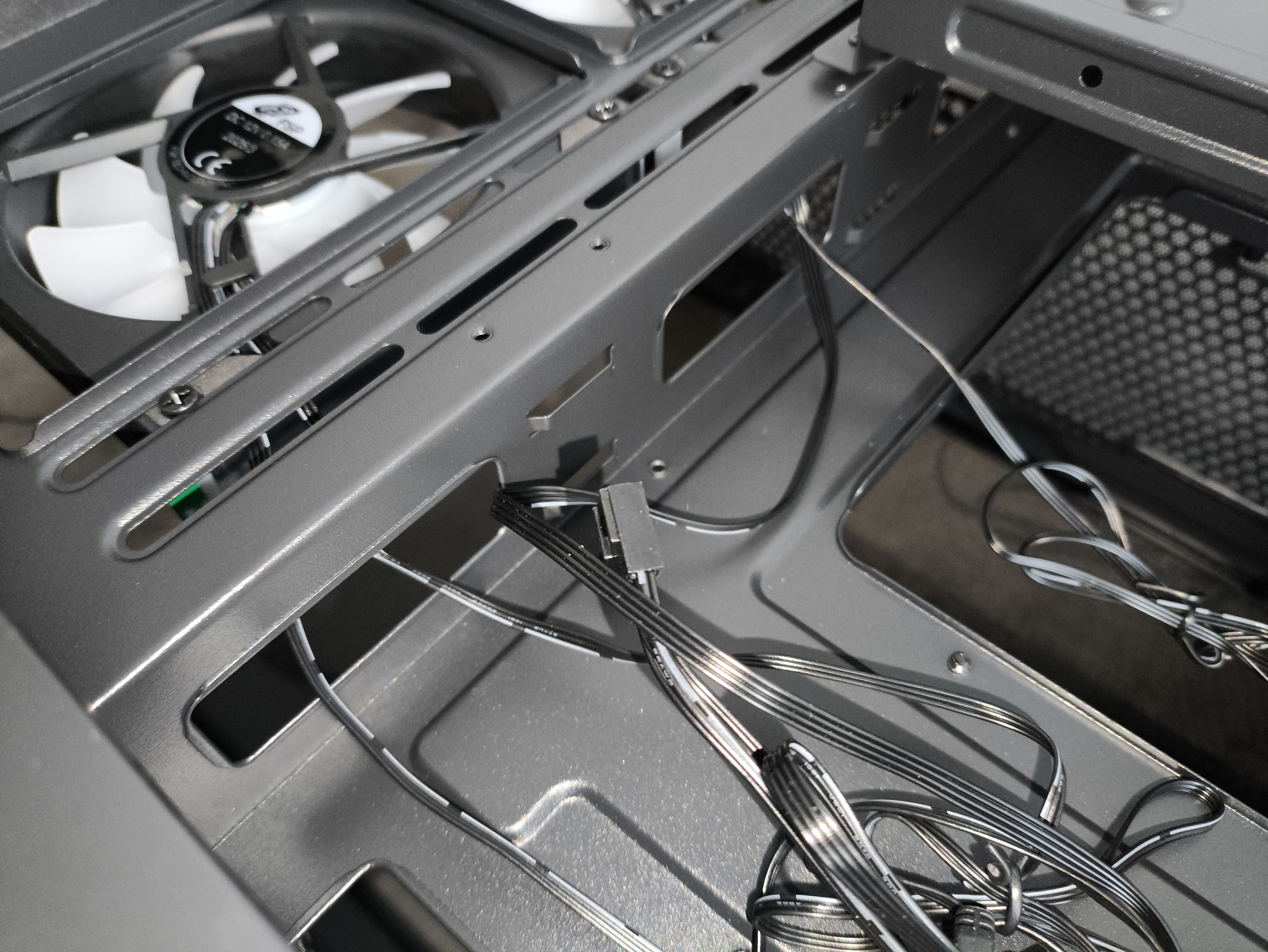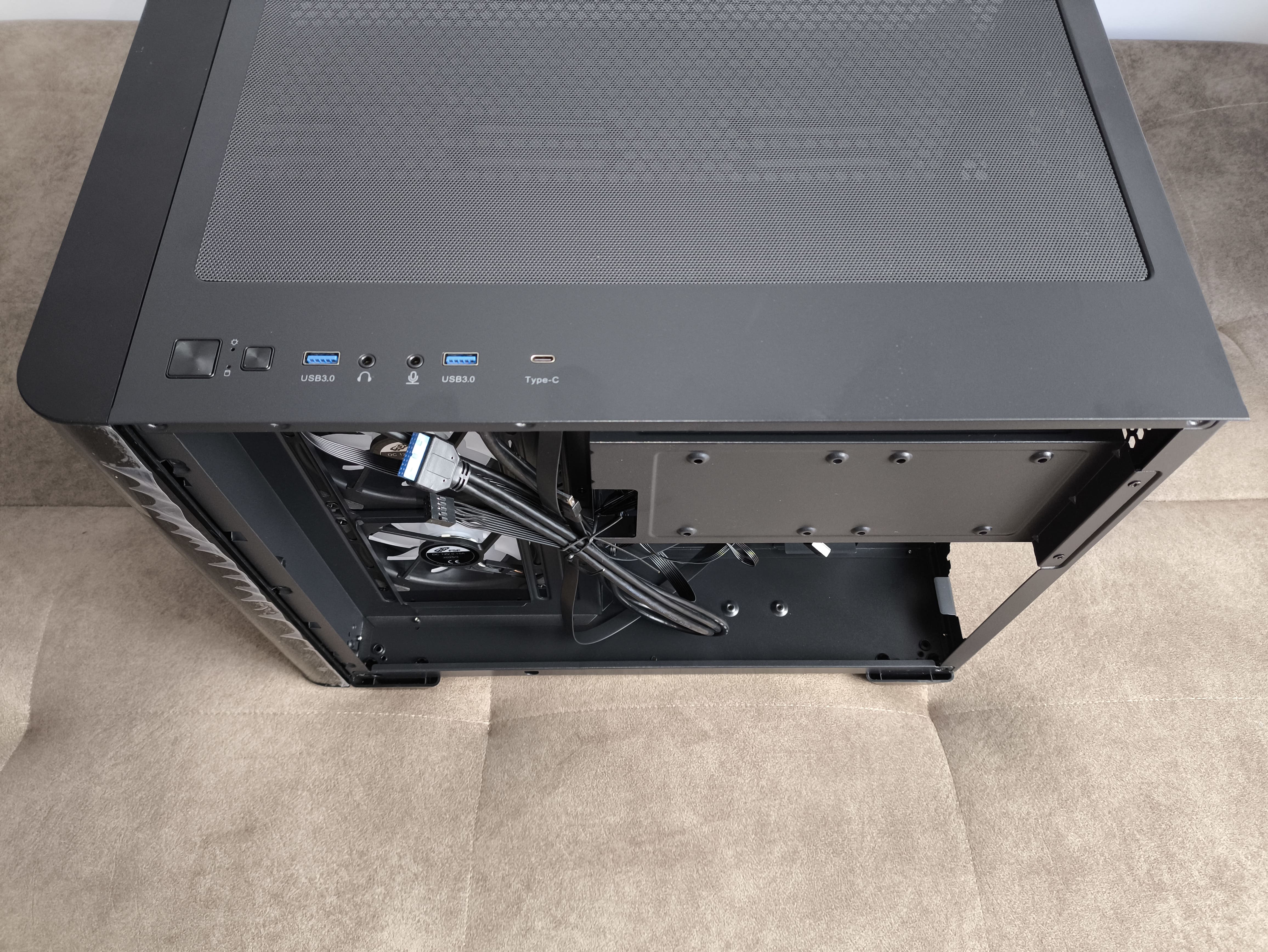Po złożeniu systemu wnętrze S380-BA prezentuje się schludnie. Zarządzanie kablami jest wygodne dzięki licznym haczykom do mocowania przewodów. Jedynie tylna płyta montażowa HDD nieco ogranicza przestrzeń na okablowanie – gdyby była krótsza, prowadzenie kabli byłoby jeszcze łatwiejsze. Od frontu otwory na przewody ATX i inne złącza wyglądają estetycznie, szczególnie w czarnej wersji obudowy, gdzie całość komponuje się spójnie i nie rzuca w oczy.