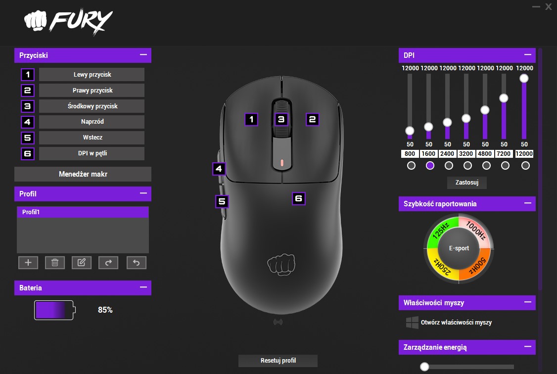 - zmianę parametru polling rate (125/250/500/1000 Hz)