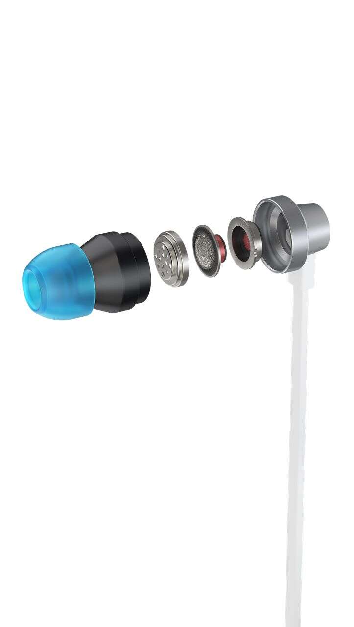 Jak widzimy na zdjęciach, przewód prawej słuchawki uzupełnia prosty kontroler z wbudowanym mikrofonem, a wewnątrz obudowy zwieńczonej aluminiowym korpusem i niebieską gumką, znajdziemy trzyczęściową konstrukcję z przetwornikiem „zapewniającym bogaty w szczegóły dźwięk w grach i muzyce”.
