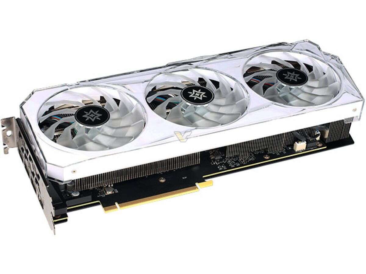 Pierwsza z grafik to RTX 3070 Boomstar OC. Ma ona taktowanie boost 1785 MHz. Zasilana jest ona z dwóch złączy 8 pin oraz ma biały design. Nie zabrakło też TGP na poziomie 240 W.