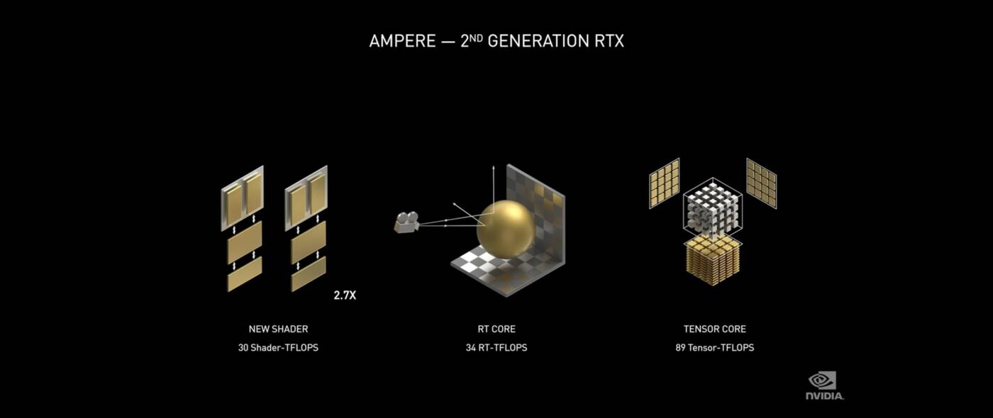 Warto podkreślić, że nowy rodzaj rdzeni cieniujących (shaderów) w architekturze NVIDIA Ampere jest 2,7 razy szybszy, nowe rdzenie RT są 1,7 razy szybsze, a nowe rdzenie Tensor są do 2,7 razy szybsze niż procesory graficzne poprzedniej generacji, bazującej na architekturze Turing.