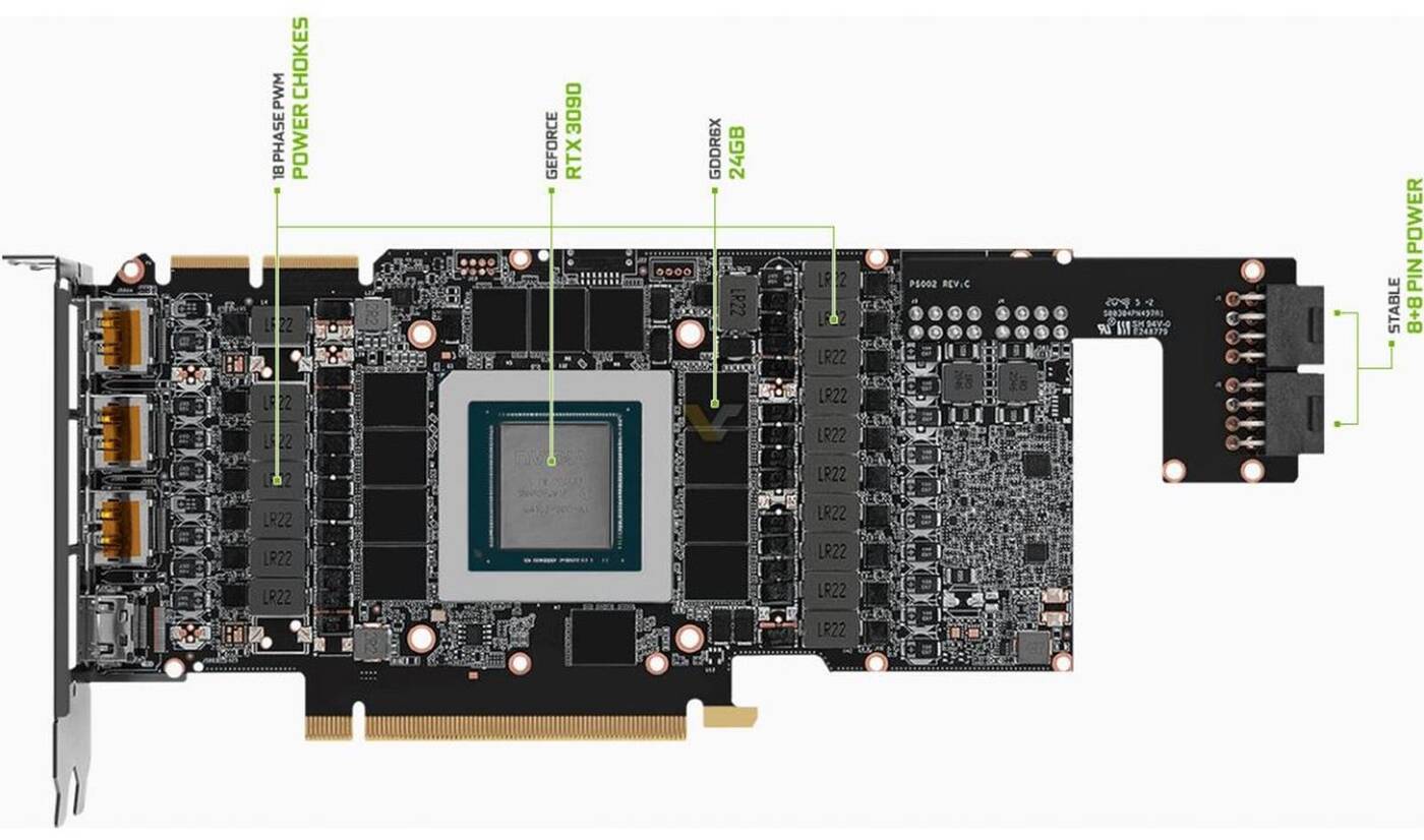 Ten bazuje nie na 12-pinowym złączu, a dwóch 8-pinowych, które wyprowadzono za pomocą dodatkowego laminatu aż na sam koniec karty. Uwolniło to tego GeForce RTX 3090 z turbiną od problemów z samym prowadzeniem przewodów.