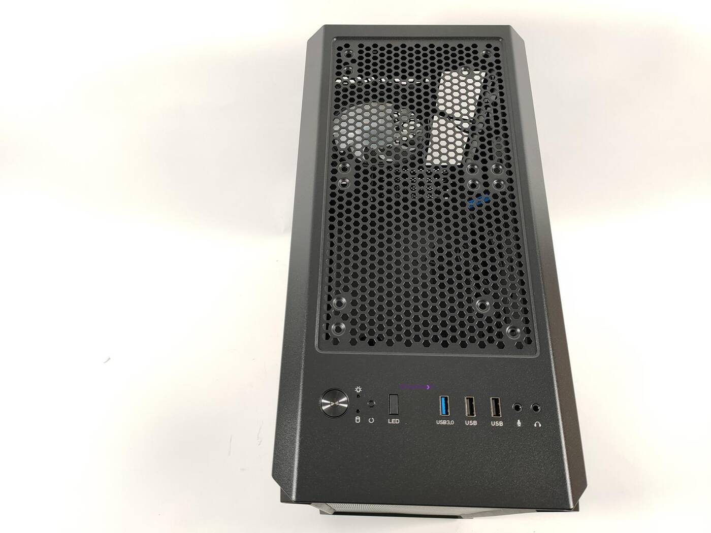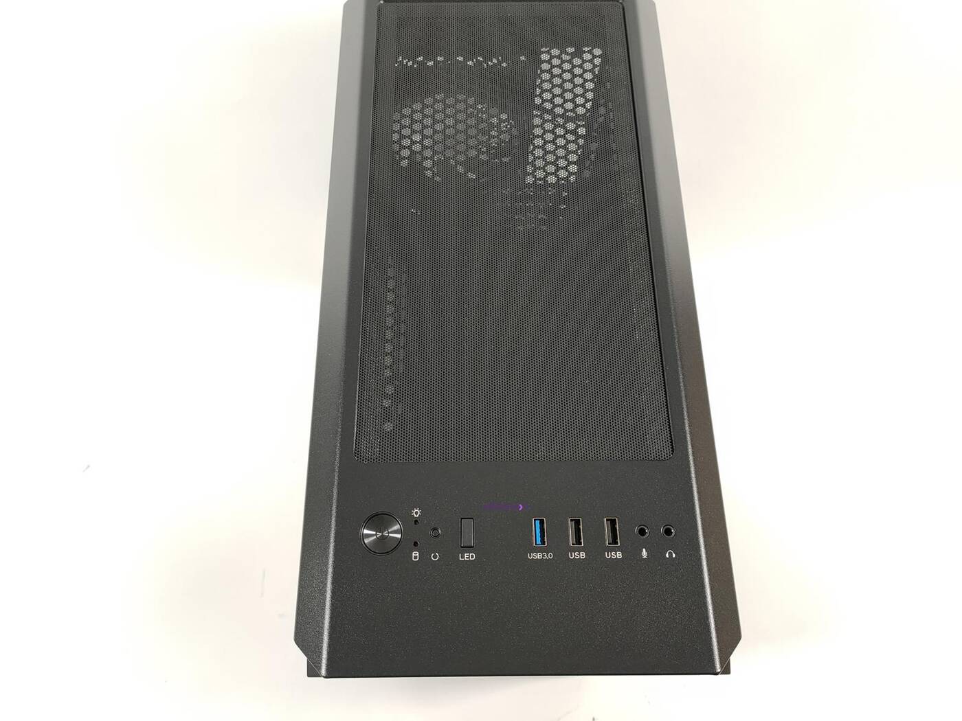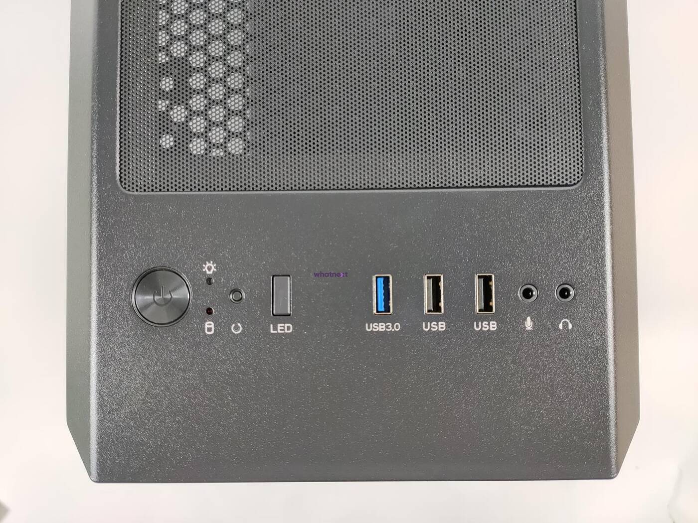 Góra jest raczej standardowa. Zmieścicie tam do dwóch śmigieł 120/140 mm a nad nimi znajduje się filtr przeciwkurzowy. Bliżej przodu jest panel wejścia/wyjścia. Do dyspozycji jest jedno złącza USB 3.0, dwa USB 2.0, wejście na mikrofon i wyjście na słuchawki. Jest tam także przycisk power, reset oraz LED. Szkoda jednak, że nie ma dwóch złączu USB 3.0 – konfiguracja z jednym jest już troszkę przestarzała.