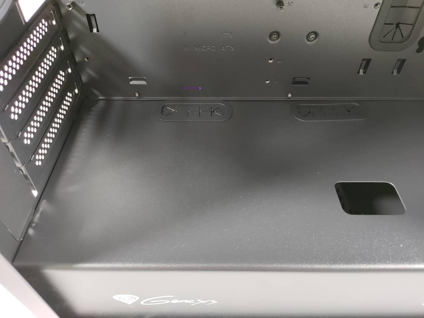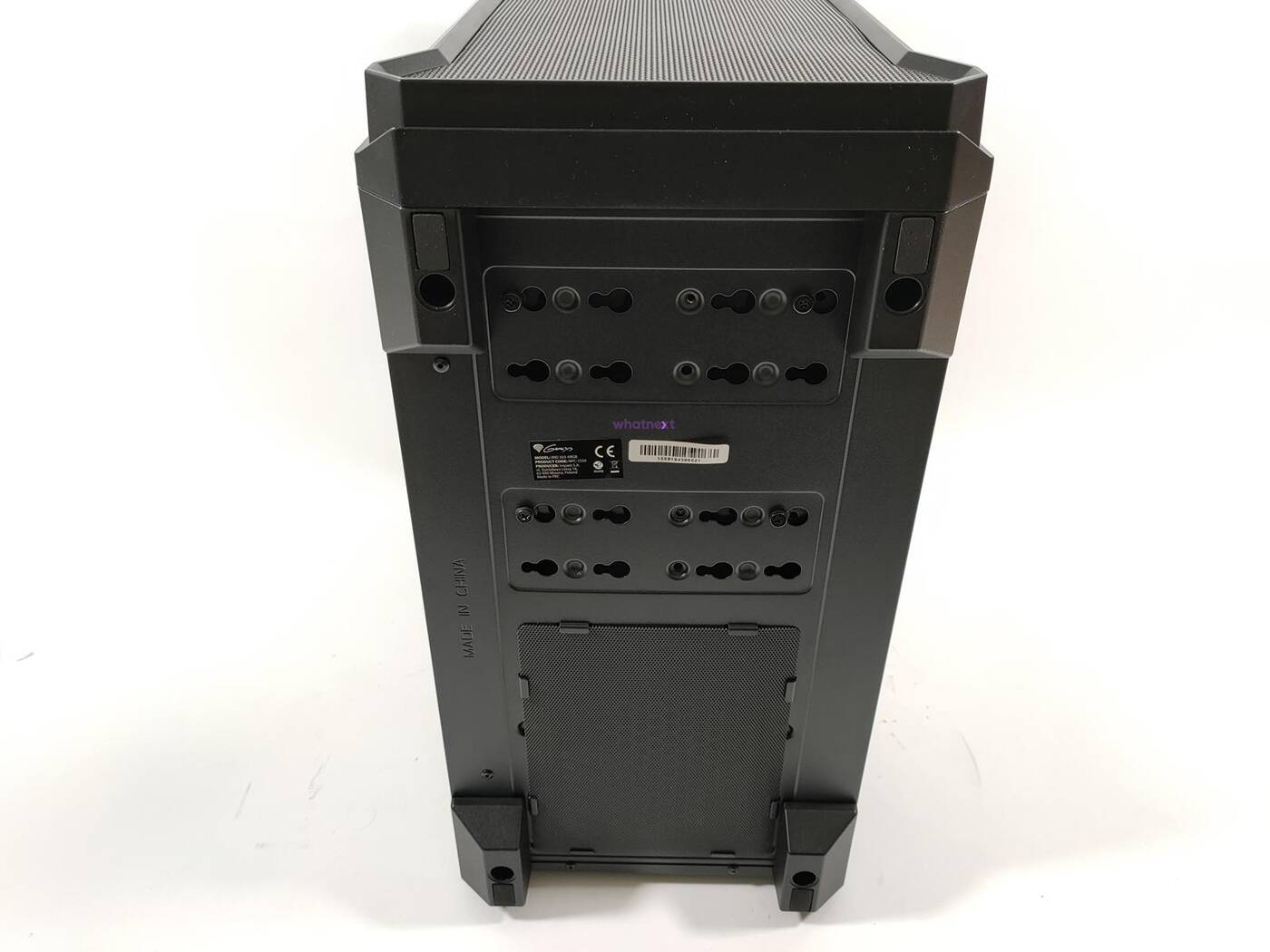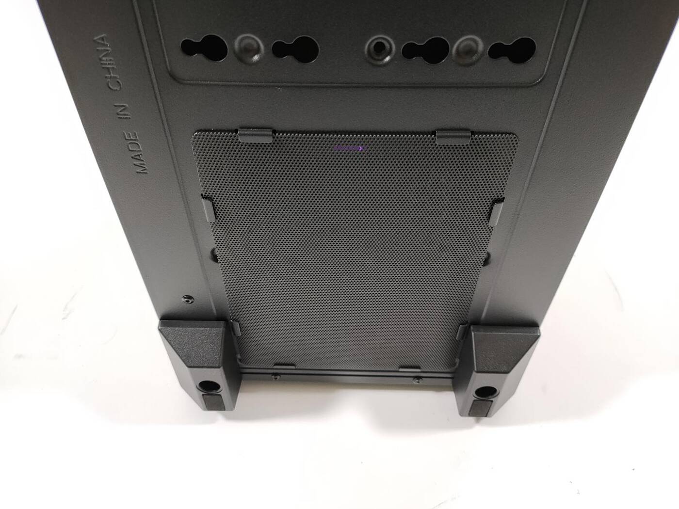 Genesis Irid 503 ARGB stoi na czterech nóżkach z tworzywa sztucznego. Są one niby czymś wyłożone, ale po postawieniu na panelach czuć tylko szurający plastik. Na dole znajduje się też filtr przeciwkurzowy, który jest ciężki w obsłudze. Nie zabrakło również otworów do zmiany położenia koszyka na dyski albo do jego demontażu.
