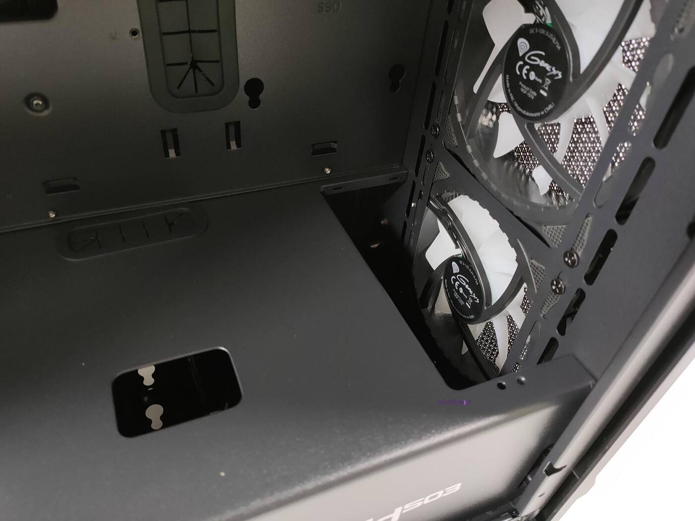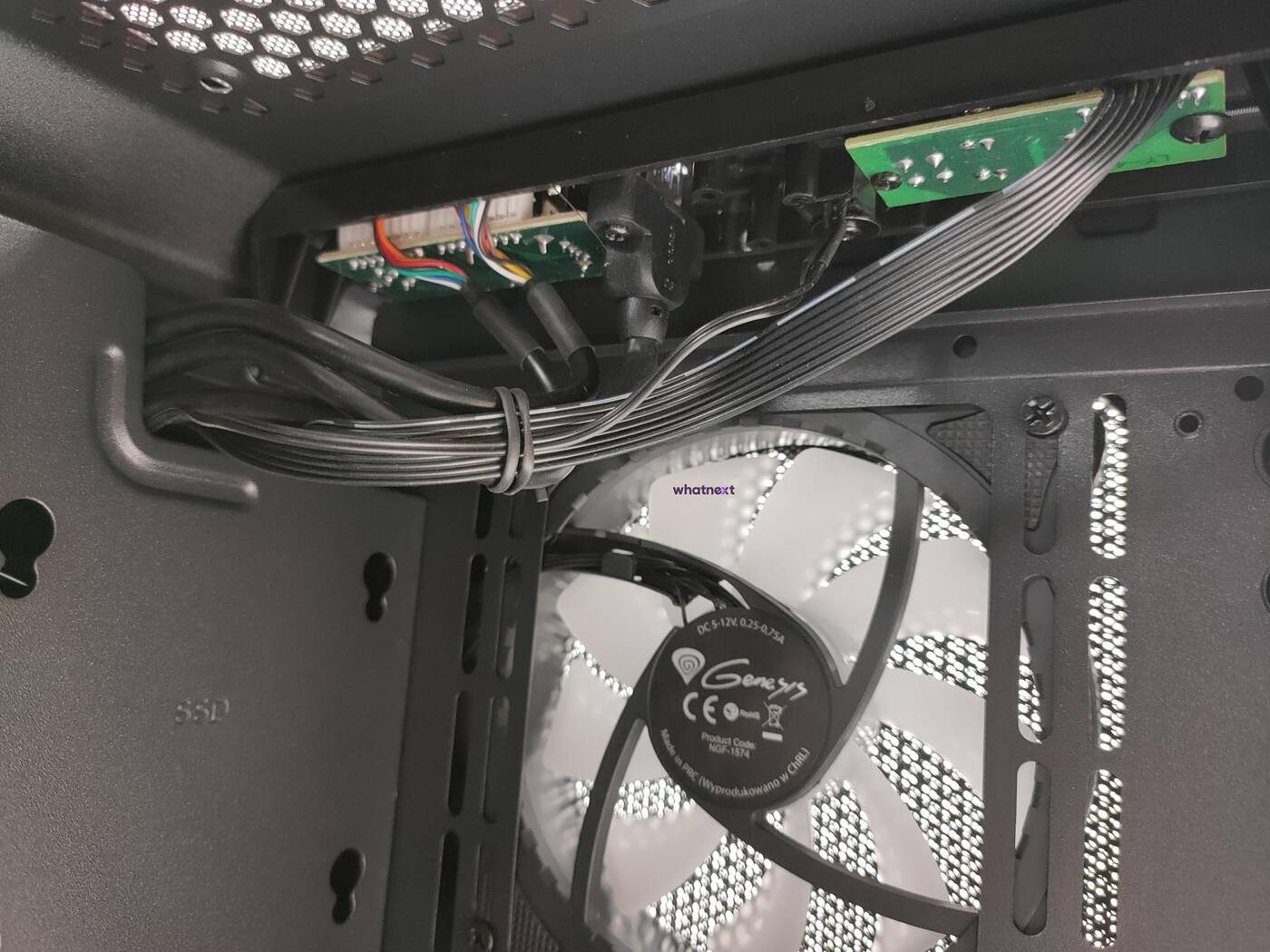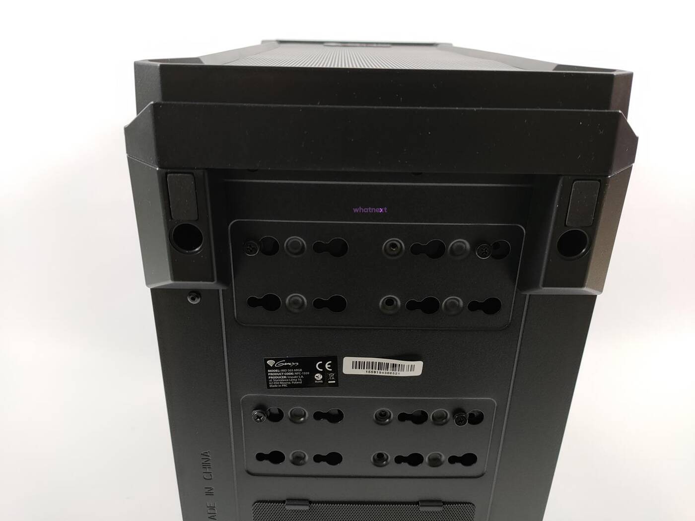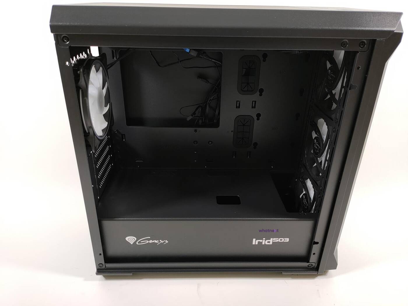 Obudowa generalnie ma bardzo dobry system zarządzania okablowaniem. Nad płytą są otwory na przewody, które spokojnie przełożycie i zmieścicie z tyłu. W głównej części Genesis Irid 503 ARGB zmieścicie dwa dyski 2,5 cala. Maksymalna długość karty graficznej to 375 mm a wysokość chłodzenia procesora to 163 mm. Spokojnie więc w Genesis Irid 503 ARGB zmieszczą się sporej wielkości podzespoły.