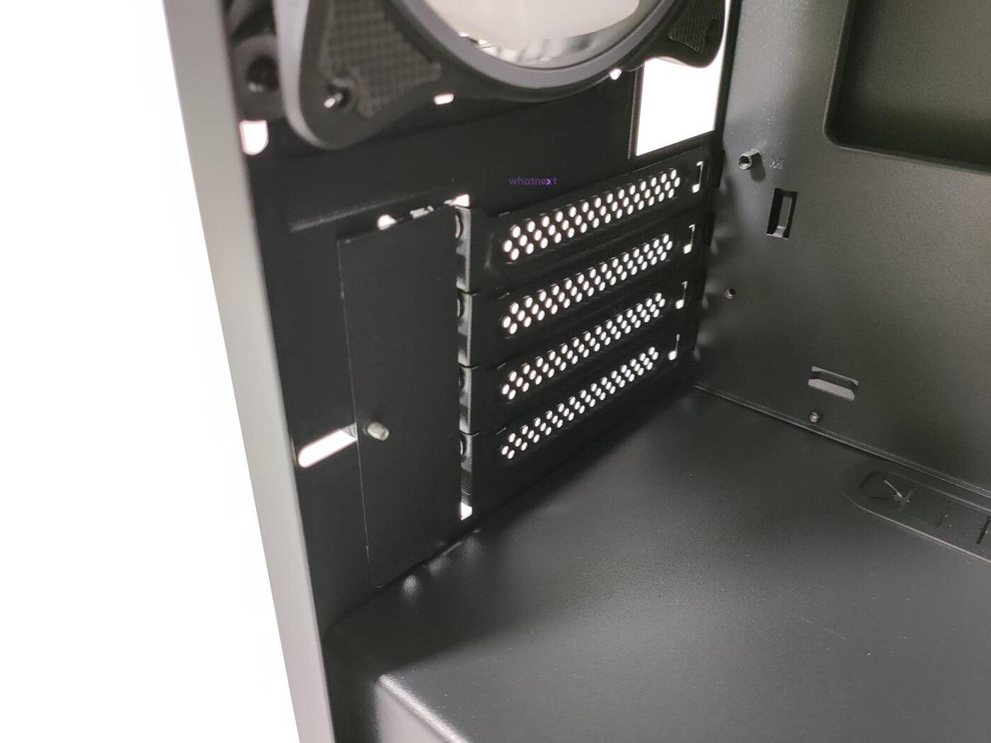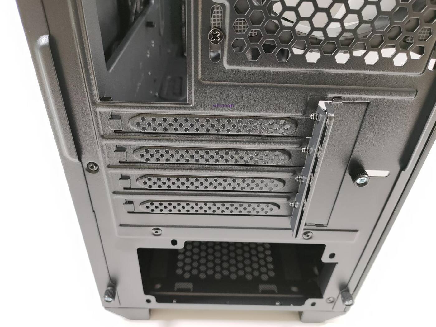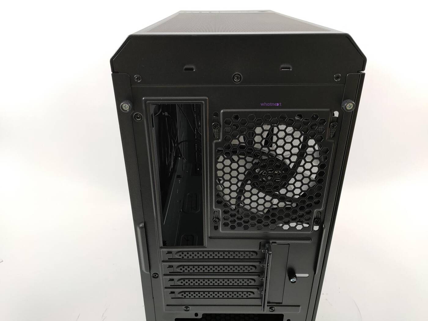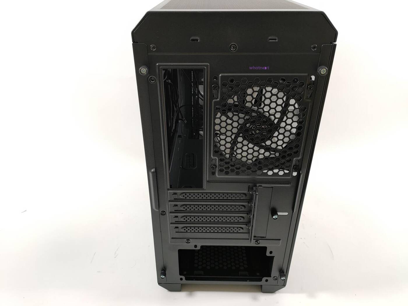 Tył jest standardowy dla małych obudów. Na dole jest miejsce na zasilacz, dalej jest 5 zaślepek PCI mocowanych na śrubki a na samej górze znajduje się wentylator, model ten sam co z przodu.