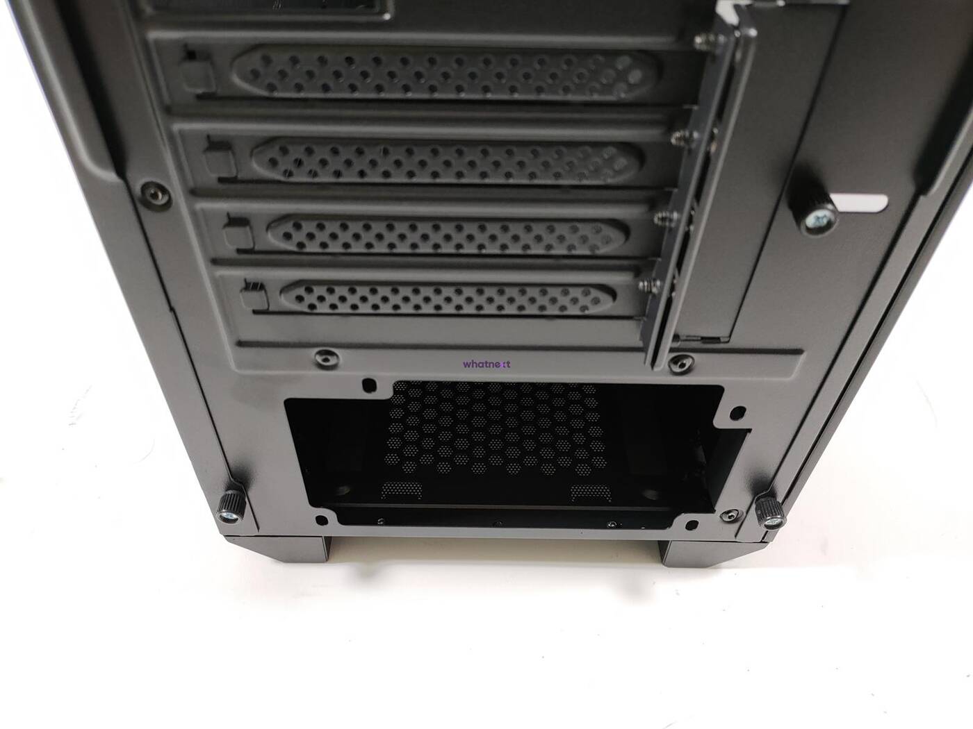 Przejdźmy teraz do wnętrza. Mamy piwnicę, która ma wycięcia na kable oraz na przednią chłodnicę. To co mnie zaskoczyło to ogumowanie większości otworów w obudowie. Szkoda jednak, że nie dotyczy to wszystkich, ale należy docenić producenta za starania – w tej cenie jest to rzadko spotykane.
