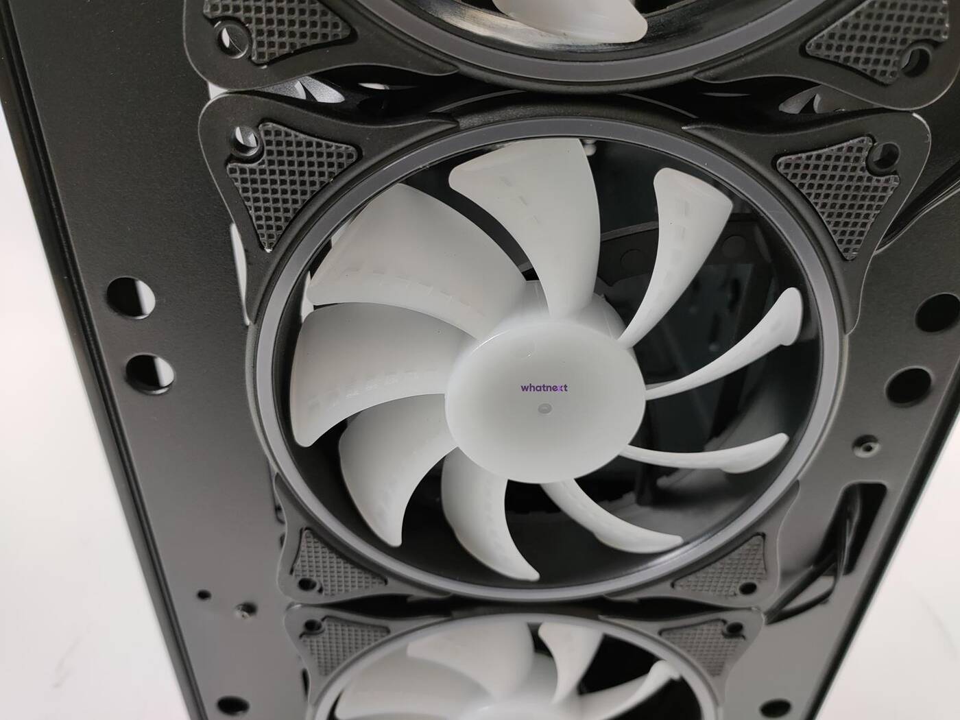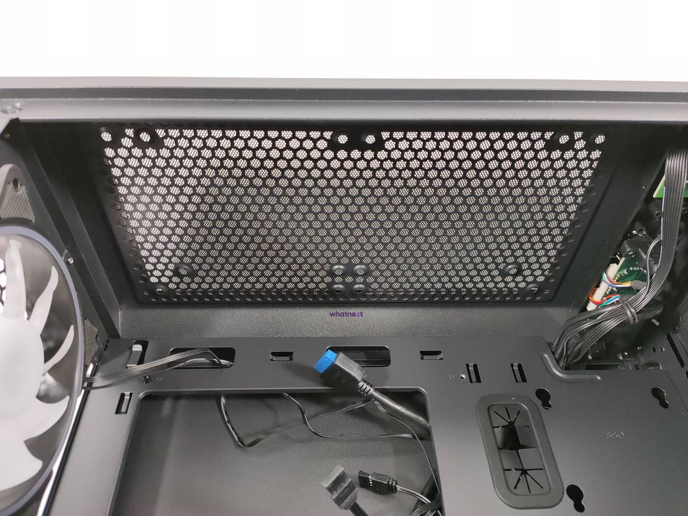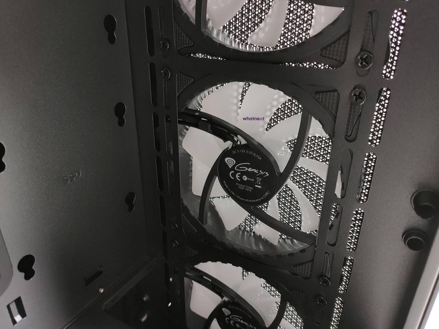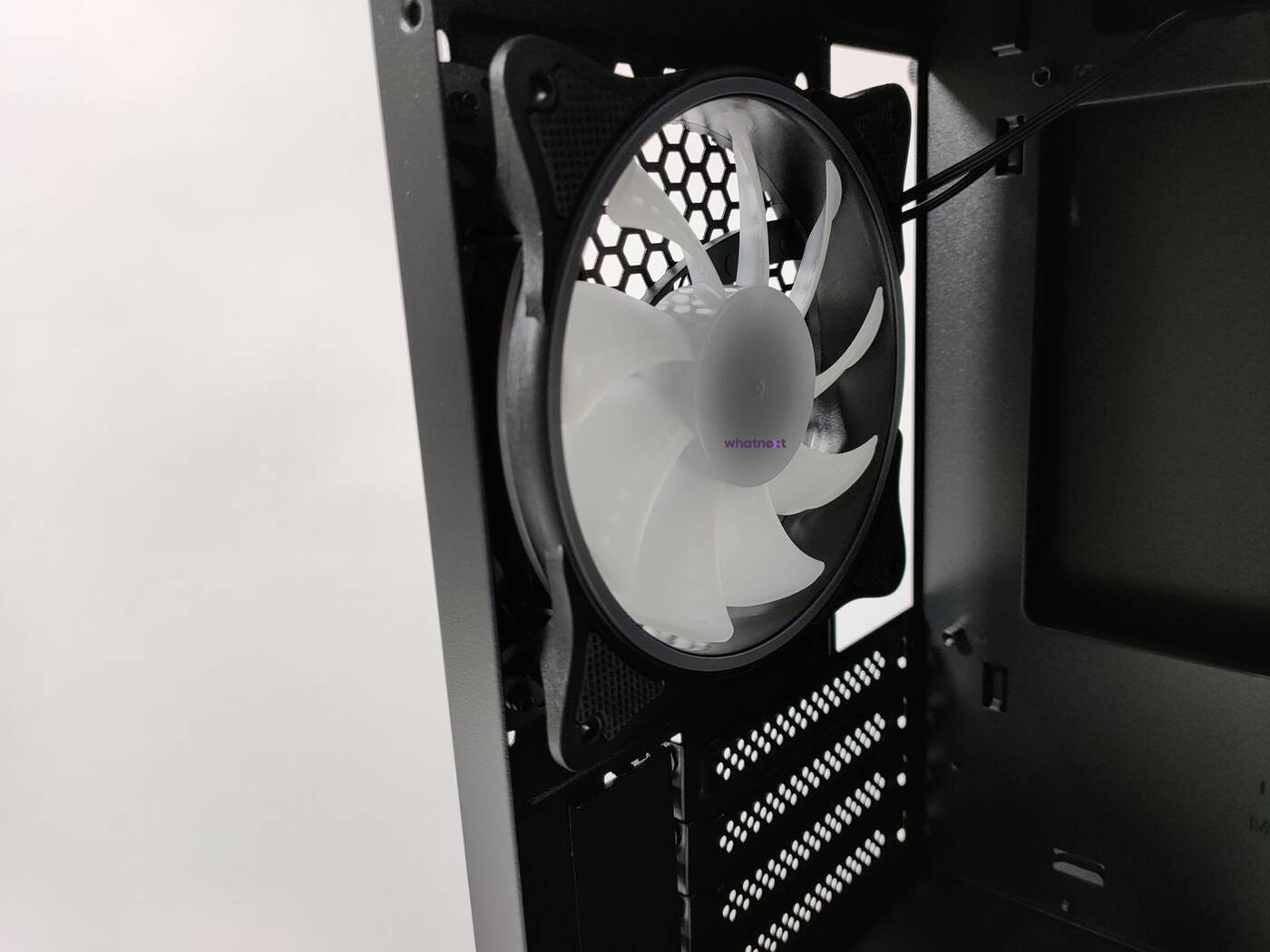 Mimo podświetlanych śmigieł producent postawił na przepływ powietrza. Przedni panel jest z siatki mesh, dzięki czemu wentylatory mają skąd wciągać powietrze. Pod panelem znajduje się filtr przeciwkurzowy, więc całość jest chroniona przed kurzem. Z przodu zamontowane są trzy wentylatory 120 mm. Niestety producent nic więcej o nich nie mówi – nie znam maksymalnej prędkości ani innych parametrów.