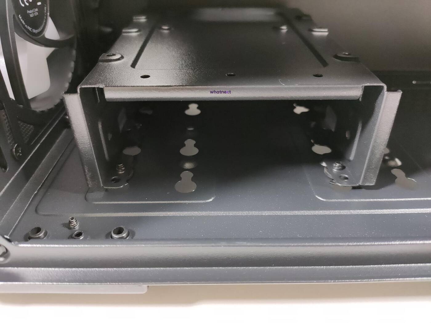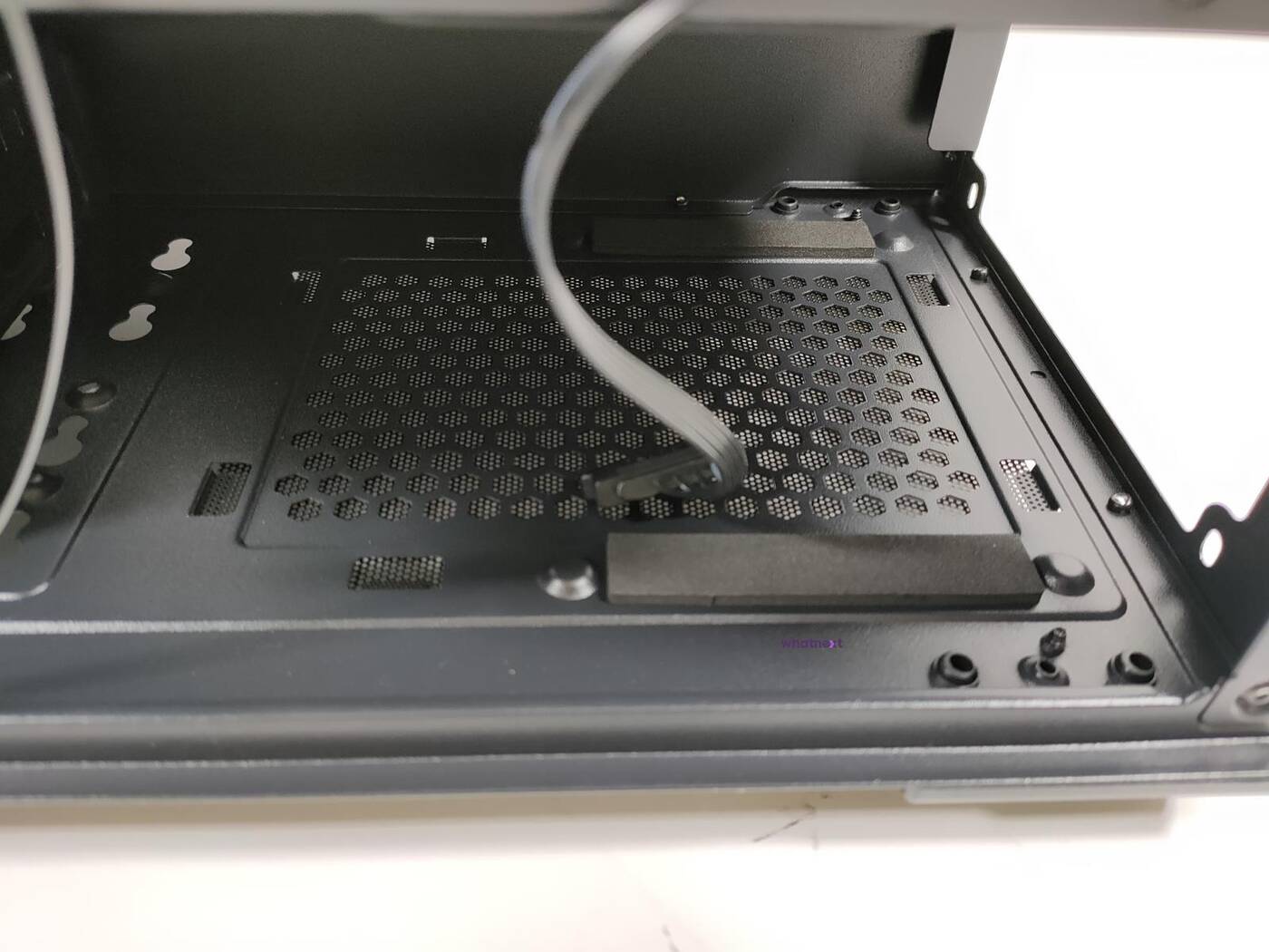 W piwnicy znajduje się miejsce na 190 mm zasilacz. Stawiany jest on na nóżkach z wyłożeniem antywibracyjnym materiałem. Dalej jest koszyk na dwa dyski 3,5 cala lub jeden 2,5 cala. Można zmienić jego położenie albo go zdemontować – nie ma z tym problemów.