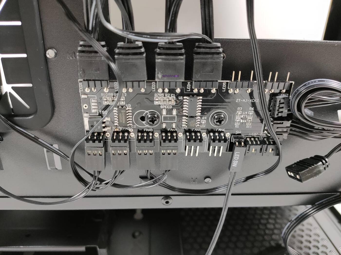 Z tyłu znajduje się też kontroler. Podłączacie go do złącza SATA od zasilacza oraz możecie do złącza ARGB na płycie głównej. Dzięki temu drugiemu będziecie mogli sterować podświetleniem za pomocą oprogramowania a nie przycisku na przodzie obudowy. Do kontrolera możecie podłączyć do 6 wentylatorów 3 pin i do 6 urządzeń ARGB. Jest to z pewnością przydatna rzecz.