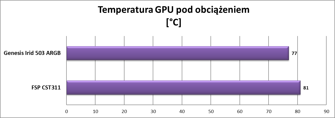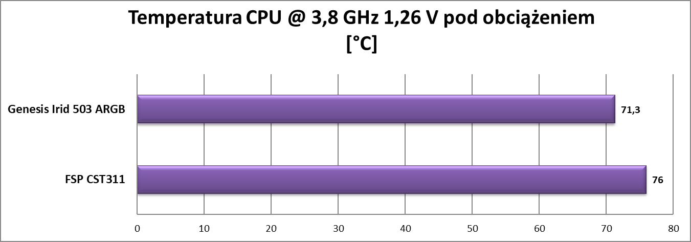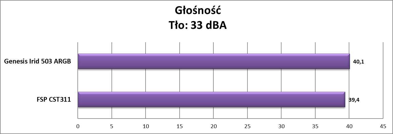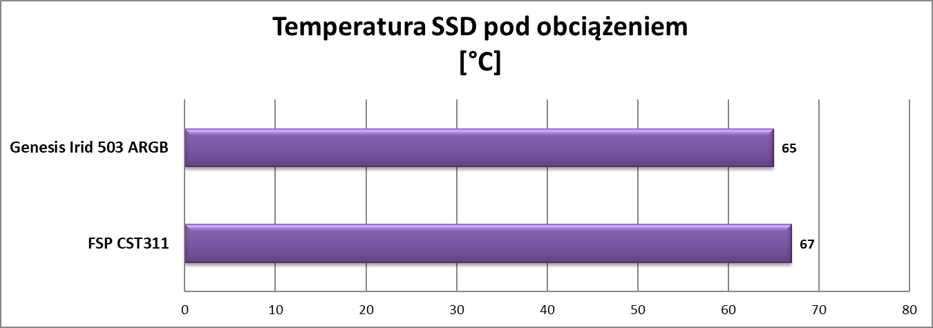 Genesis Irid 503 ARGB wypadł w testach poprawnie. Wentylatory są ciche i na pewno nie będą przeszkadzały, ale przy tym nie zapewniają jakiegoś wybitnego przepływu powietrza. Jest oczywiście chłodniej niż w przypadku konstrukcji od FSP, ale mogłoby być jeszcze lepiej. Natomiast taka konfiguracja spokojnie starczy do średniej klasy podzespołów.