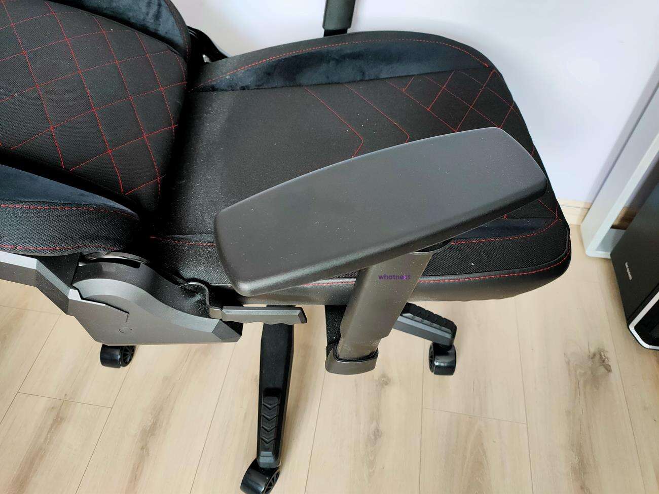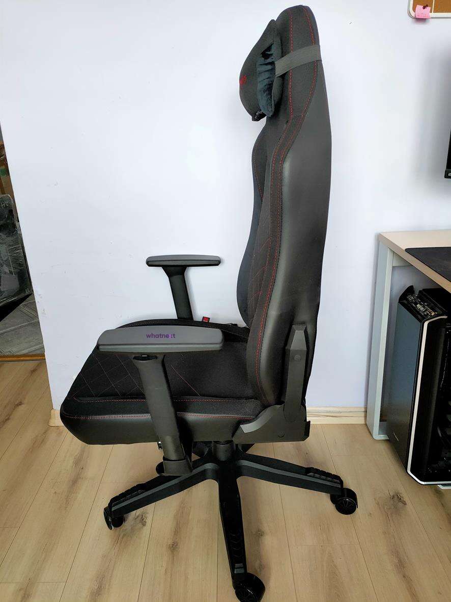 Samo siedzisko i oparcie jest na tyle duże, że spokojnie wygodnie się na nim rozsiądziecie. Pod względem wymiarów jest to idealny fotel przynajmniej dla osoby o mojej budowie. Spokojnie mogłem się na nim rozsiąść i rozkoszować dobrym filmem czy grą. Także poduszka pod kręgosłup szyjny w moim przypadku (182 cm wzrostu) znalazła się na idealnej wielkości. Plusem tutaj jest możliwość regulacji jej położenia, dzięki czemu spełnia ona swoje zadanie. Podłokietniki mogły by być jednak trochę przyjemniejsze. Samo tworzywo sztuczne nie jest może tragiczne, ale na pewno nie jest bardzo wygodne. Minusem jest też na zbyt łatwo przesuwanie ich położenia w poziomie. Przydała by się tu jakaś mocniejsza blokada. Pozytywnie oceniam za to możliwość ich regulacji w pionie. Dzięki temu łatwo dopasujecie ich wysokość do stanowiska pracy.