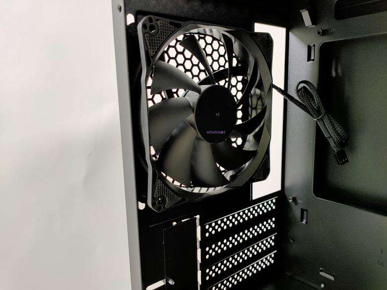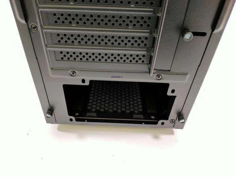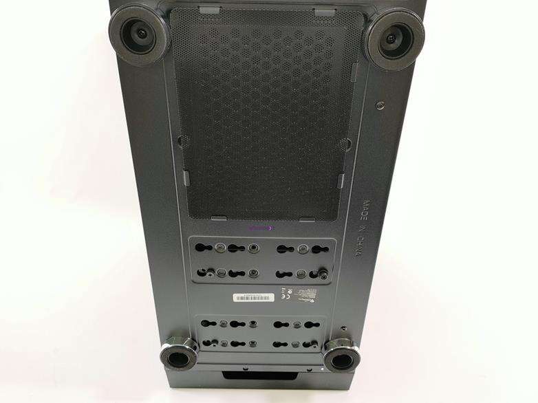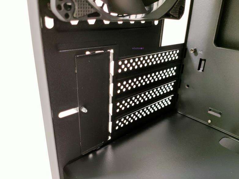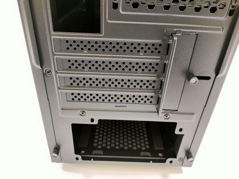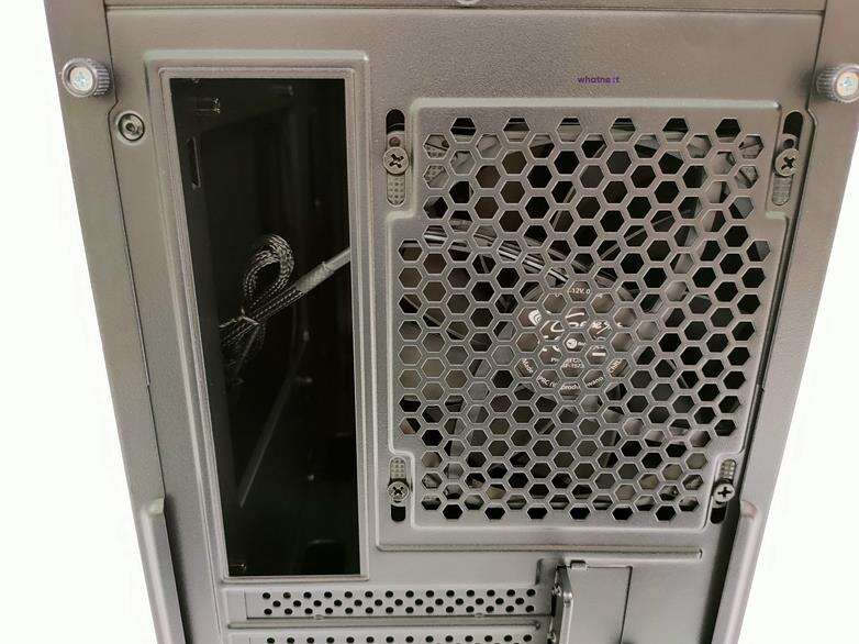 Tył jest bardzo klasyczny. Na samym dole jest miejsce na zasilacz, wyżej 4 zaślepki PCI (wyłamywane), a na górze jest 120 mm wentylator.