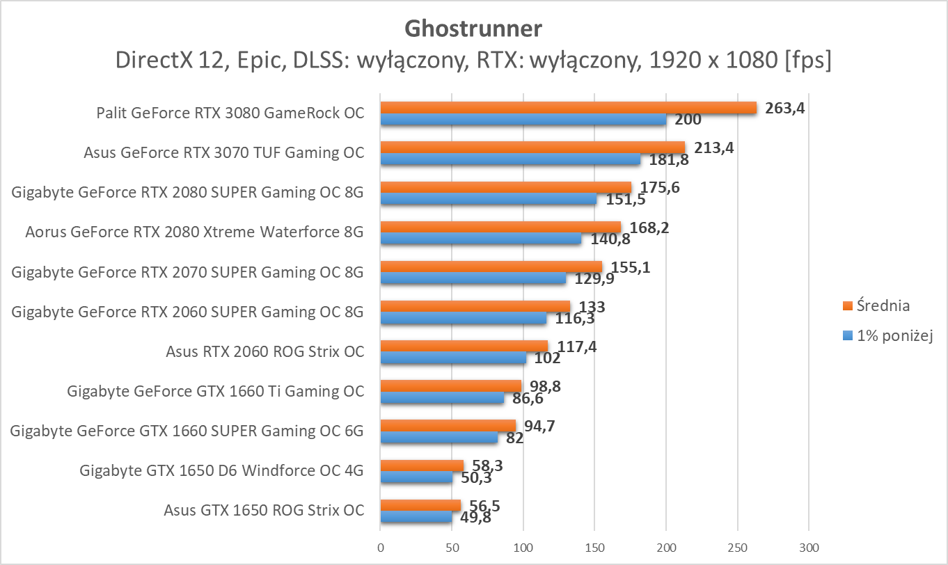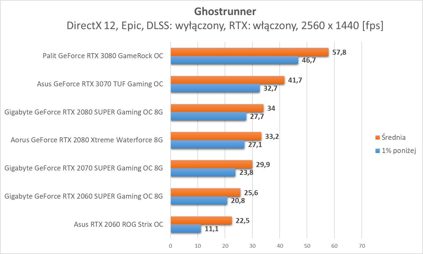 Ghostrunner bez RTX czy DLSS jest bardzo fajnie zoptymalizowany. Wymagania nie są zbyt wysokie, przez co nawet w 1920×1080 px tak naprawdę GTX 1650 zapewnia nawet płynną rozgrywkę. Sytuacja zmienia się po włączeniu ray tracingu. Klatki na sekundę spadają tak mocno, że w 2K żadna z grafik nie osiąga 60 fps, a w 4K żadna nie zapewnia płynnej rozgrywki. Sytuację poprawia DLSS, ale w największej z rozdzielczości żadna z kart nie osiąga 60 fps. Tutaj można mówić o pogromie.