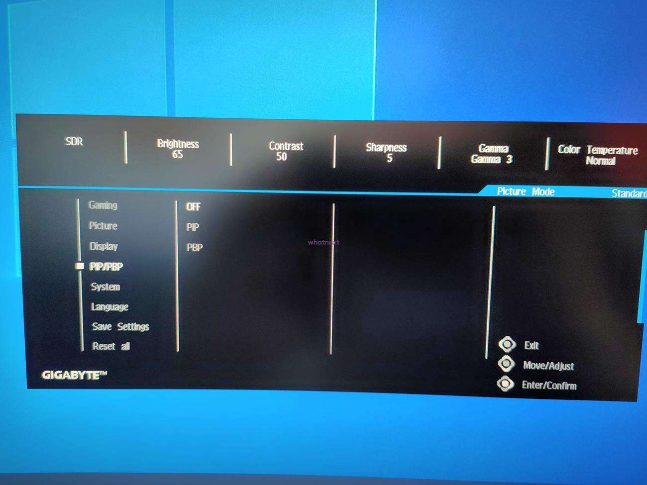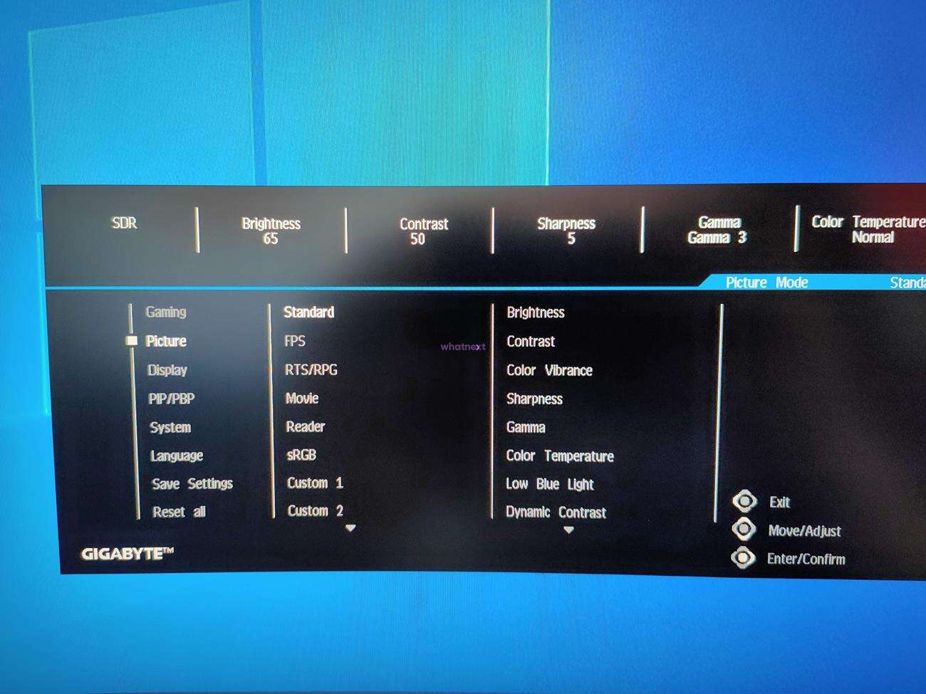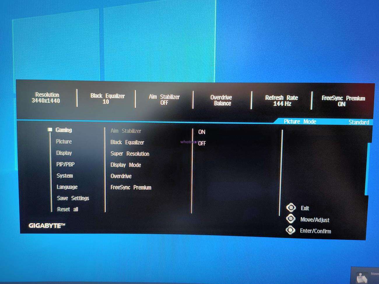W opcjach Gigabyte G34WQC mamy naprawdę sporo rzeczy do ustawienia. Są pomoce dla graczy, takie jak Aim Stabilizer czy Black Equalizer. Możecie też wybierać ustawienia spośród wielu predefiniowanych opcji. Nie zabrakło też możliwości zmiany gammy czy temperatury kolorów. Kolejna ciekawa opcja pozwala na wycięcie określonego spektrum niebieskiego światła, które może negatywnie wpływać na wzrok. Jest też możliwość włączenia opcji PiP czy PbP.