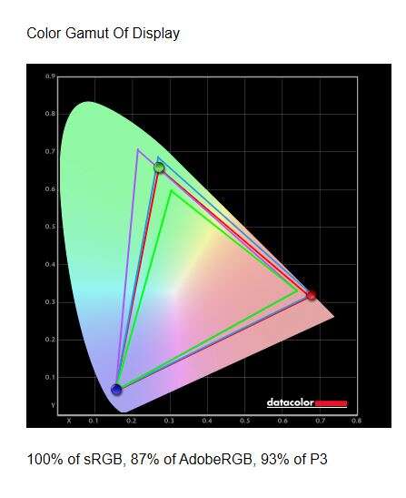 Pokrycie kolorów jest zdecydowanie plusem tej konstrukcji. 100% sRGB, 87% AdobeRGB i 93% P3 to wyniki znakomite. Niestety przy tym wszystkim leży gamma – 1,9 to słaby wynik. Monitor ma natomiast różne opcje gammy do wyboru – wyniki poszczególnych testów są następujące: