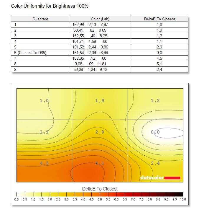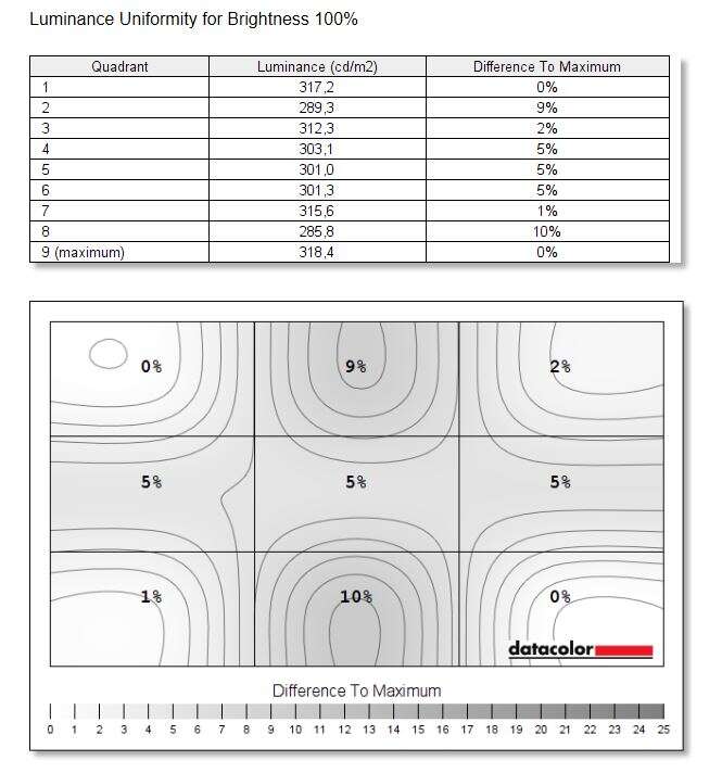 Niejednorodność kolorów jest dobra – nie ma jakiś sporych odstępstw. Z jasnością jest podobnie – maksymalnie 10% różnicy to nie jest jeszcze bardzo zły wynik. Maksymalna jasność jest równa 318,4 cd/m^2.