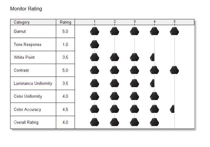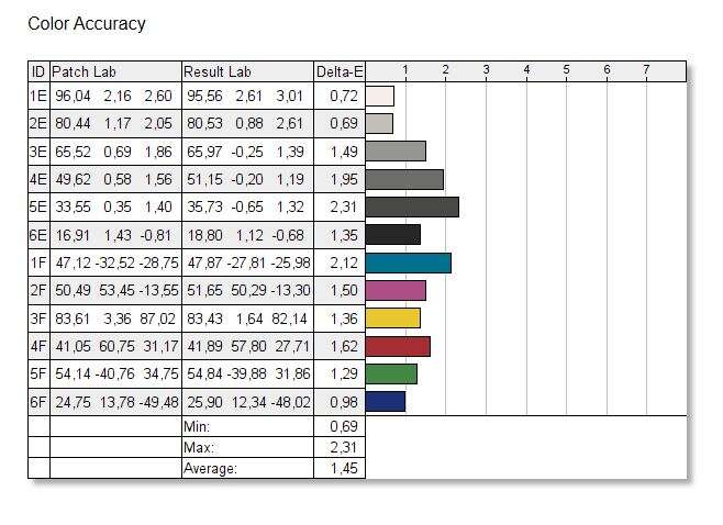 Odwzorowanie kolorów również jest bardzo dobre – średnia Delta-E wynosi 1,45. Podsumowanie pokazuje beznadziejną gammę, ale tak jak napisałem – opcje monitora pozwalają na jej zmianę na idealną. Poza tym plusem jest pokrycie kolorów, kontrast czy odwzorowanie kolorów.