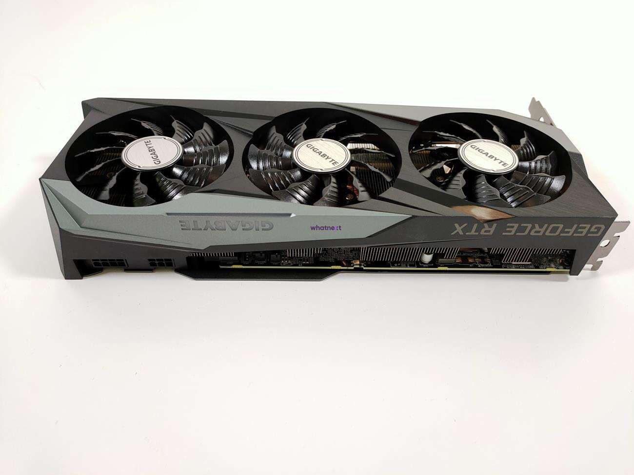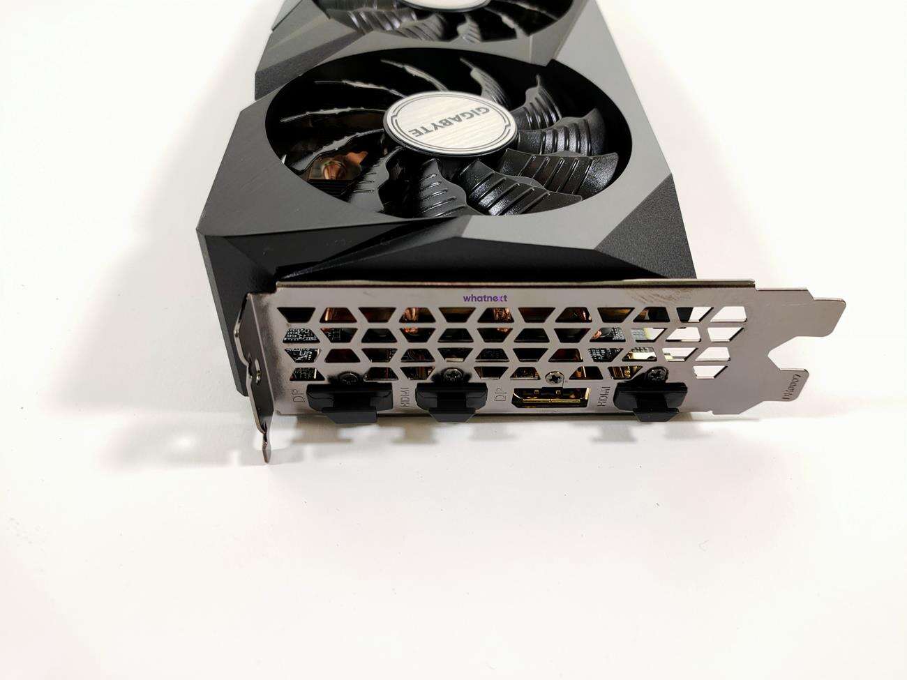 Kolejny plus grafiki to podwójny BIOS – OC i Silent. Oba mają półpasywny tryb pracy, ale w przypadku OC pod obciążeniem będzie zimniej i głośniej, a w Silent odwrotnie. Za chłodzenie odpowiadają trzy wentylatory 80 mm, z których środkowy obraca się w przeciwną stronę niż reszta. Dostępne wyjścia obrazu to 2x DisplayPort 1.4a i 2x HDMI 2.1.