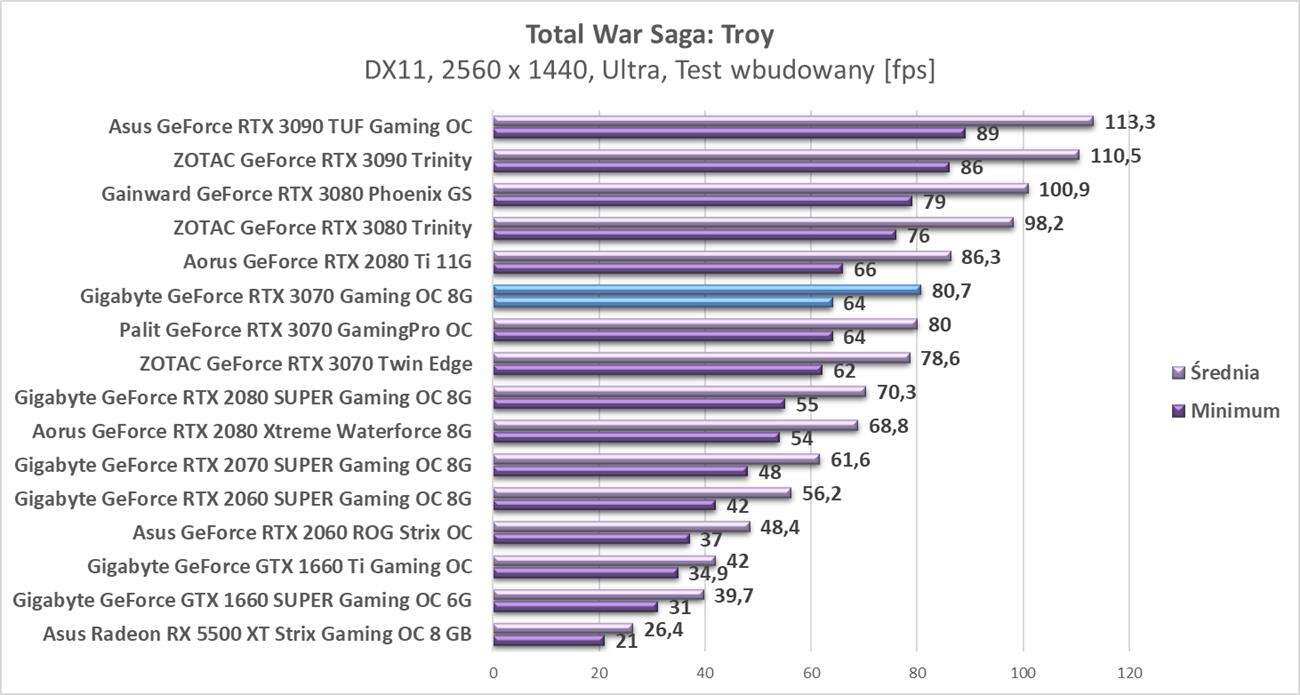 Pierwsza z rozdzielczości oczywiście nie sprawia problemów dla Gigabyte GeForce RTX 3070 Gaming OC 8G. Wyniki są bardzo wysokie, fpsy zawsze sięgają powyżej 60, więc w ciemno możecie odpalać gry na najwyższych detalach.