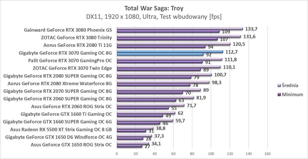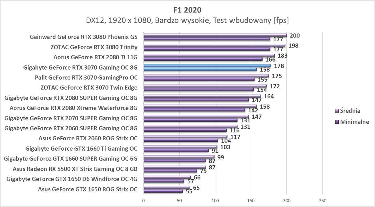 Sumarycznie karta wypada minimalnie słabiej we wszystkich rozdzielczościach od RTX 2080 Ti. Pamiętajcie jednak, że na wykresach jest bardzo mocno podkręcony model od Aorusa, w przypadku słabiej podkręconych RTX 2080 Ti, czy kart bez OC wyniki mogą być naprawdę podobne. Jest też ogromna różnica w wydajności w stosunku do modelu RTX 2070 SUPER – w podobnej cenie postęp jest naprawdę spory. Gigabyte GeForce RTX 3070 Gaming OC 8G jest też wysoko podkręcony, co widać w porównaniu do innych RTX 3070 obecnych na wykresach.