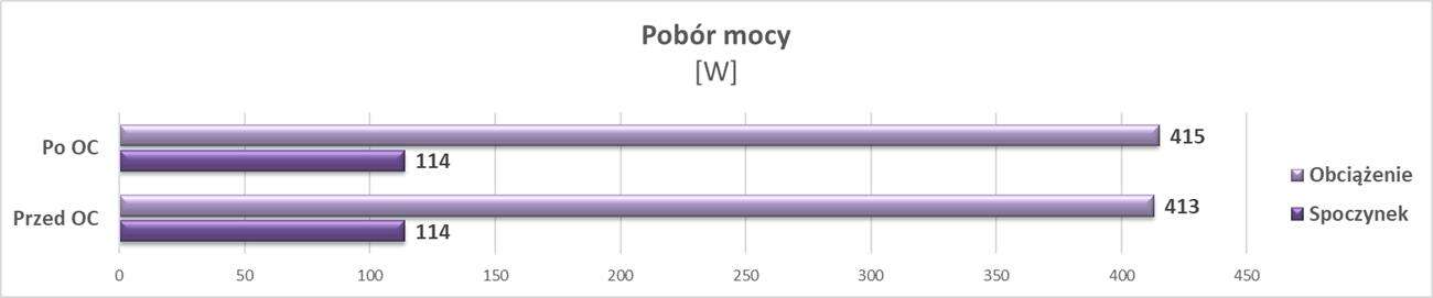 Tak jak wspomniałem grafika ma dwa BIOSy. Przy włączonym OC grafika może być słyszalna, ale temperatura jest trochę niższa. Przy Silent karta jest cicha, a temperatury wcale niewiele wyższe. Polecam więc od razu skorzystanie z tego drugiego BIOSu, chyba, że macie w zamiarze wykonać OC karty. Pobór mocy jest też największy z RTX 3070, jednakże nie ma się co dziwić – karta jest też najmocniej fabrycznie podkręcona.