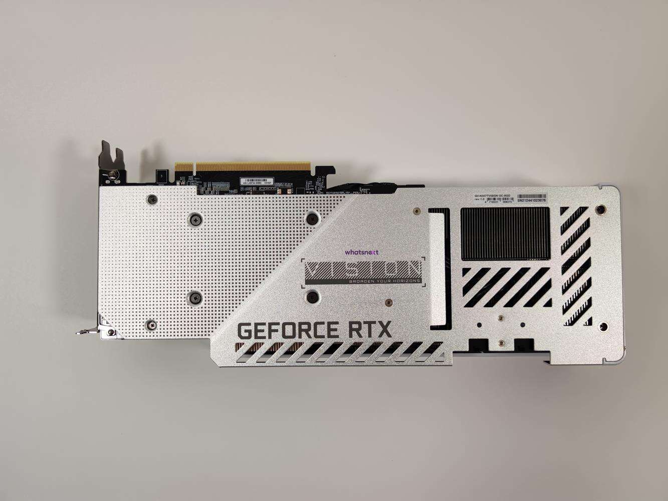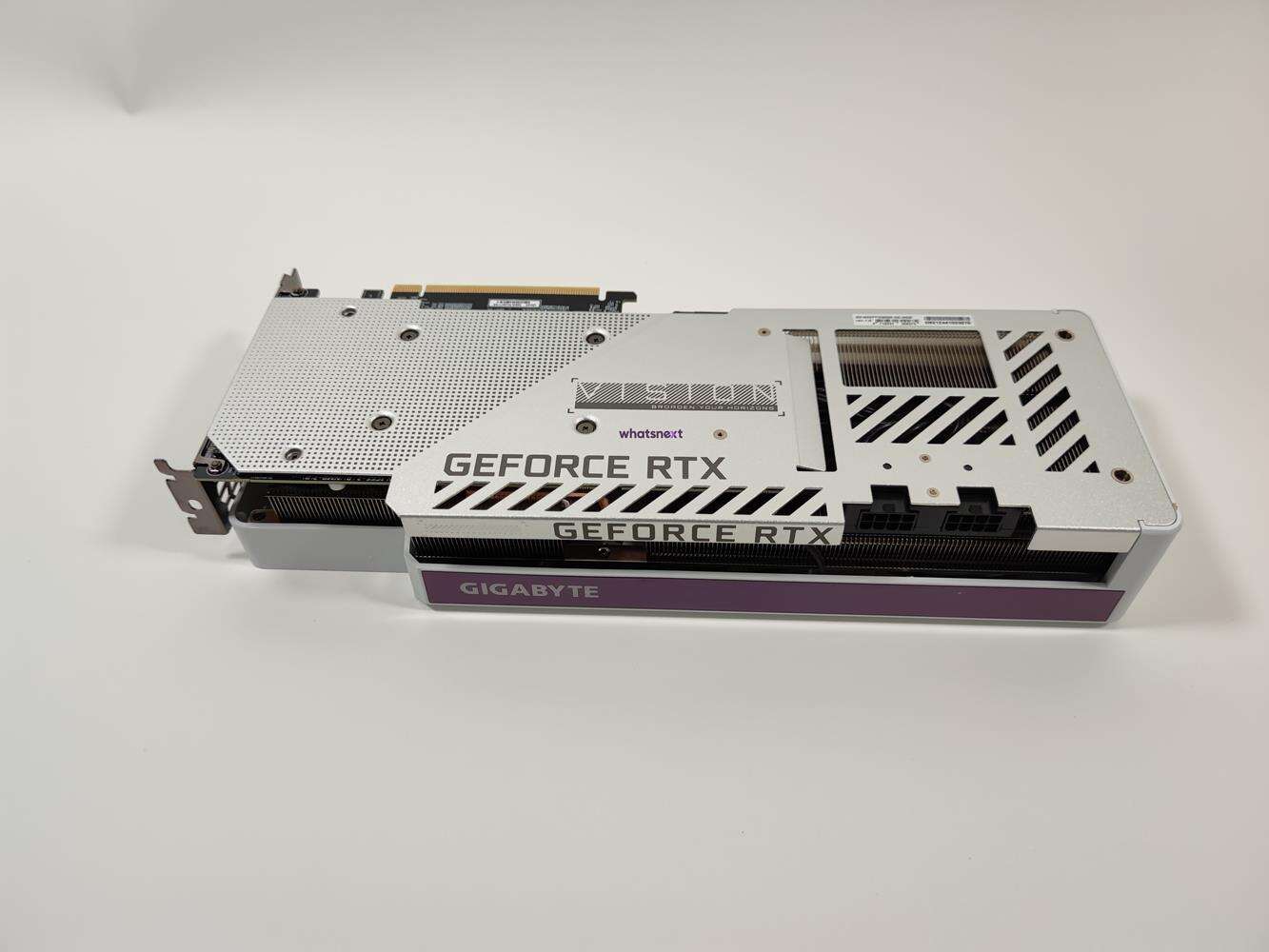 Za chłodzenie odpowiadają dwa większe i jeden mniejszy wentylator. Oczywiście nie zabrakło tutaj trybu półpasywnego. Dokładne wymiary karty to 320 x 126 x 55 mm, czyli są one identyczne jak we wcześniej testowanym modelu RTX 3080 Ti. Gigabyte GeForce RTX 3070 Ti Vision OC zasilany jest z dwóch złączy 8 pin umieszczonych na końcu karty. Sugerowany zasilacz powinien mieć 750 W mocy. Złącza obrazu to 2x HDMI 2.1 oraz 2x DisplayPort 1.4a.