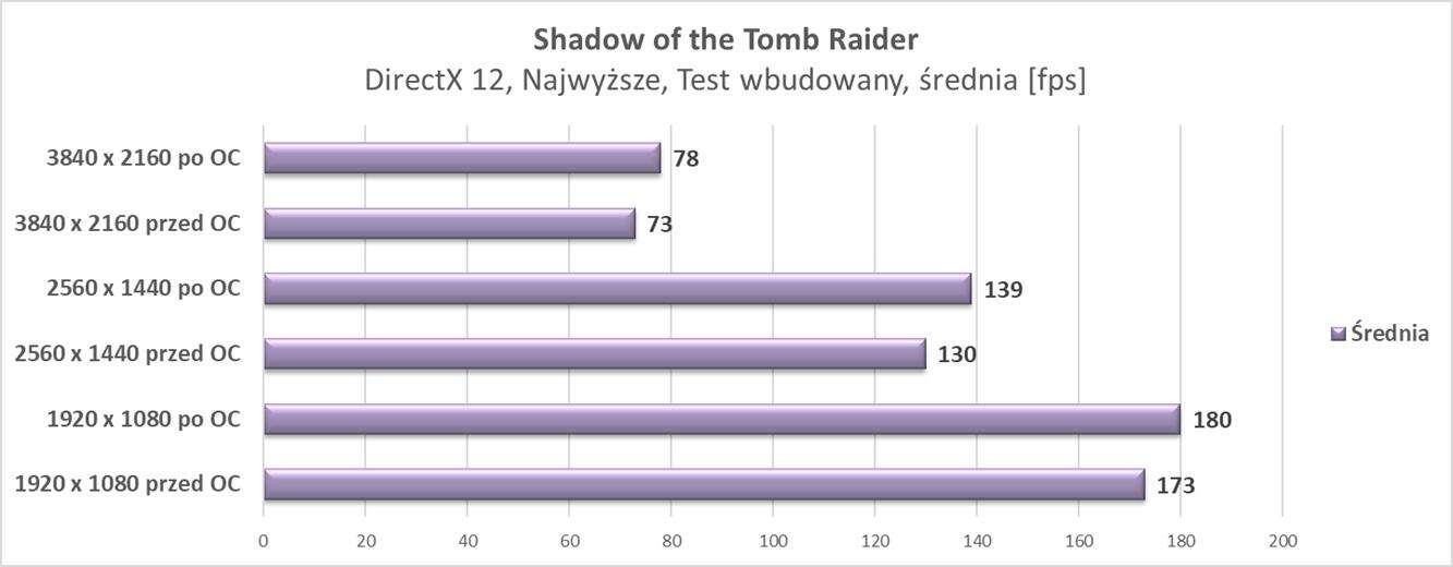 W kolejnej rozdzielczości ponownie możecie spokojnie liczyć na średnio 60 fps w każdym z tytułów. Wyniki znowu są podobne do konkurencyjnego modelu ZOTACa, więc nie ma żadnego zaskoczenia.